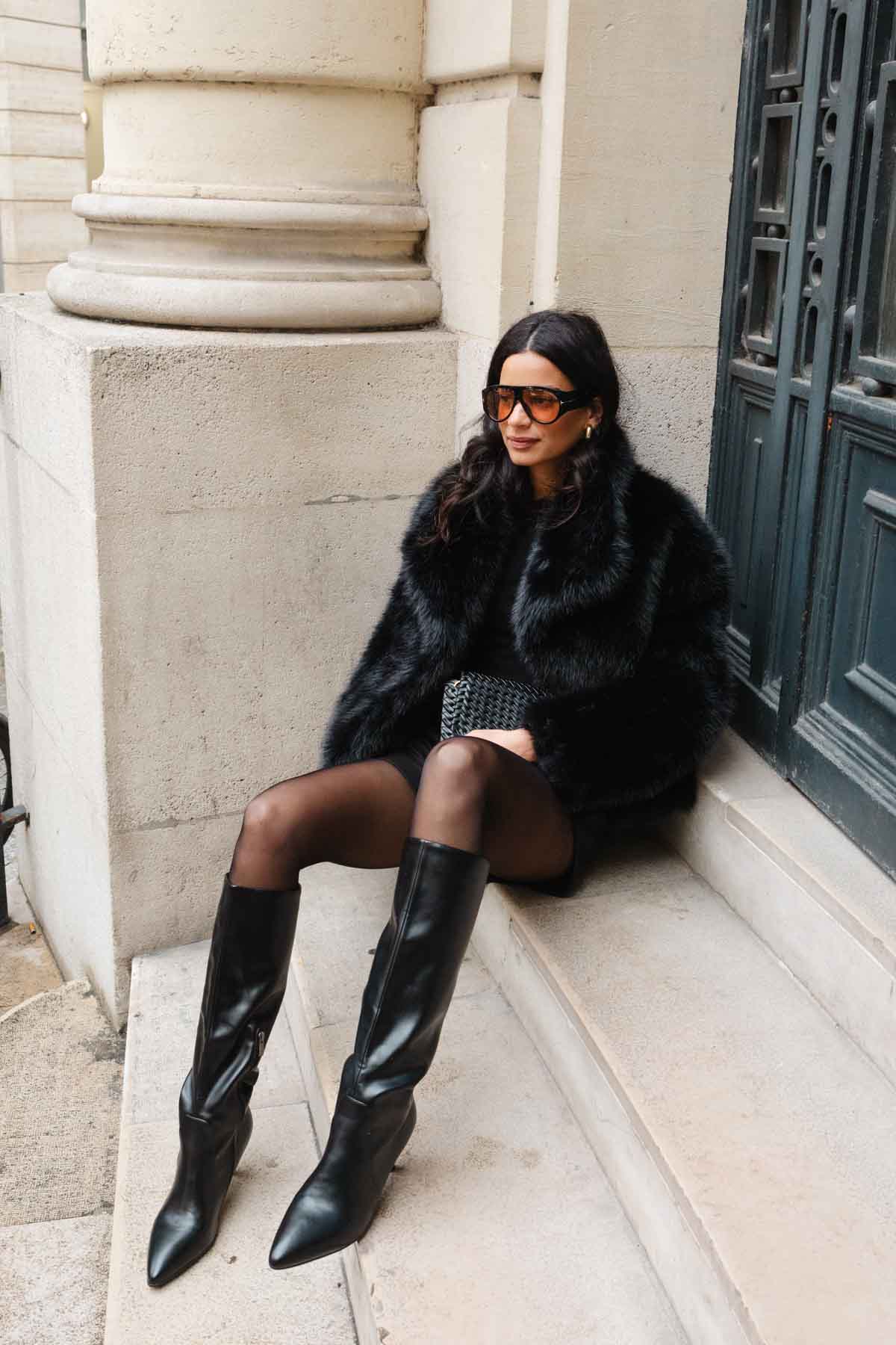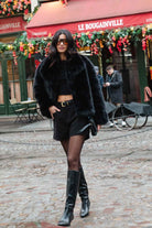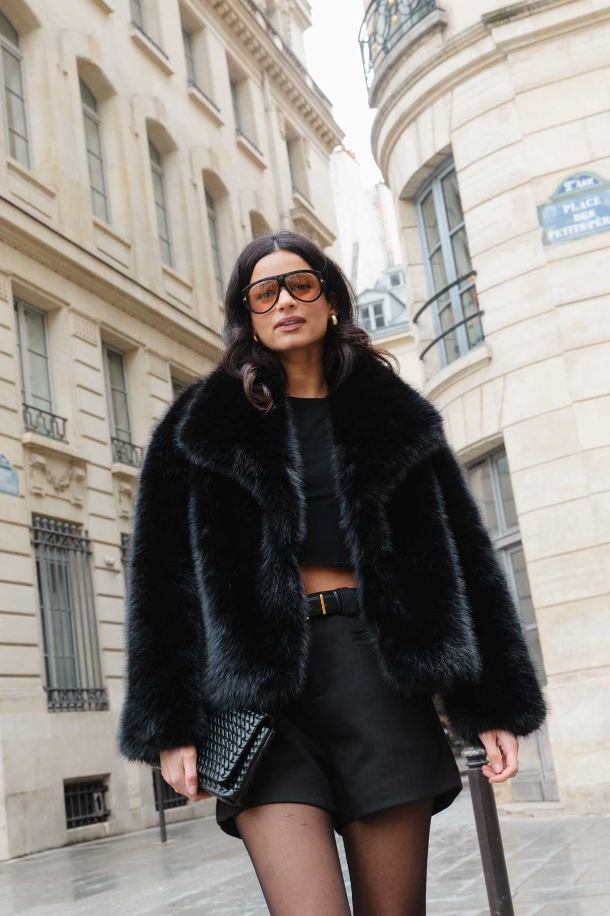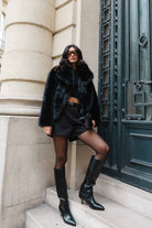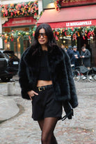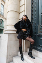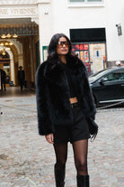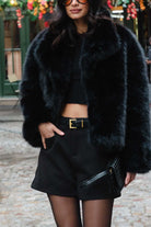 מעיל פרווה מלאכותית איכותית במראה יוקרתי וקלאסי, בשילוב כפתור לסגירה.