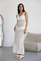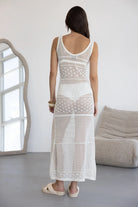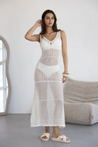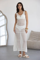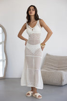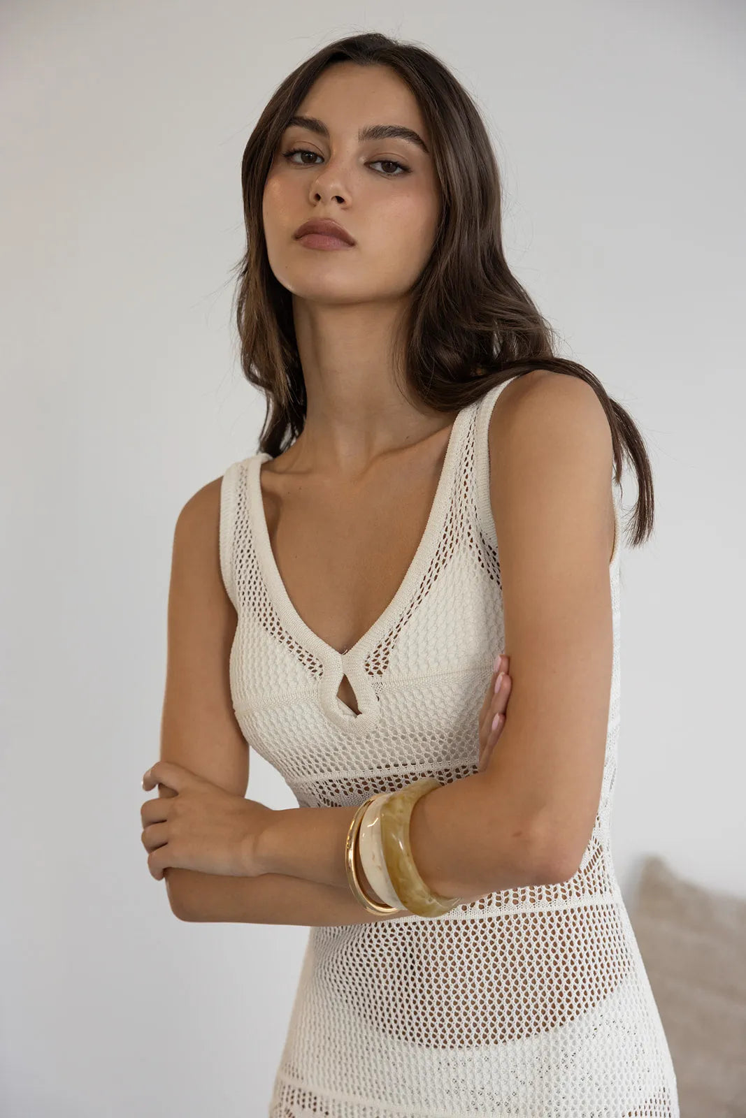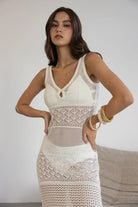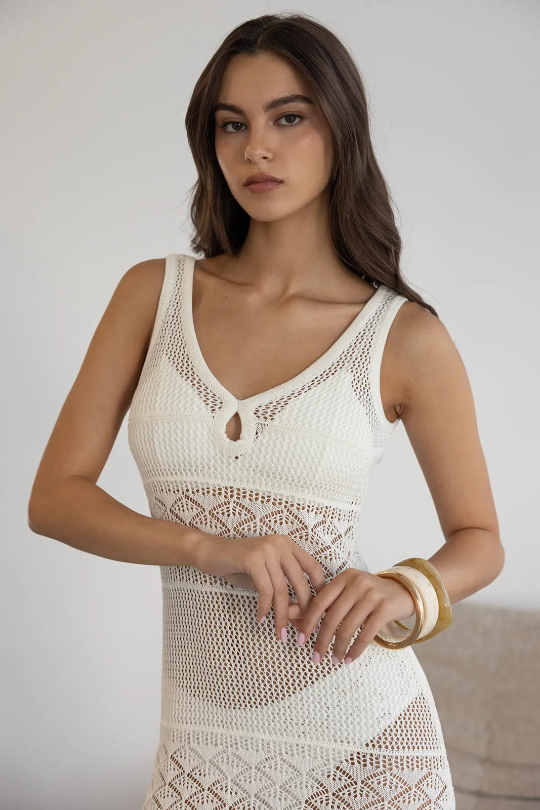 שמלת חוף מידי קלילה מבד סריג קרושה עם דוגמאות גאומטריות ושקיפות עדינה. גזרה מחמיאה עם כתפיות ומפתח וי עדין.