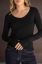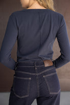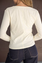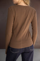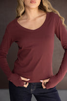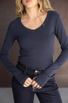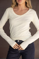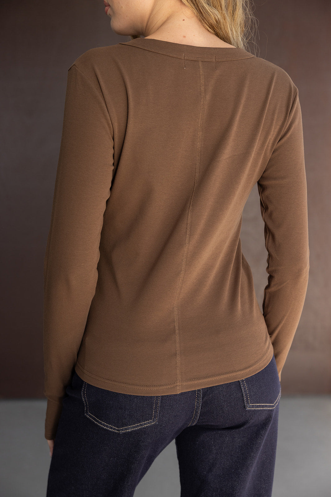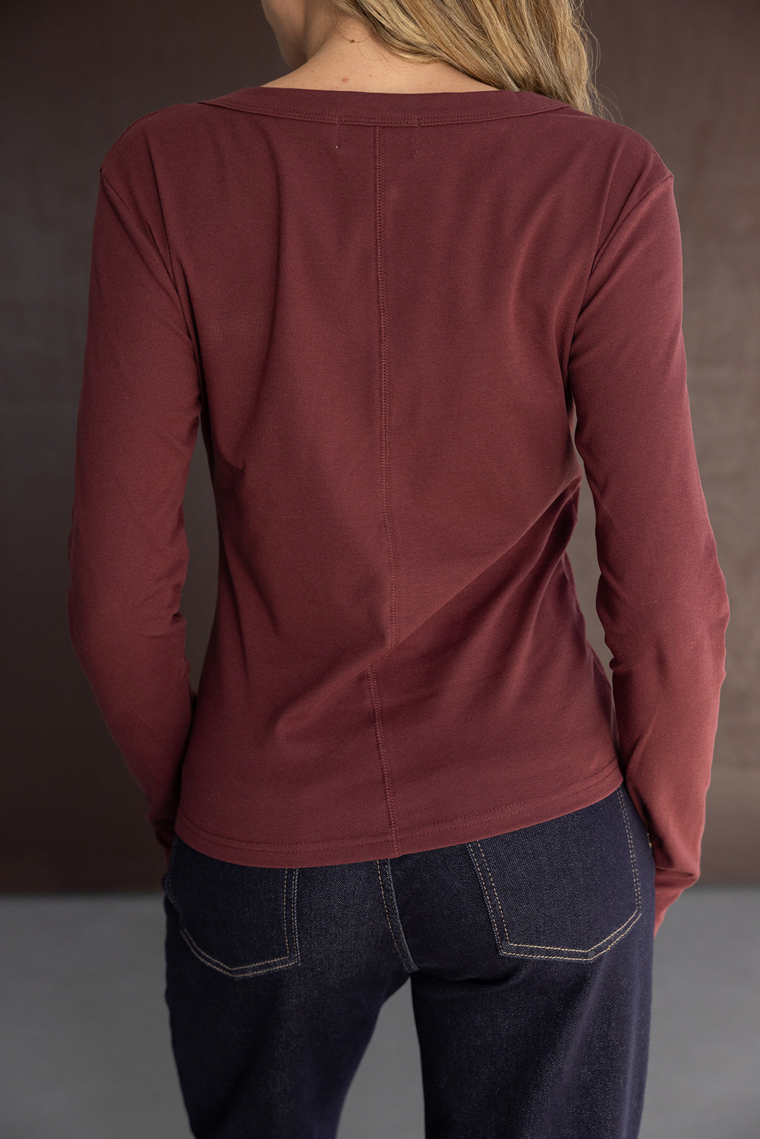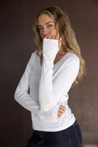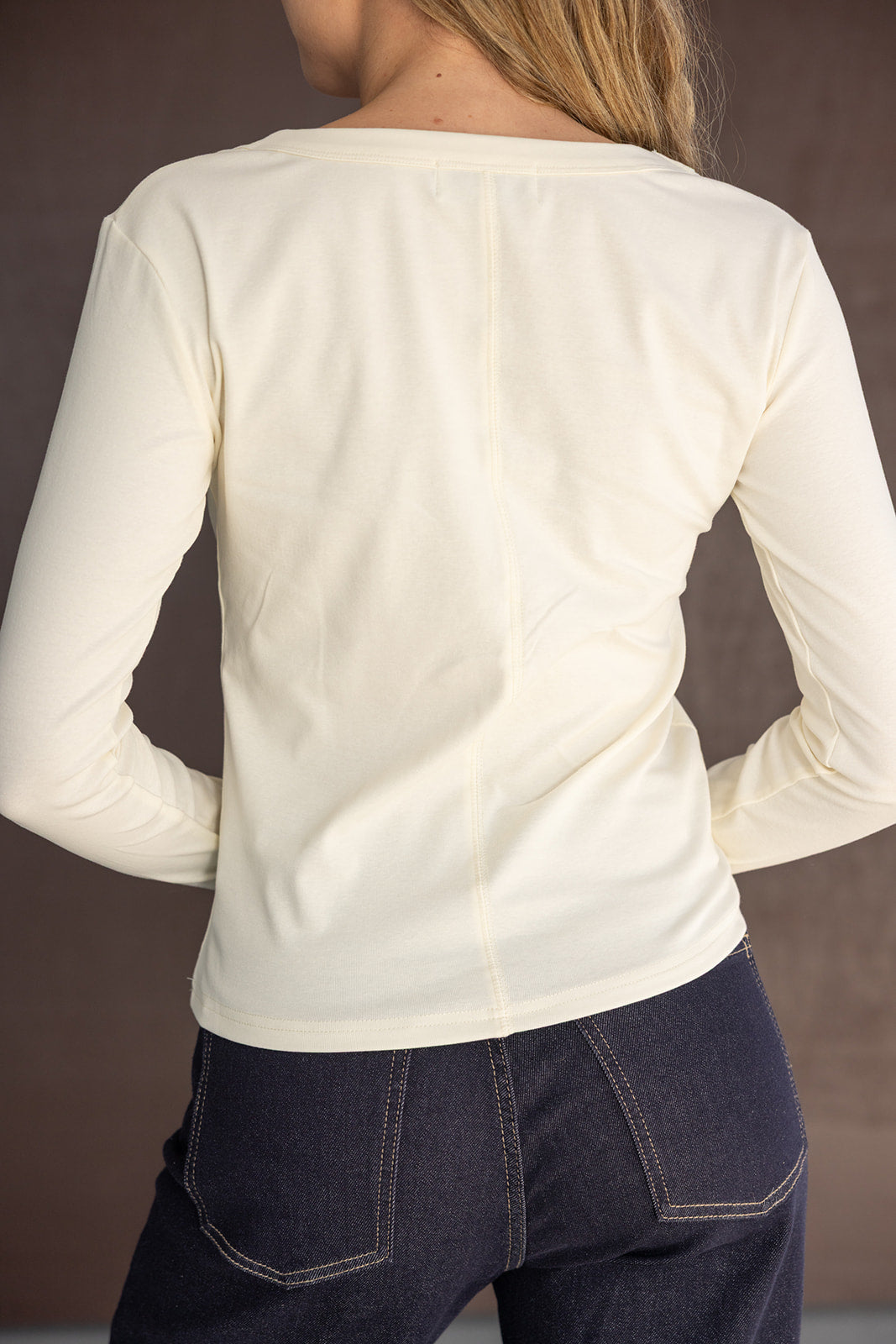 חולצת בייסיק מבד איכותי ובגזרה מעט משוחררת, בשילוב צווארון וי קלאסי וחור בשרוולים לכפפה