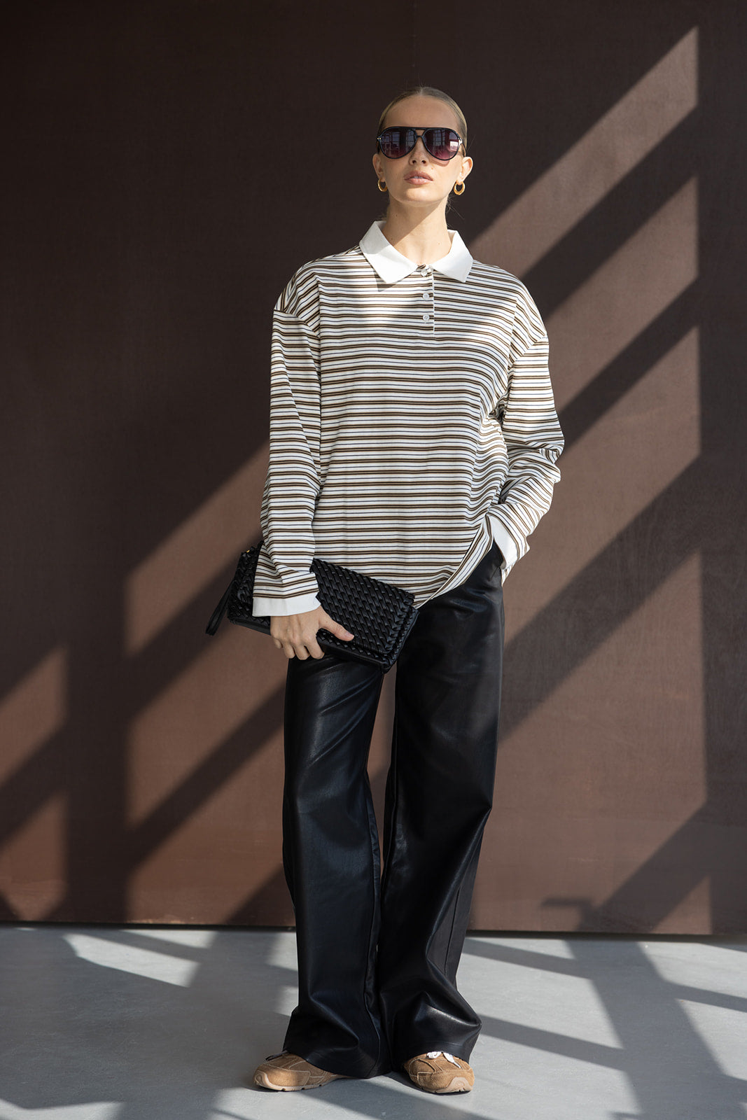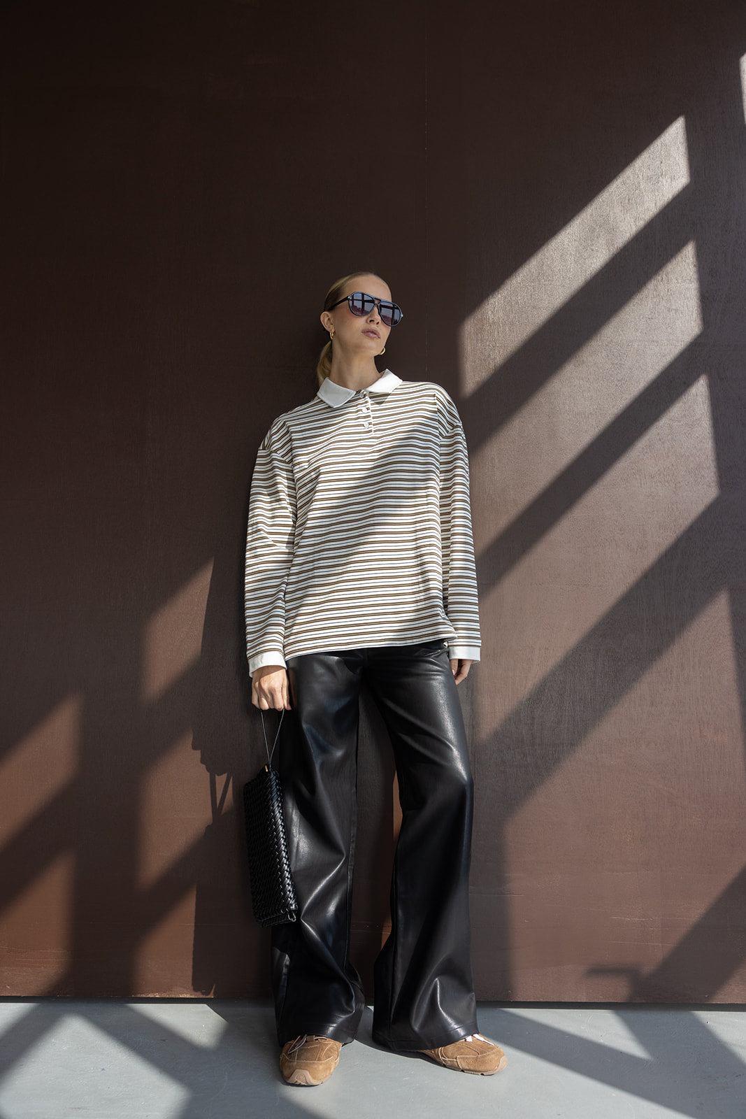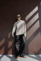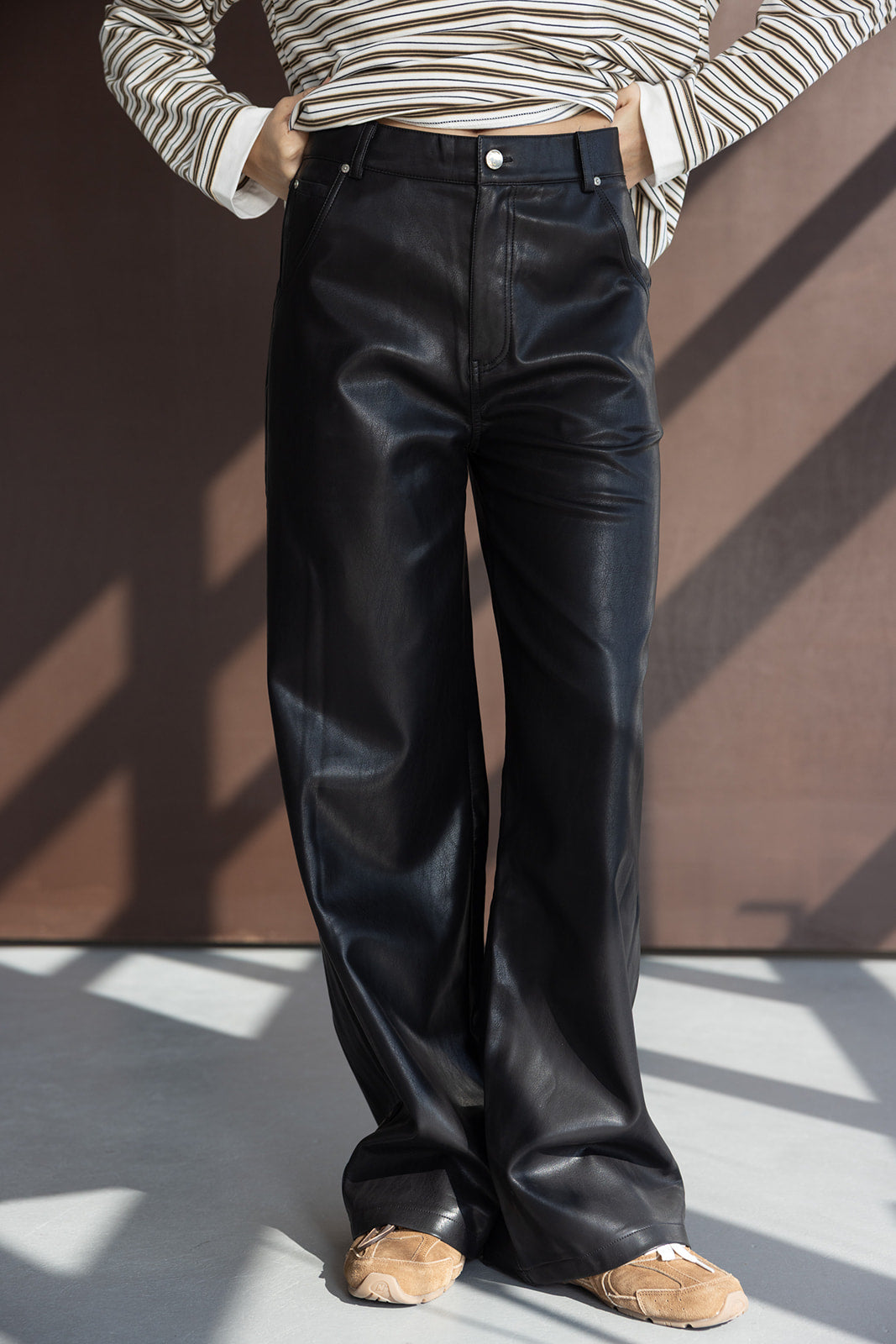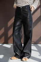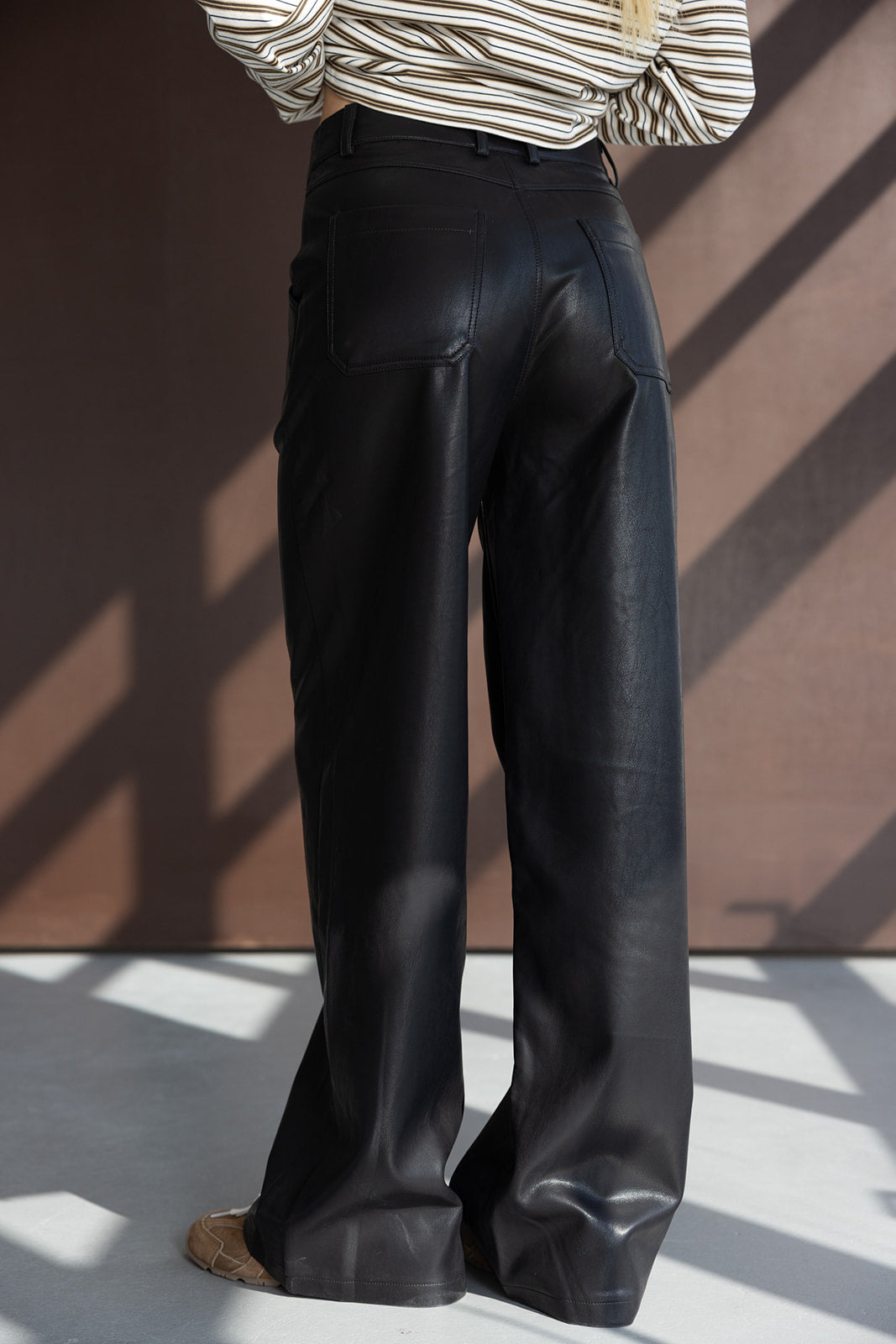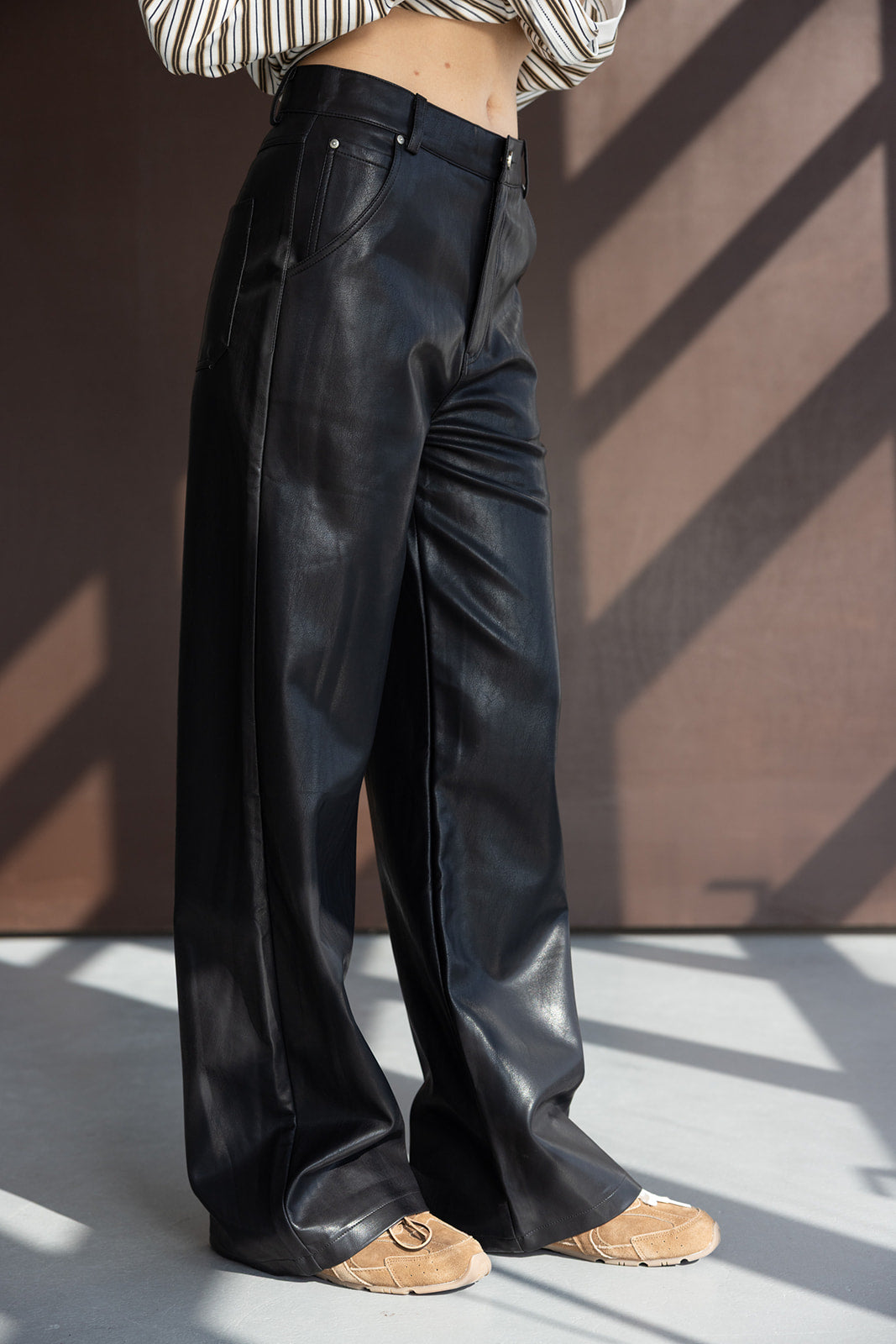 מכנס דמוי עור במראה החם של העונה ובגזרה ישרה קלאסית ומחמיאה. בשילוב זוג כיסים קדמיים וזוג כיסים אחוריים.
