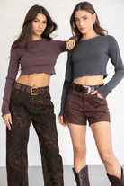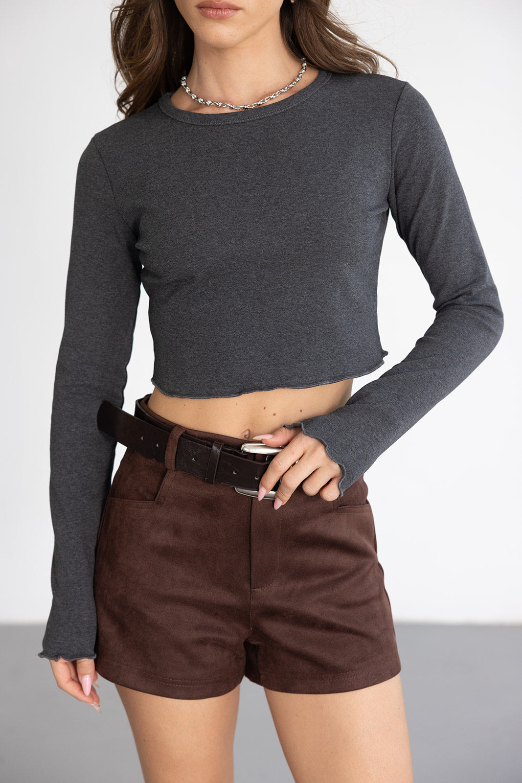 חולצת בייסיק בגזרת קרופ מחמיאה ביותר, בשילוב שרוול ארוך המתאים לעונה וסיומת מלמלה עדינה טרנדית.