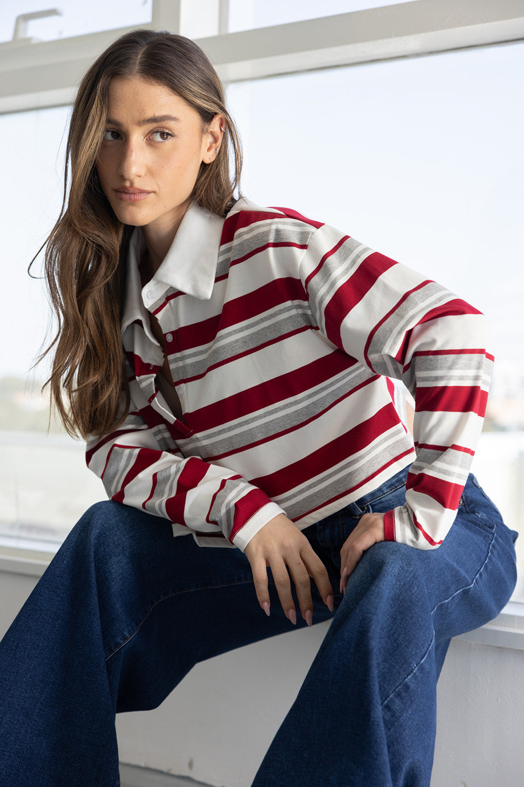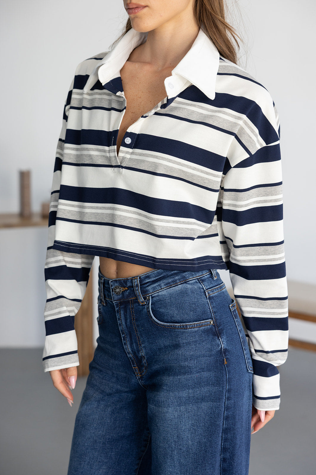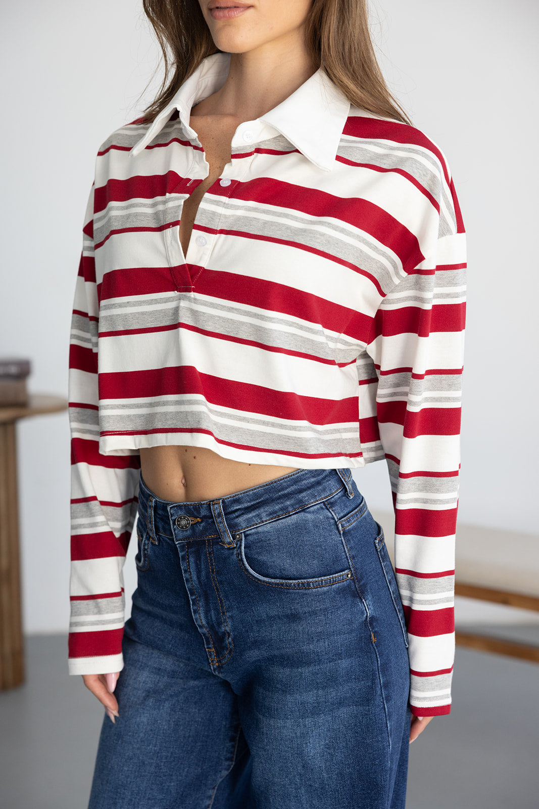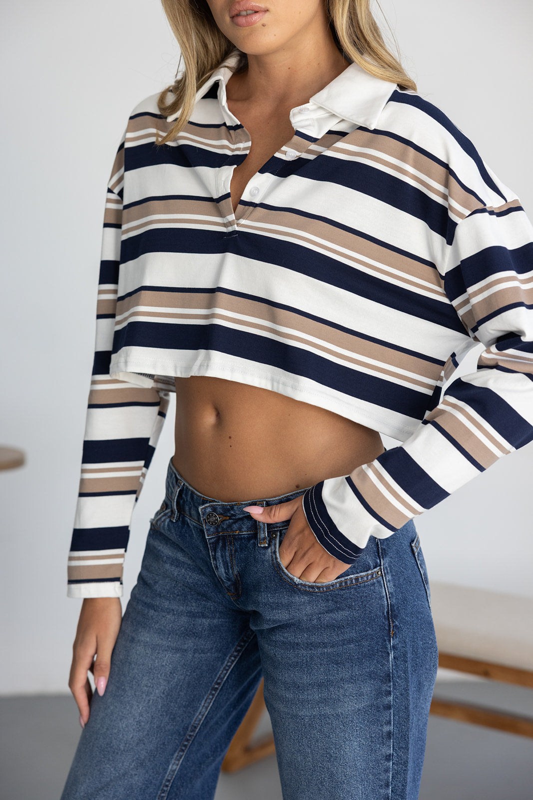 חולצת פולו בגזרת קרופ מחמיאה, בשילוב הדפס פסים טרנדי לרוחב החולצה.