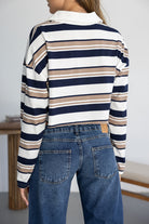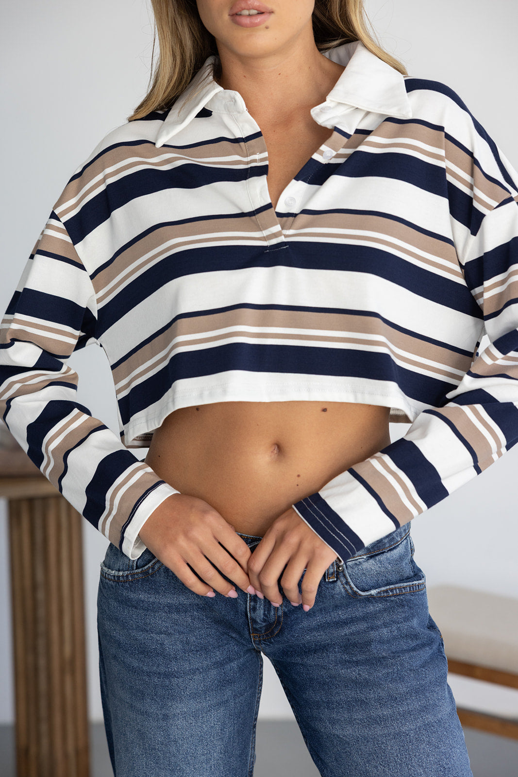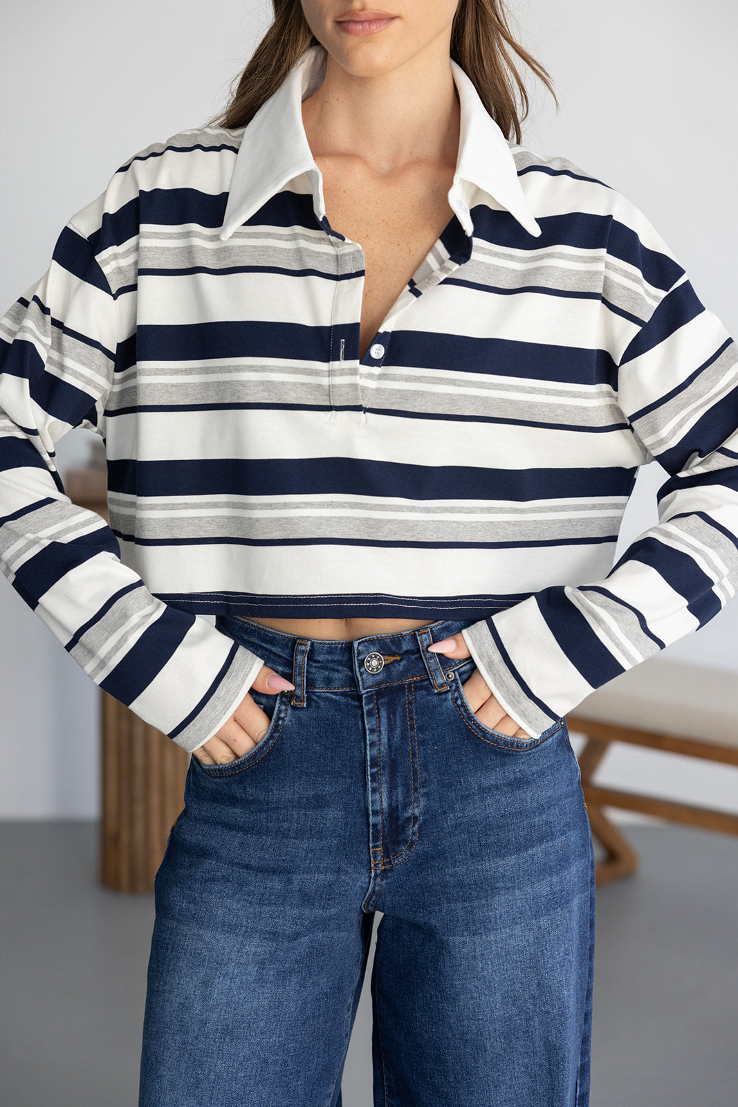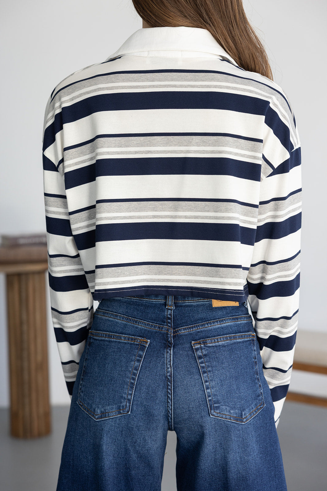 חולצת פולו בגזרת קרופ מחמיאה, בשילוב הדפס פסים טרנדי לרוחב החולצה.