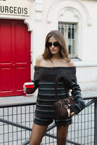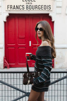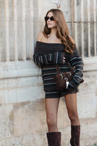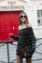 חליפת סריג מבד נעים ומחמם. סוודר עם כתפיים חשופות במראה הטרנדי של העונה, ומכנס שורט מדוייק. בשילוב דוגמת פסים לרוחב.