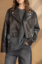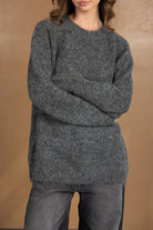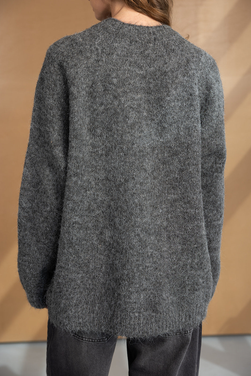 סריג אוברסייז בגזרה משוחררת, עשוי בד פלפי ורך במיוחד. מגיע עם צווארון עגול ושרוולים ארוכים.