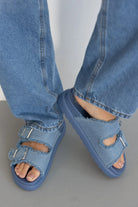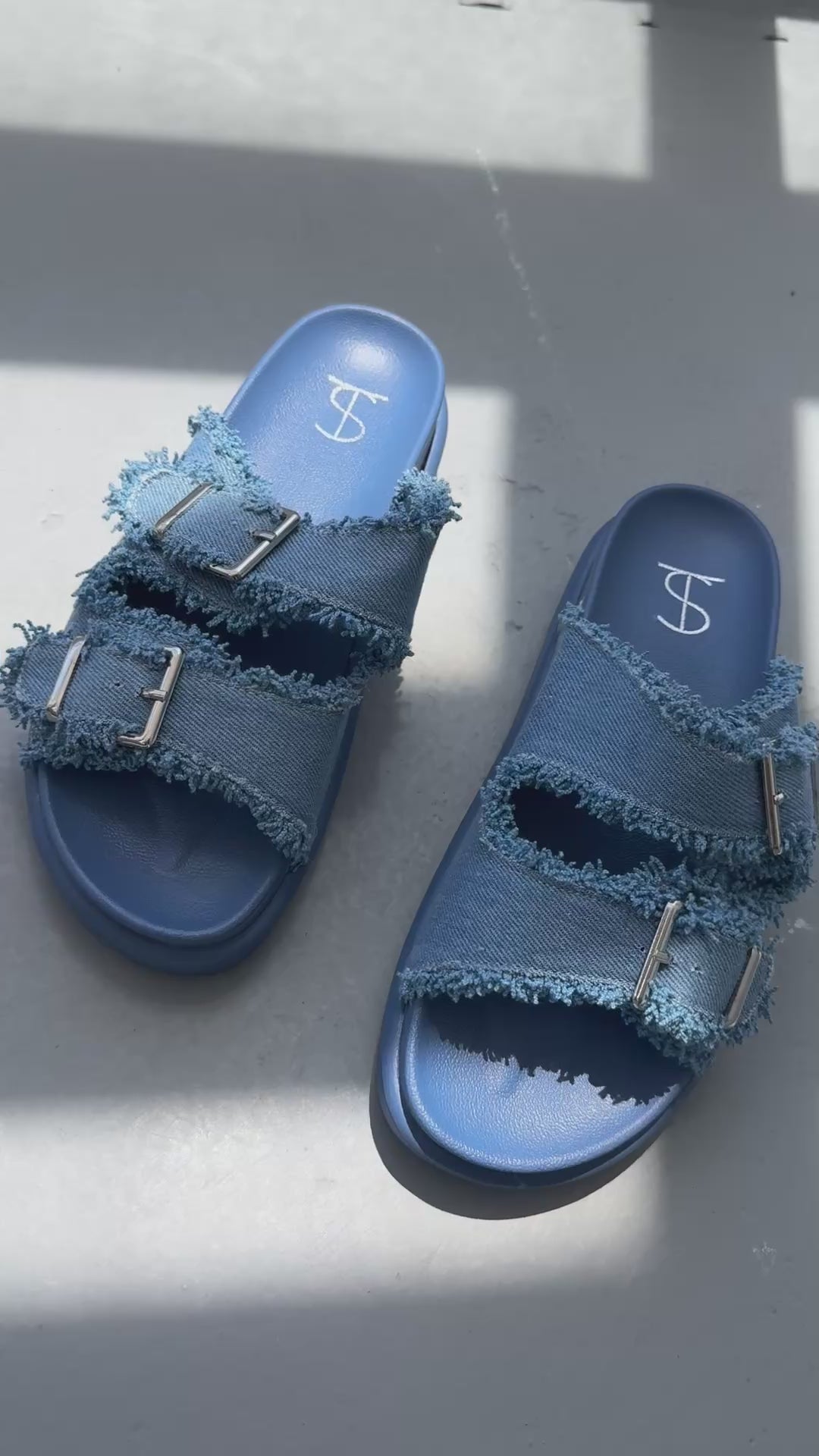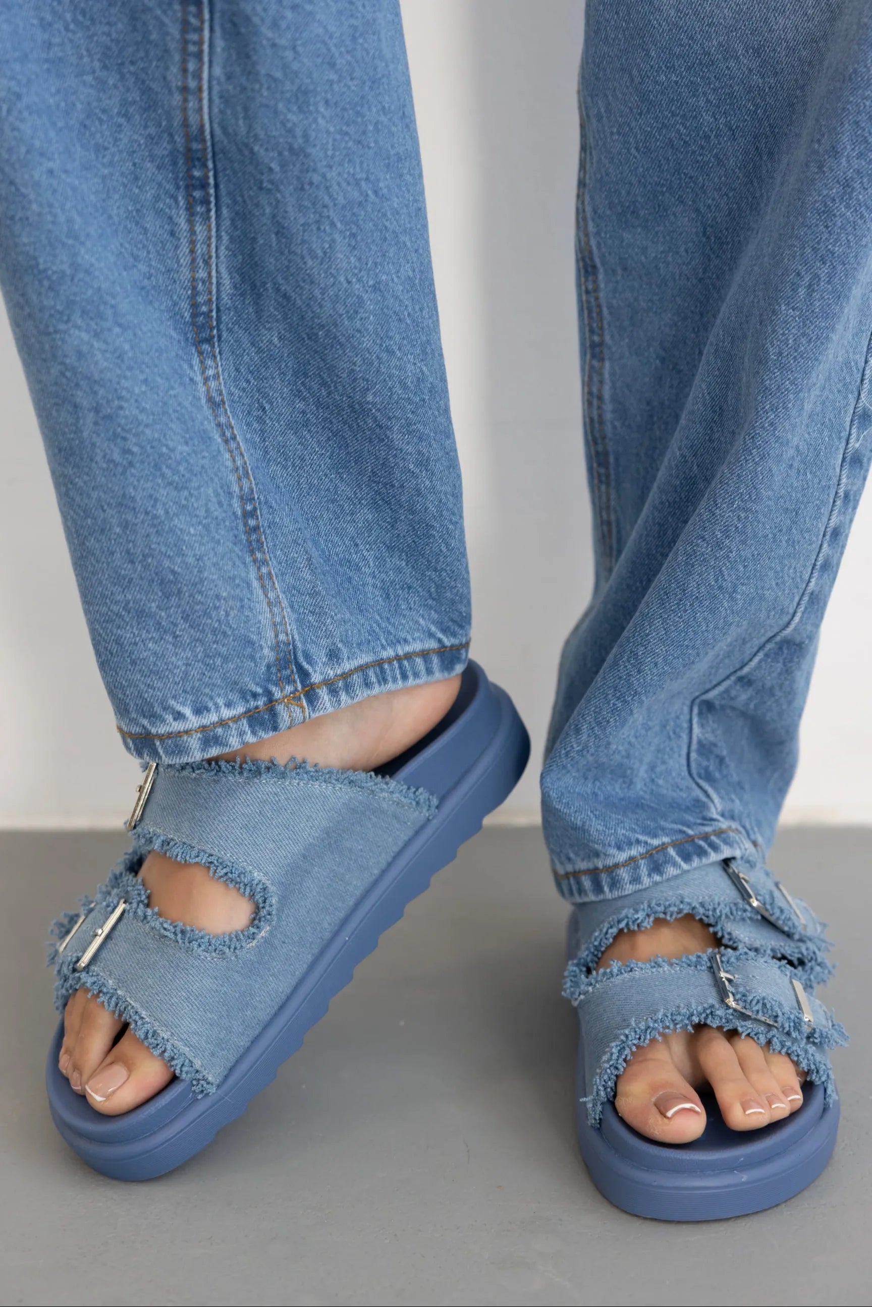 כפכף בד ג׳ינס בצבע כחול, בשילוב שתי רצועות ואבזמים בצבע כסף להידוק.