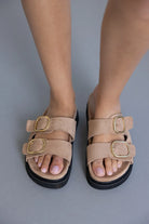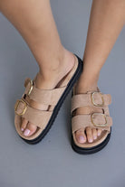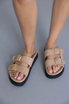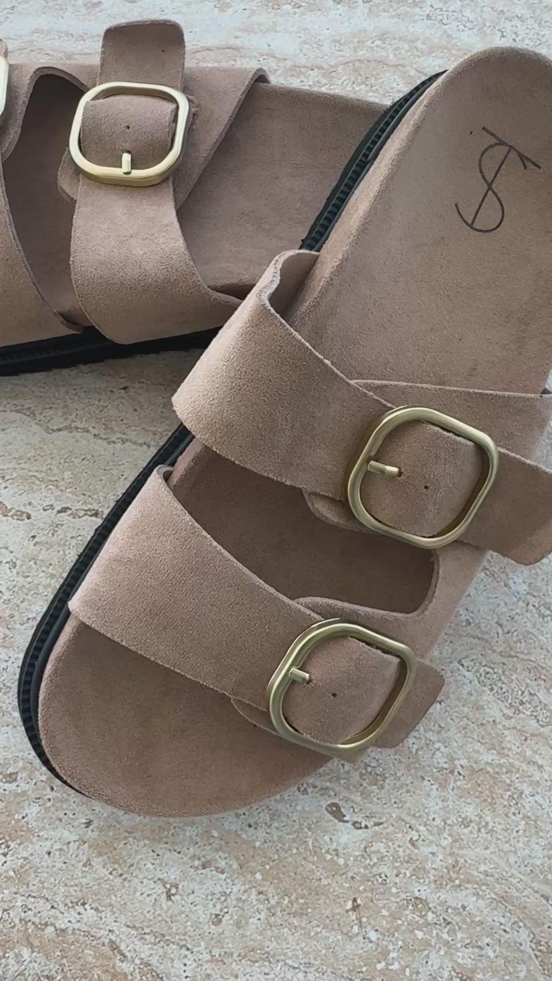 כפכף זמש בשילוב שתי רצועות וחגורה להידוק בצבע זהב.