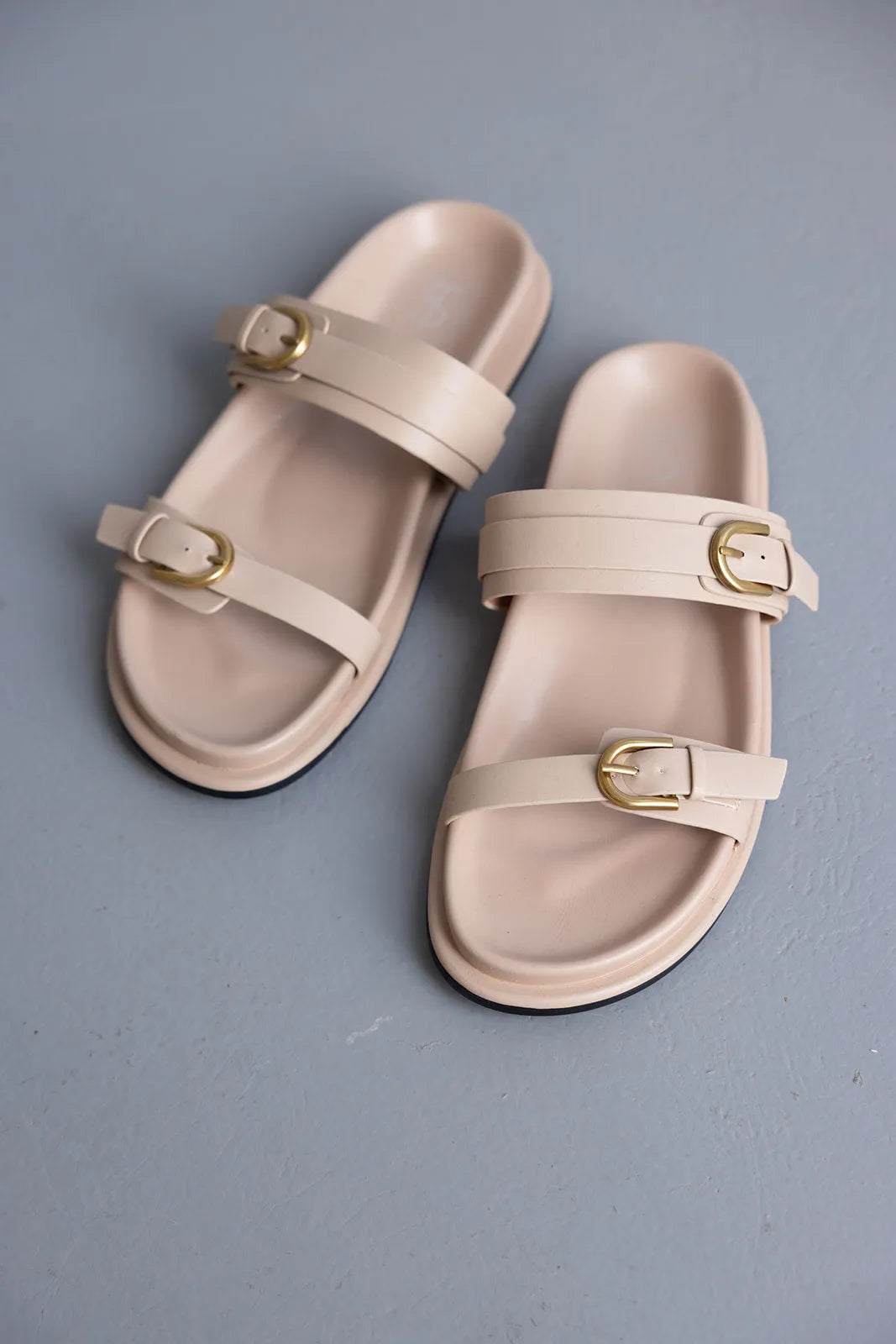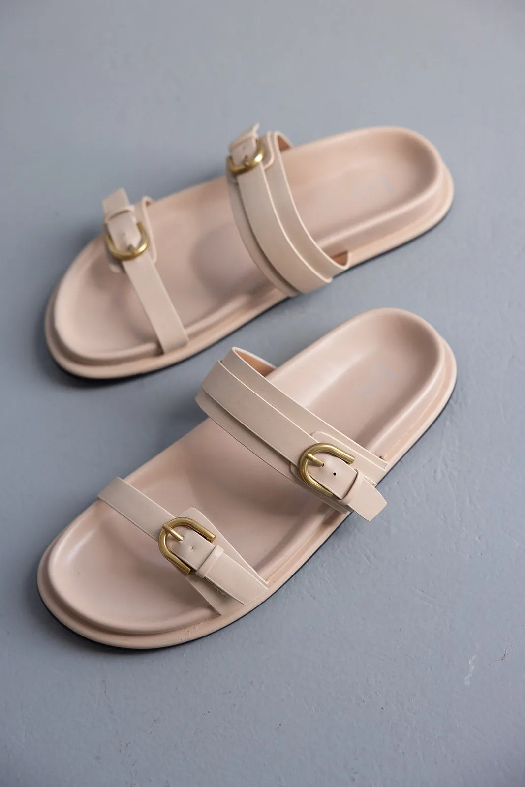 כפכף שטוח דמוי עור בשילוב שתי רצועות ואבזמים בצבע זהב להידוק.
