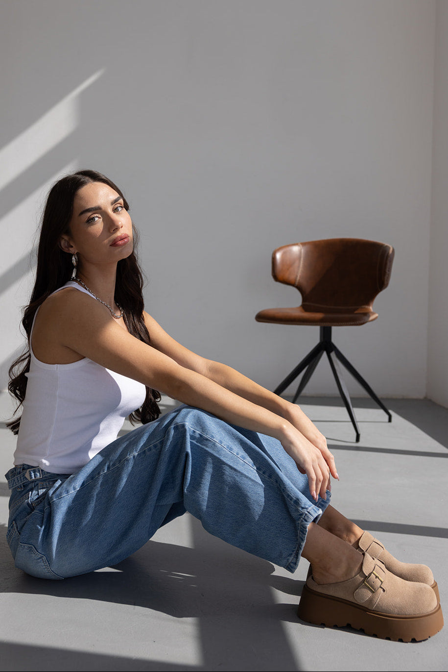 נעליים נוחות ביותר לעונה עשויות דמוי זאמש, בשילוב אבזם מתכוונן וסוליית פלטפורמה לנוחות מקסימאלית.