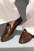 נעלי מוקסין המשלבות אלגנטיות ונוחות מרבית, עשויות דמוי עור בטקסטורת קרוקודיל למראה יוקרתי. בשילוב אבזם מוזהב למראה טרנדי.