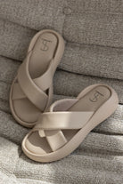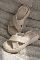 כפכף דמוי עור שטוח עם פלטפורמה, בשילוב רצועות מוצלבות.