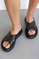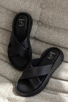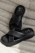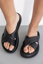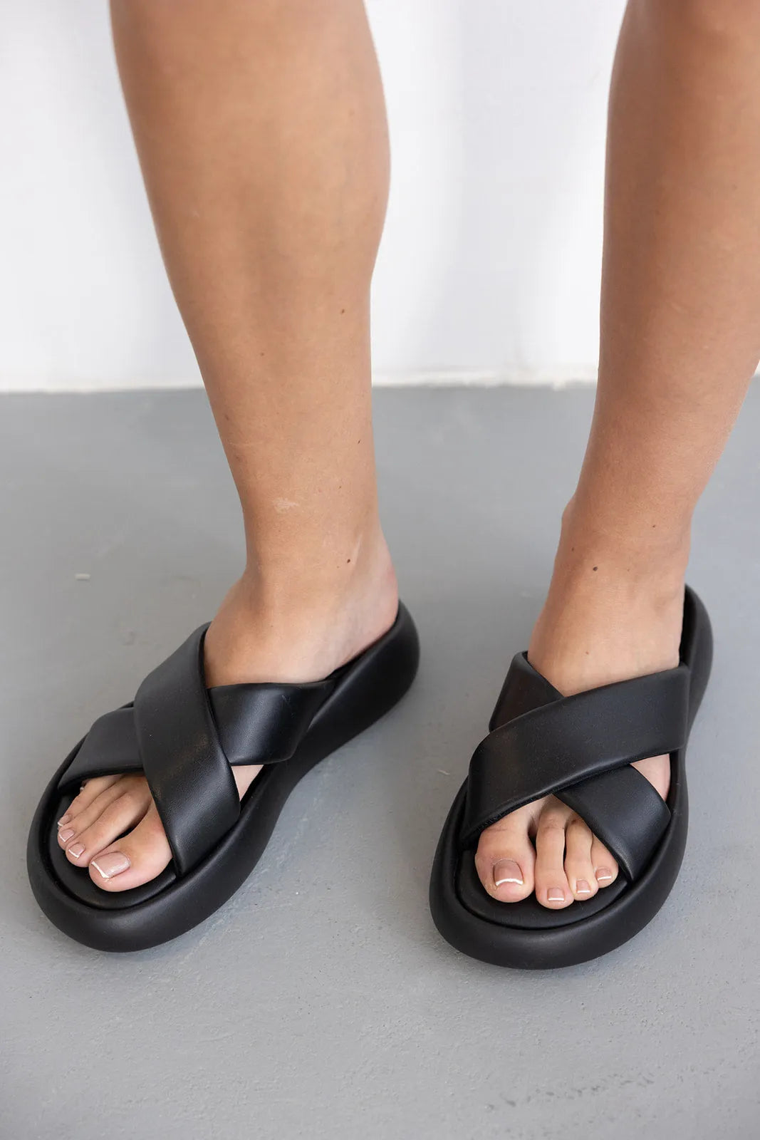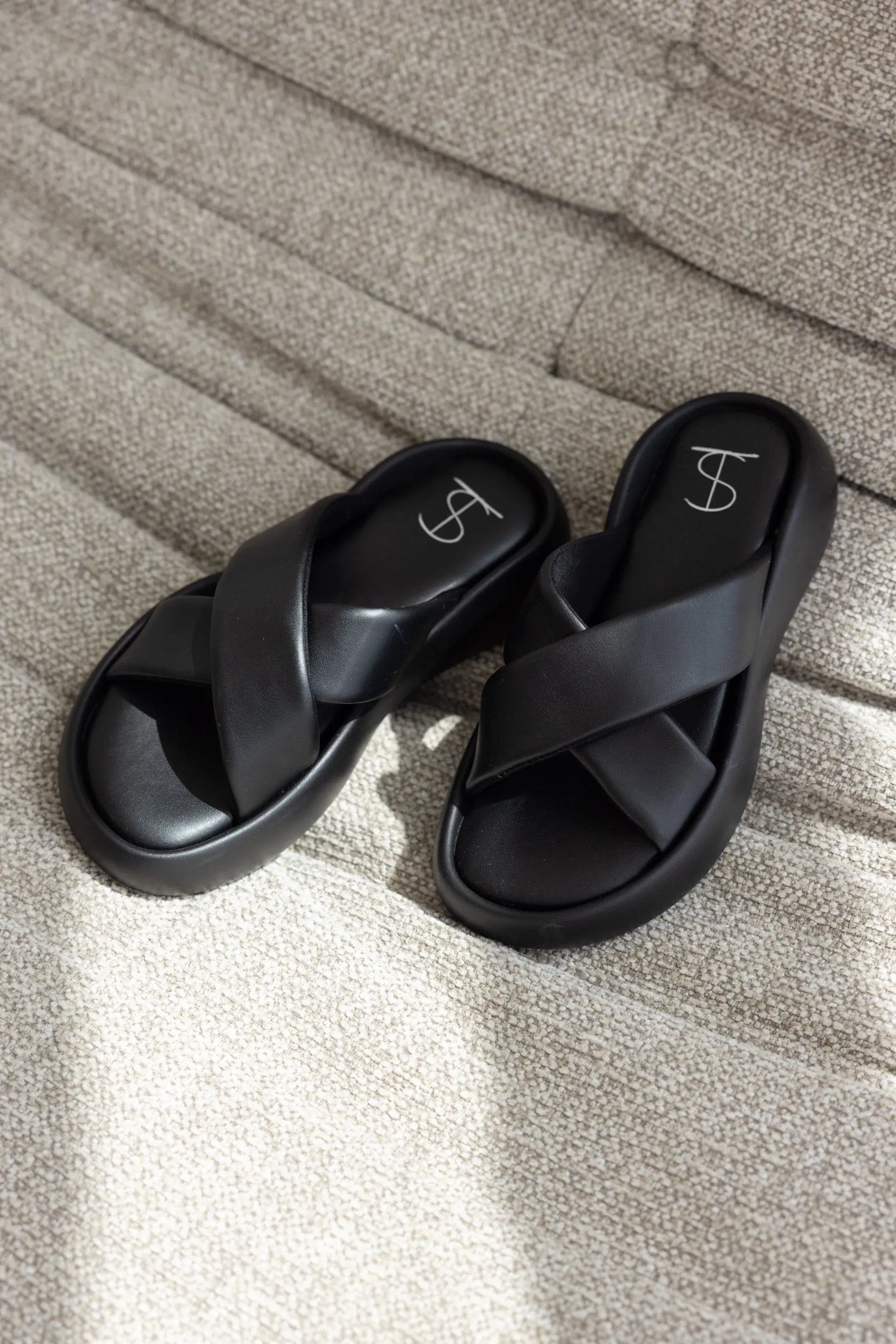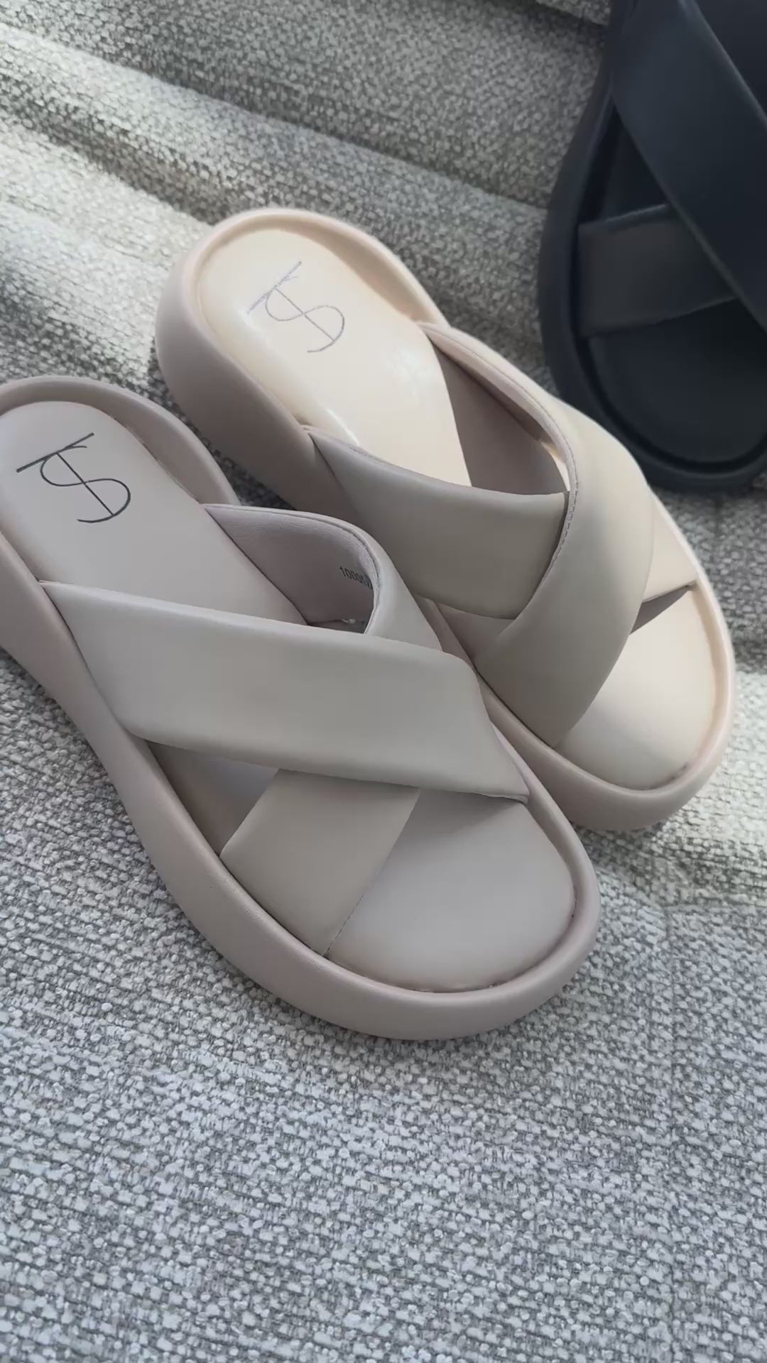 כפכף דמוי עור שטוח עם פלטפורמה, בשילוב רצועות מוצלבות.