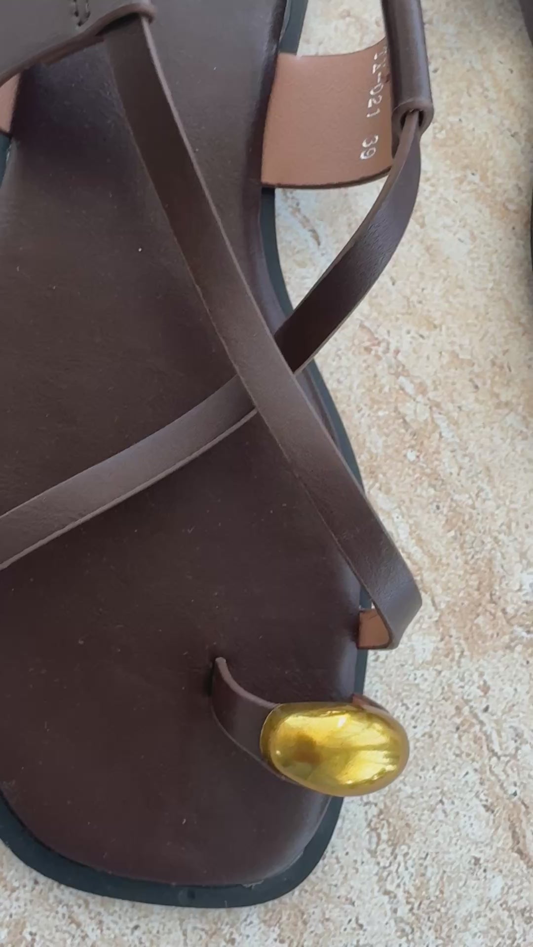 סנדל שטוח דמוי עור, בשילוב רצועות דקות ואלמנט מוזהב טרנדי.