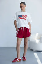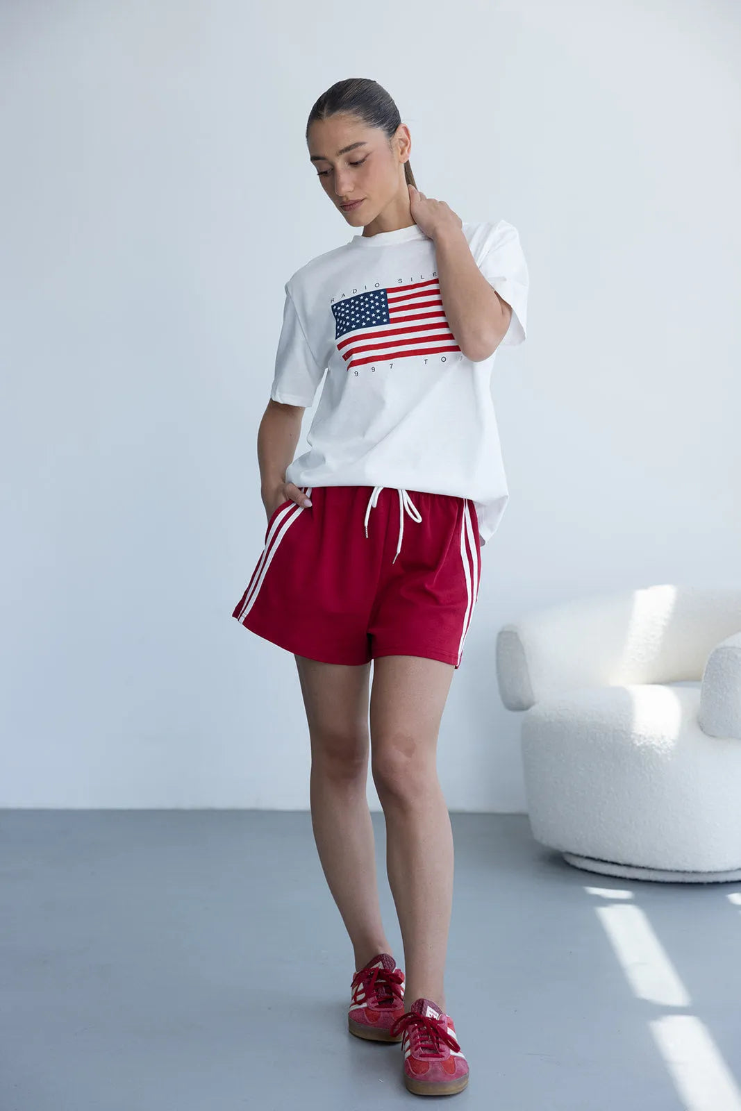מכנס שורט קיצי ונוח, מבד איכותי ביותר למראה ספורטיבי וקלאסי. בשילוב הדפס פסים עדינים בשני צדדי המכנס בצבע לבן. שני כיסים קדמיים, גומי במותן וקשירה לנוחות מקסימאלית.
