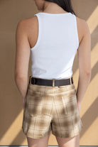 מכנס שורט קצר עשוי בד מעט נמתח ומחמיא ביותר. בשילוב דוגמה משובצת טרנדית וחגורת דמוי עור בצבע חום כהה עם אבזם כסוף בולט. למכנס שני כיסים קדמיים, שני כיסים אחוריים וסגירת רוכסן עם כפתור.
