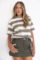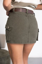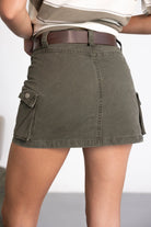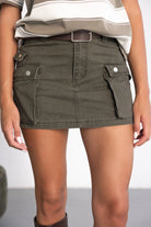 חצאית דגמ"ח קצרה בשילוב חגורת דמוי עור חומה ואבזם מלבני כסוף.