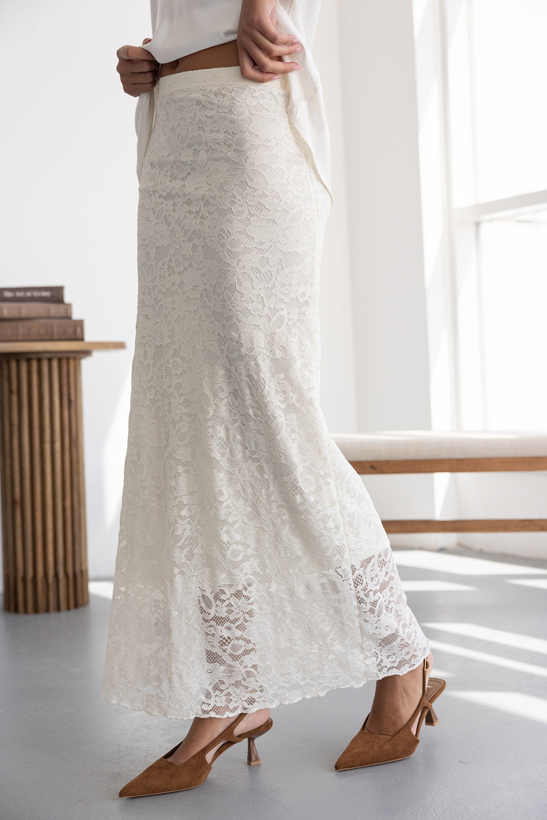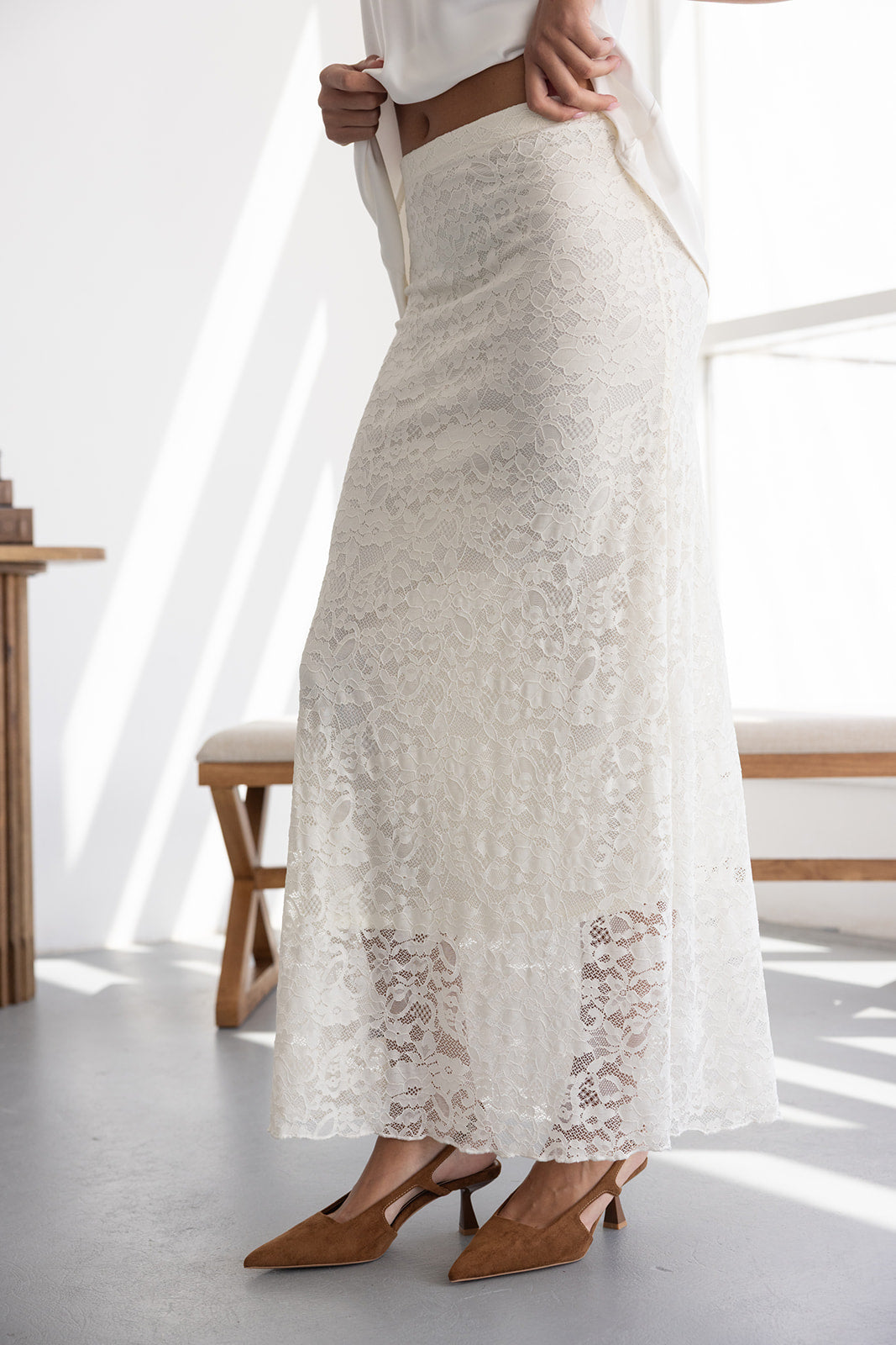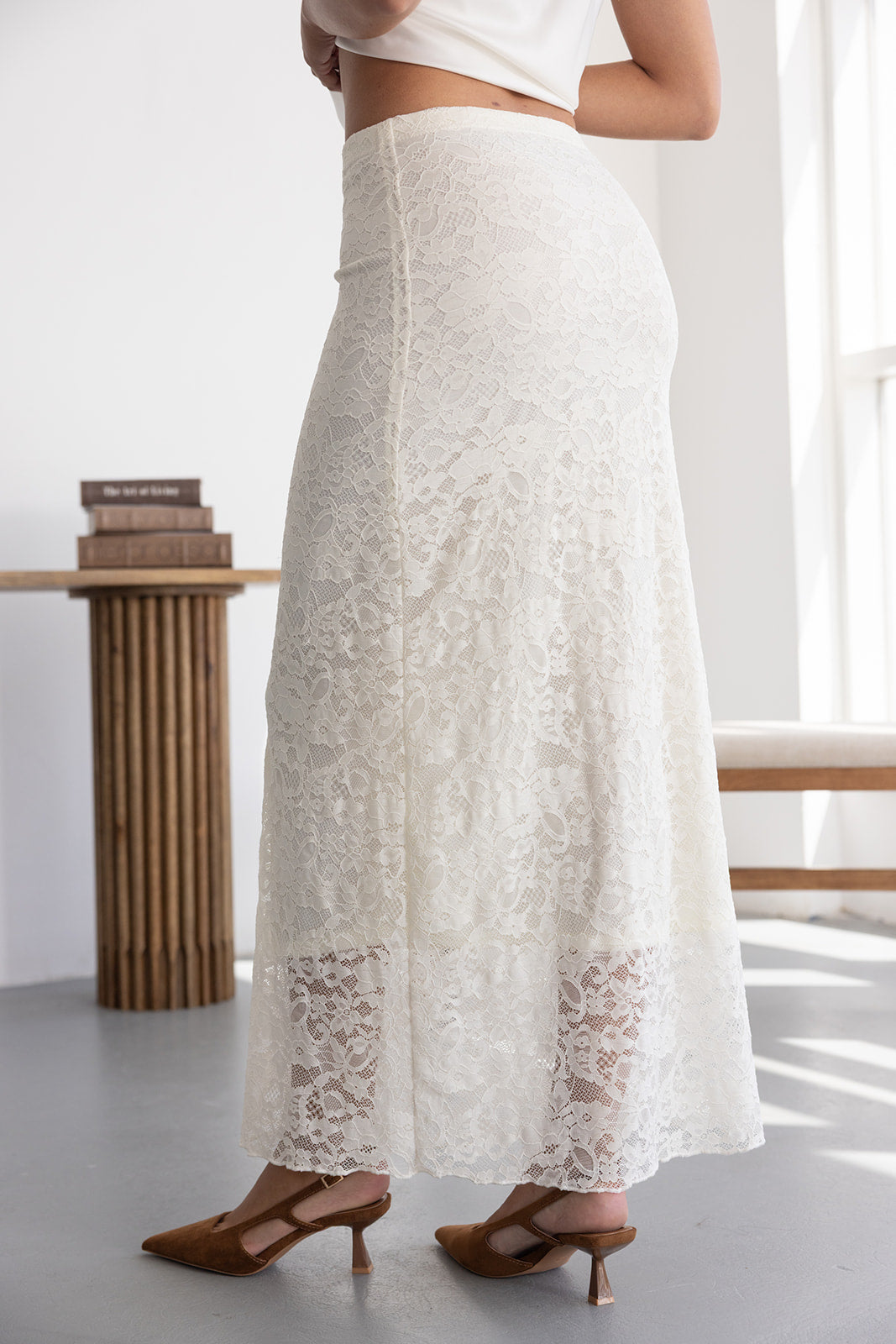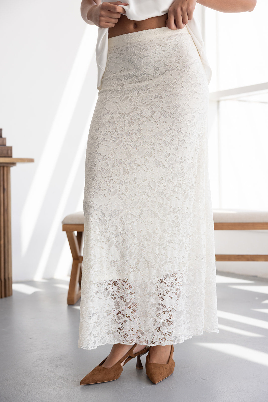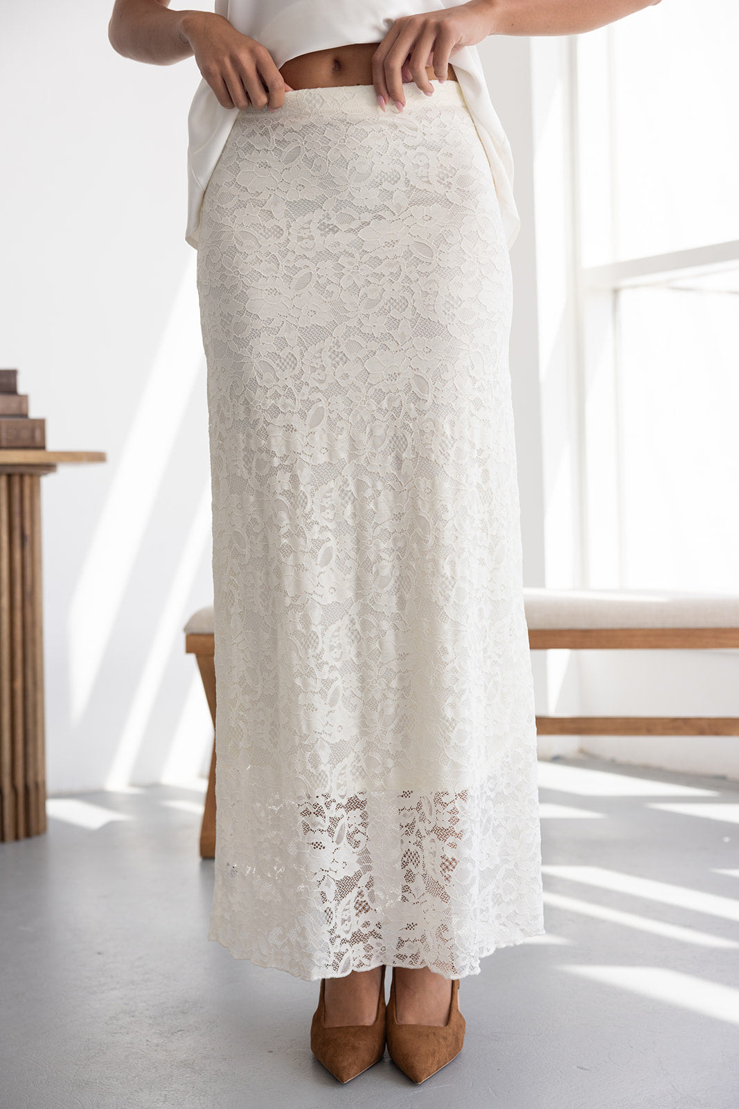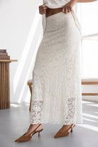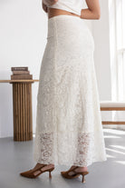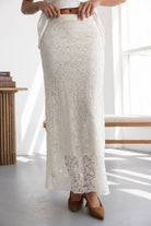חצאית מקסי מבד תחרה למראה חגיגי. לחצאית ביטנה ארוכה וגומי במותן לנוחות מקסימאלית.