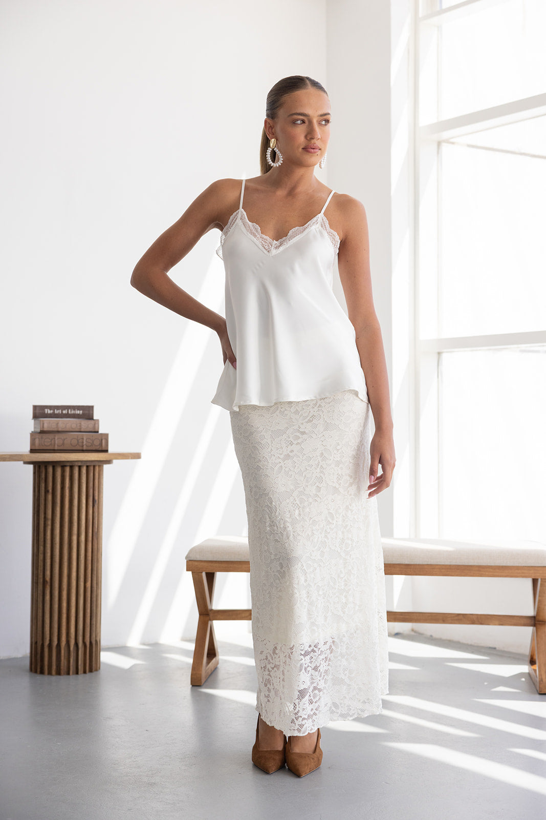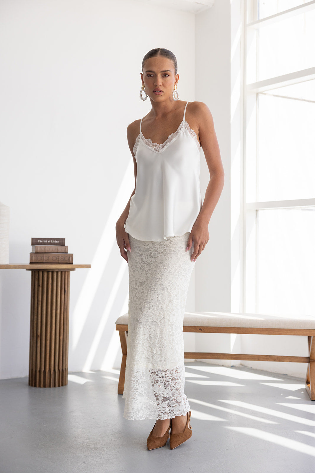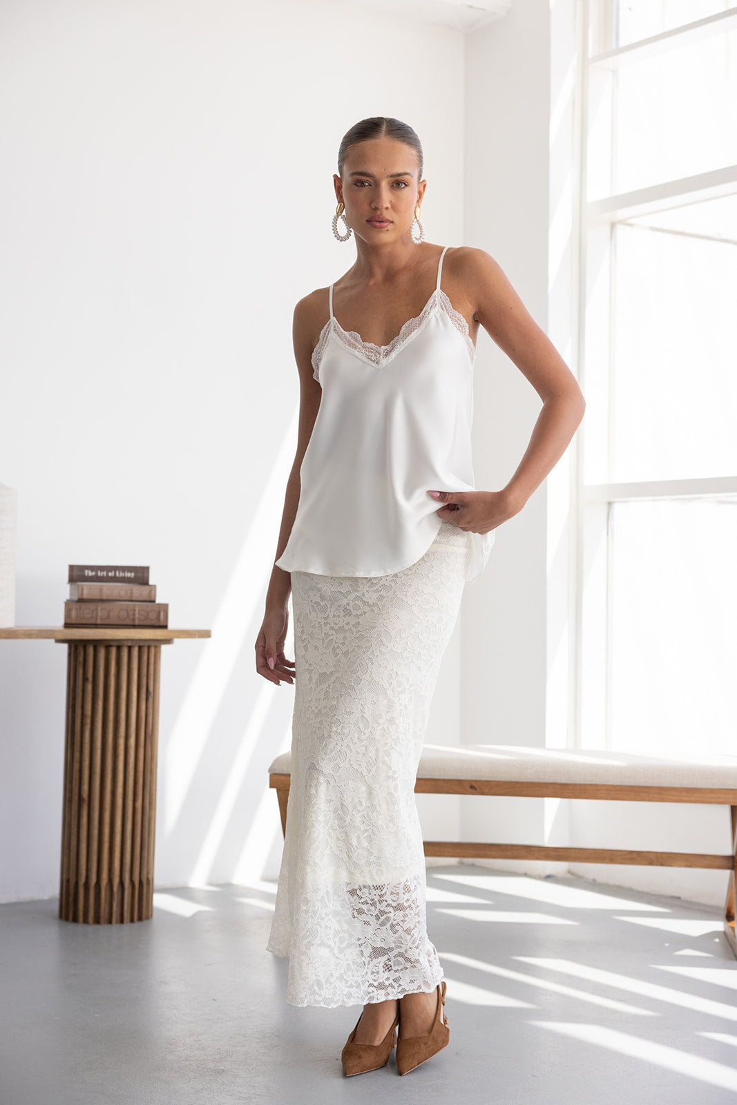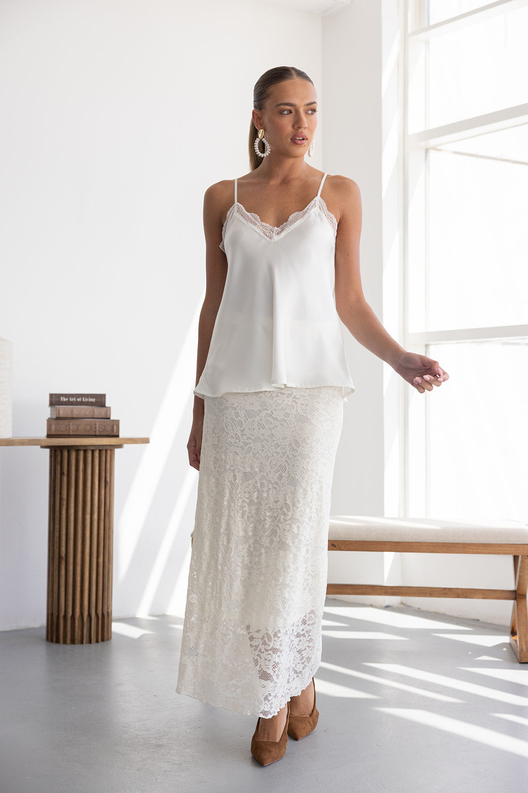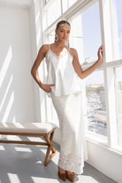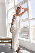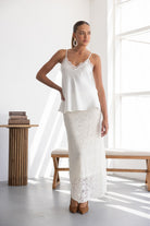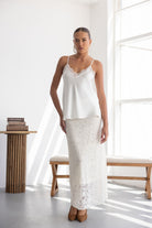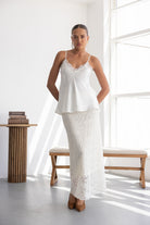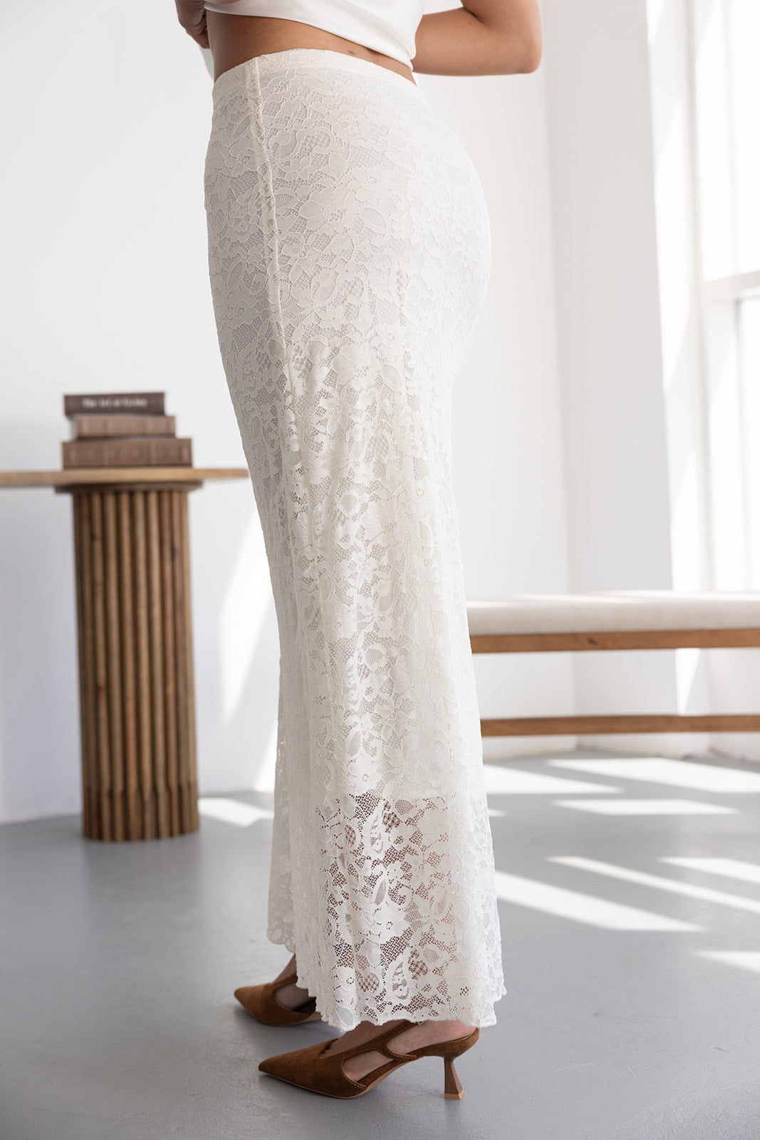 חצאית מקסי מבד תחרה למראה חגיגי. לחצאית ביטנה ארוכה וגומי במותן לנוחות מקסימאלית.