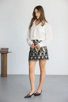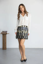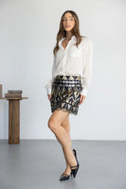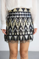 חצאית חגיגית בגזרת מיני מחמיאה, בשילוב דוגמה טרנדית של פייטים בצבעי זהב וכסף.