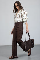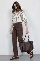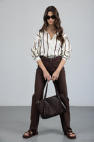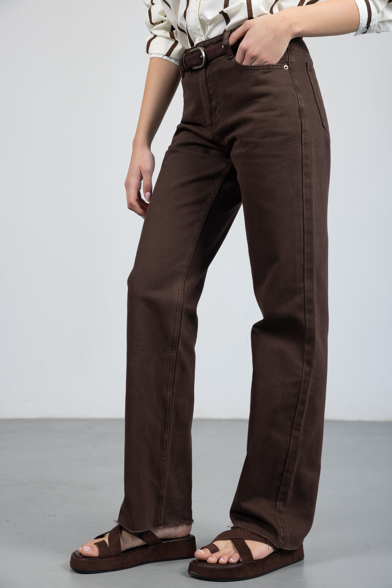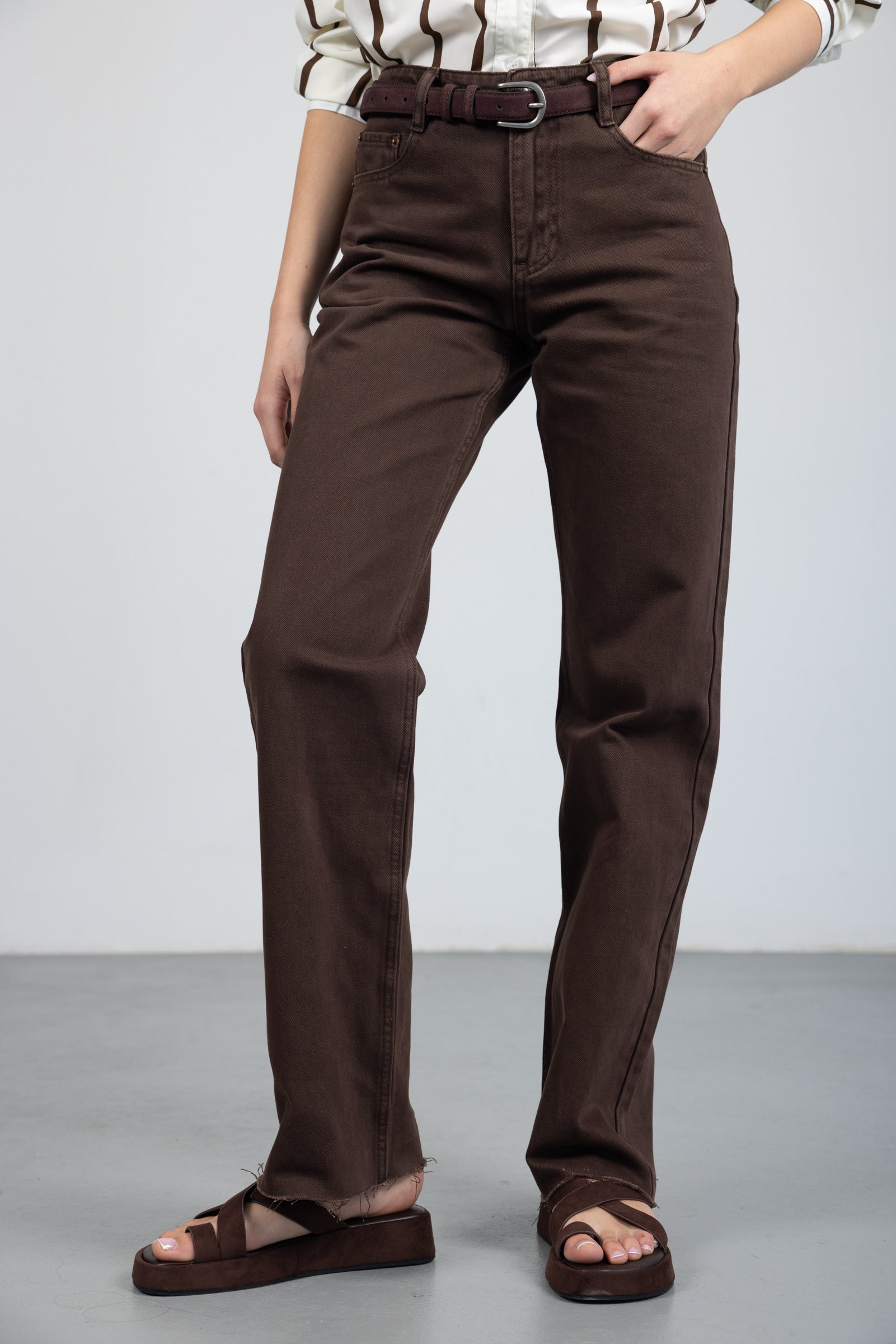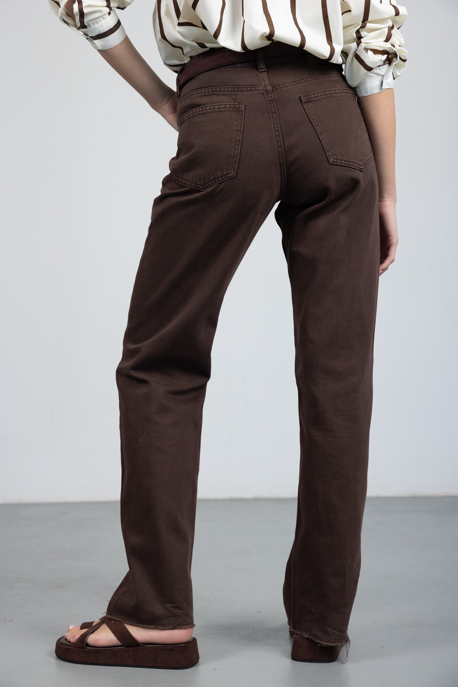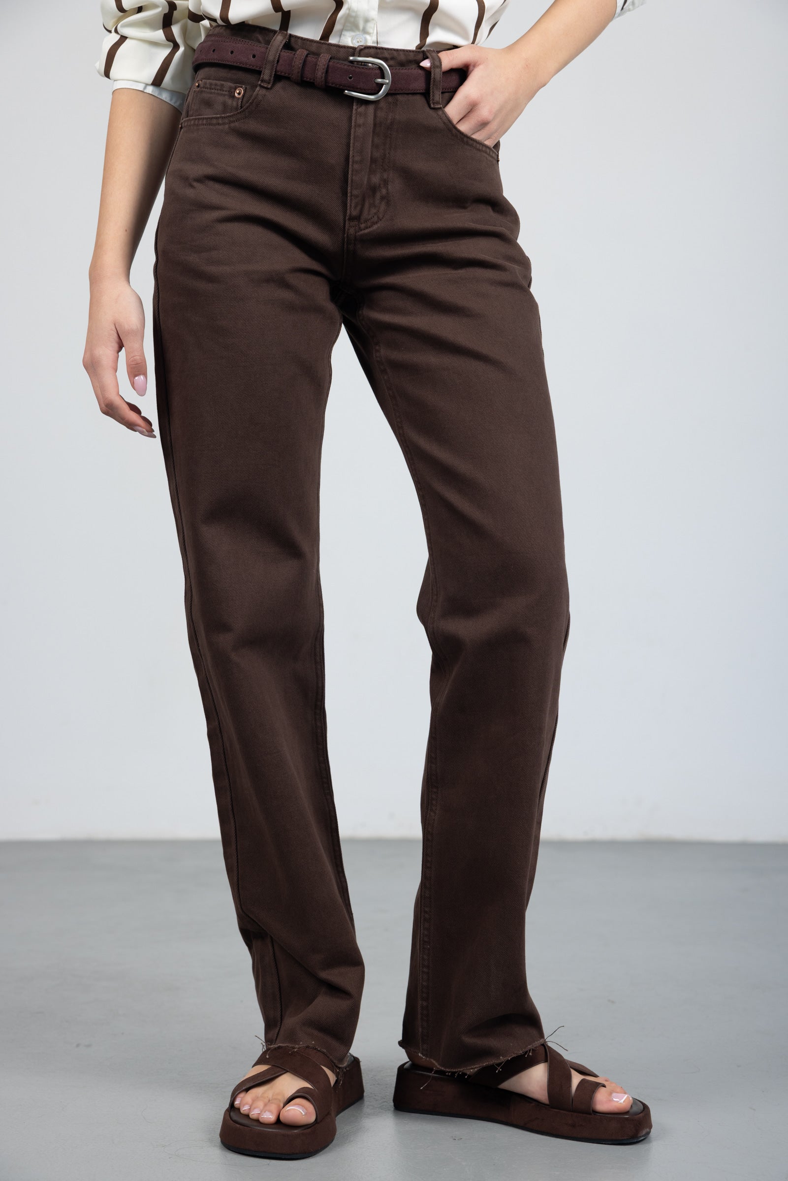 מכנס בגזרה ישרה עם מותן גבוהה, סגירת רוכסן וכפתור. כלל כיסים קדמיים ואחוריים. בד דנים קלאסי ונעים למגע.