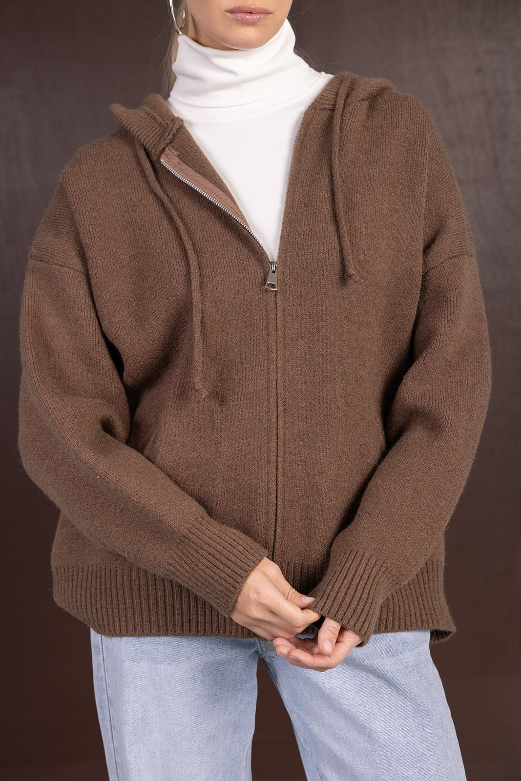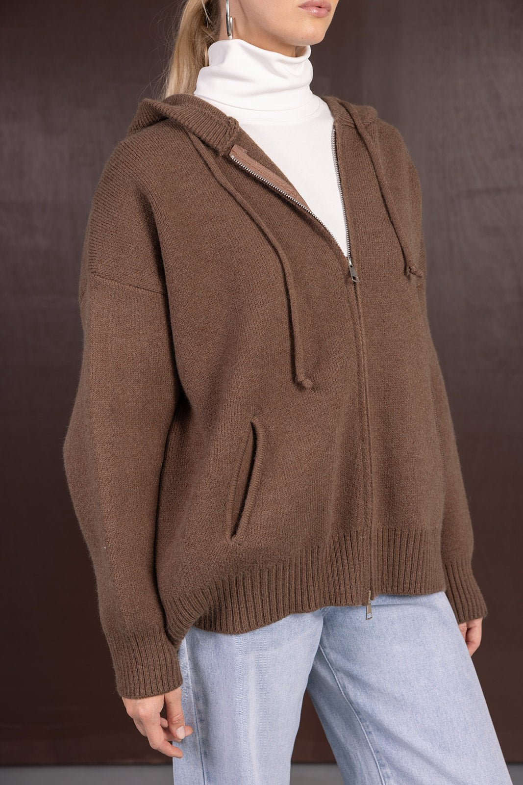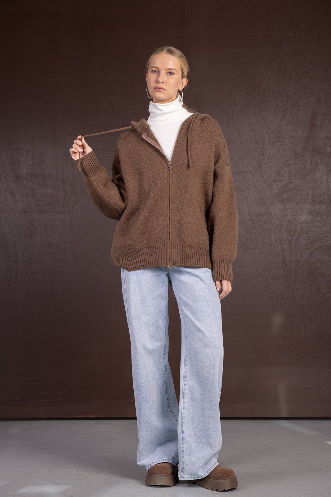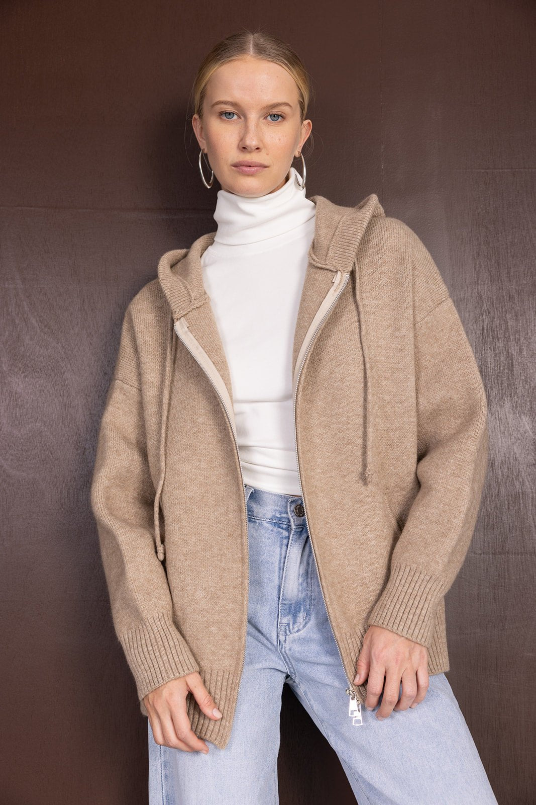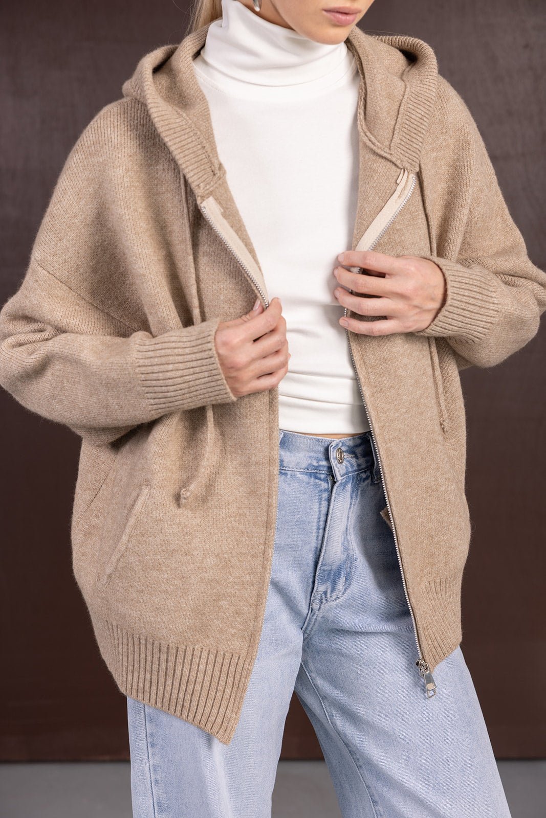 סריג מבד צמר מחמם ביותר לעונה ובגזרה משוחררת. בשילוב קופוצ'ון, זוג כיסים ורוכסן לסגירה.