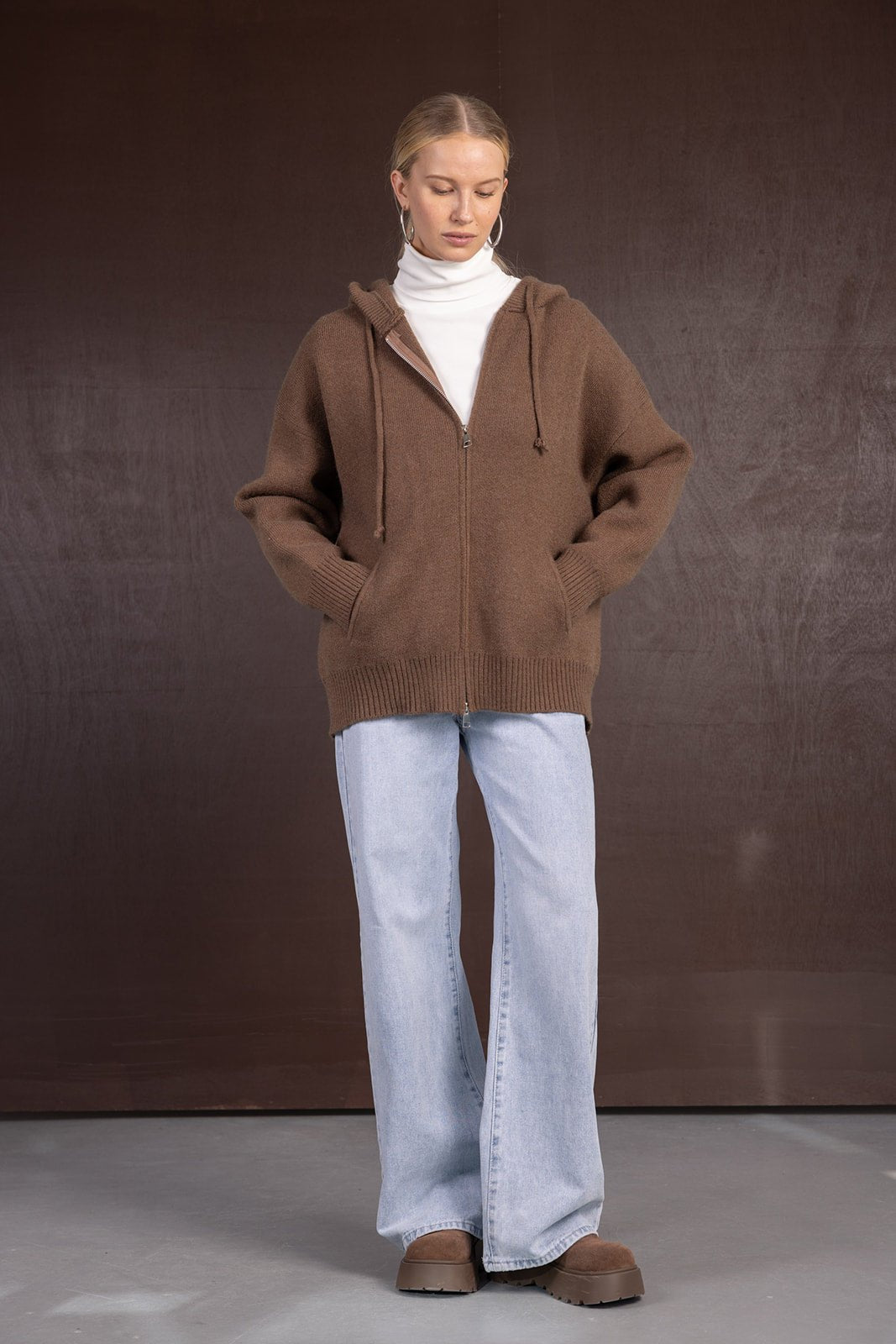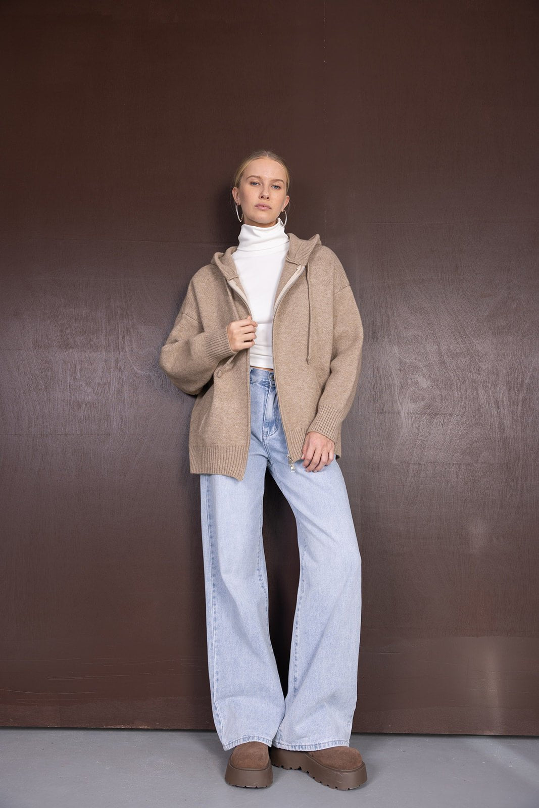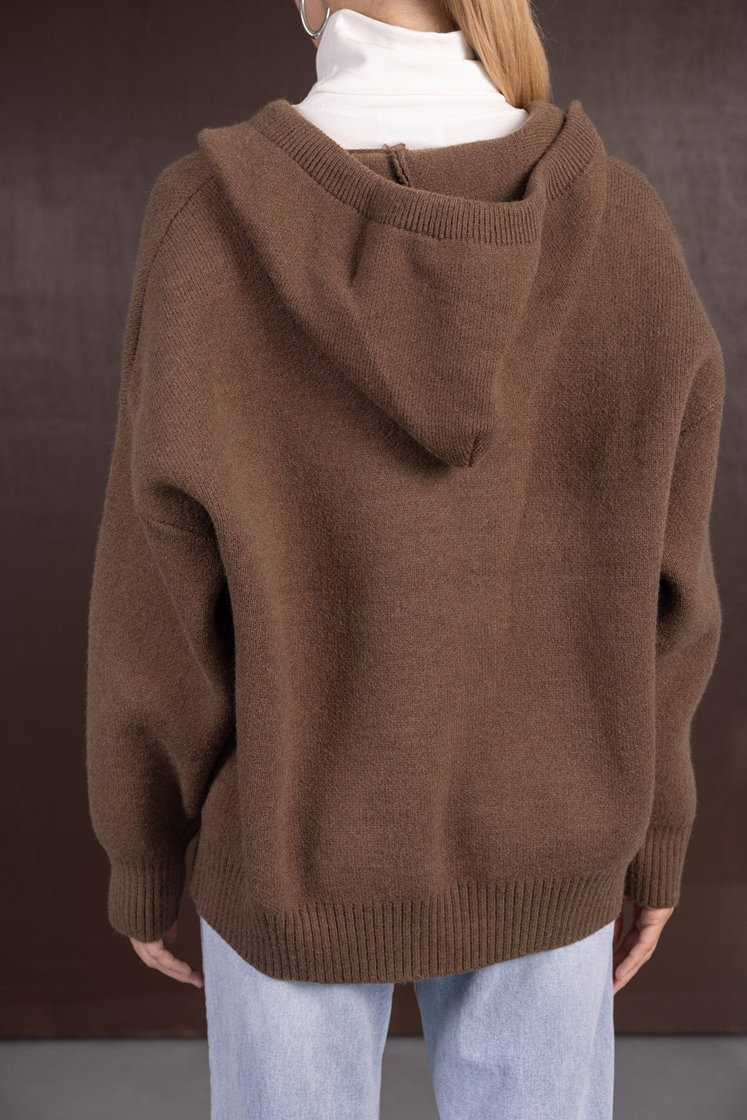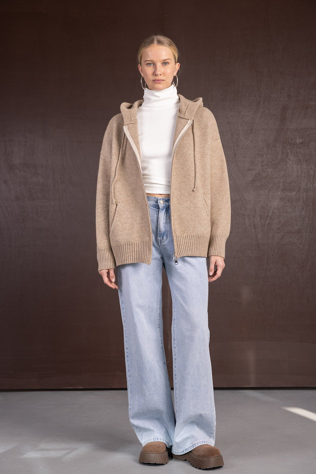 סריג מבד צמר מחמם ביותר לעונה ובגזרה משוחררת. בשילוב קופוצ'ון, זוג כיסים ורוכסן לסגירה.
