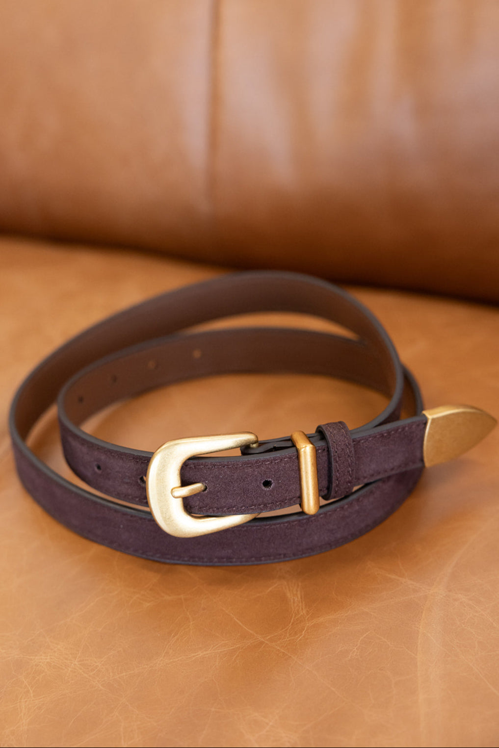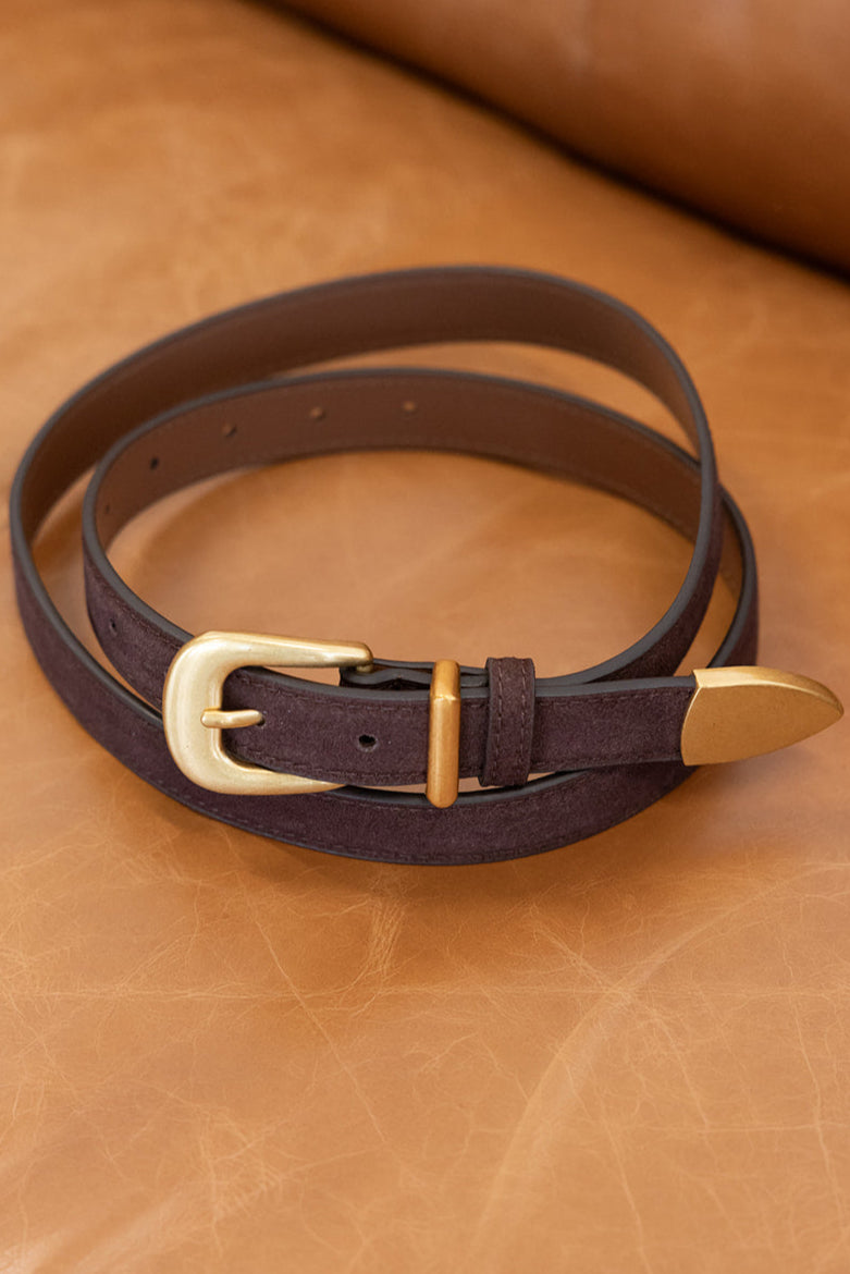 חגורת דמוי זמש חומה בשילוב אבזם מרובע זהב, למראה קלאסי.