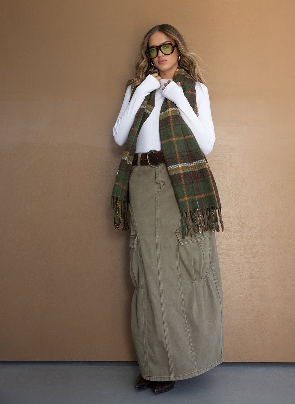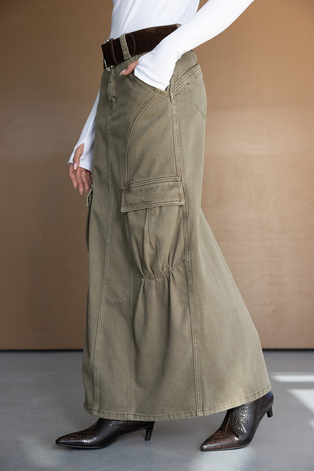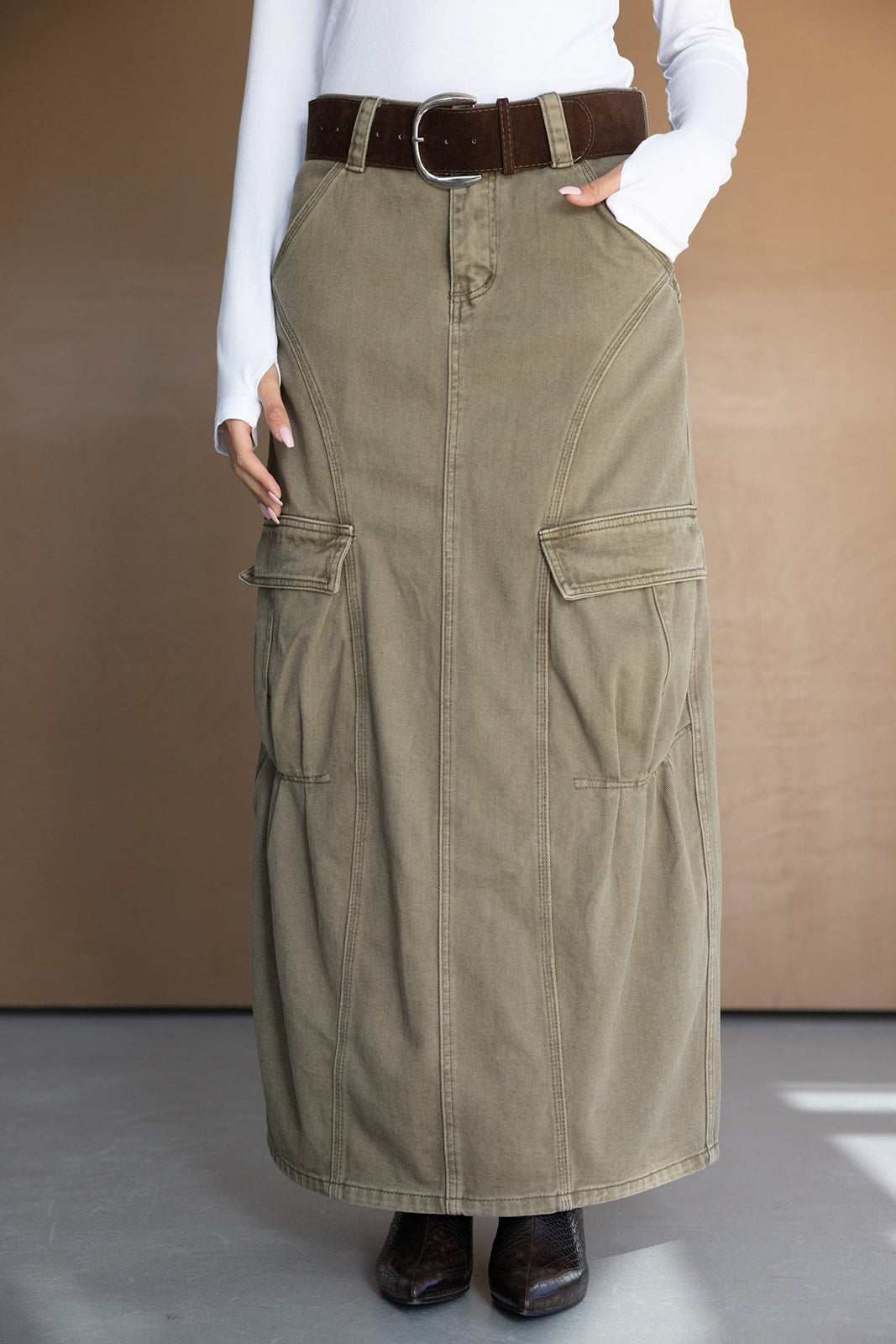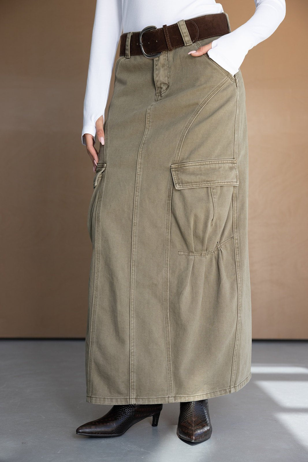 חצאית דגמ"ח באורך מקסי ובמראה משוחרר טרנדי. בשילוב כיסים וחגורה עבה דמוי זאמש עם אבזם כסוף.