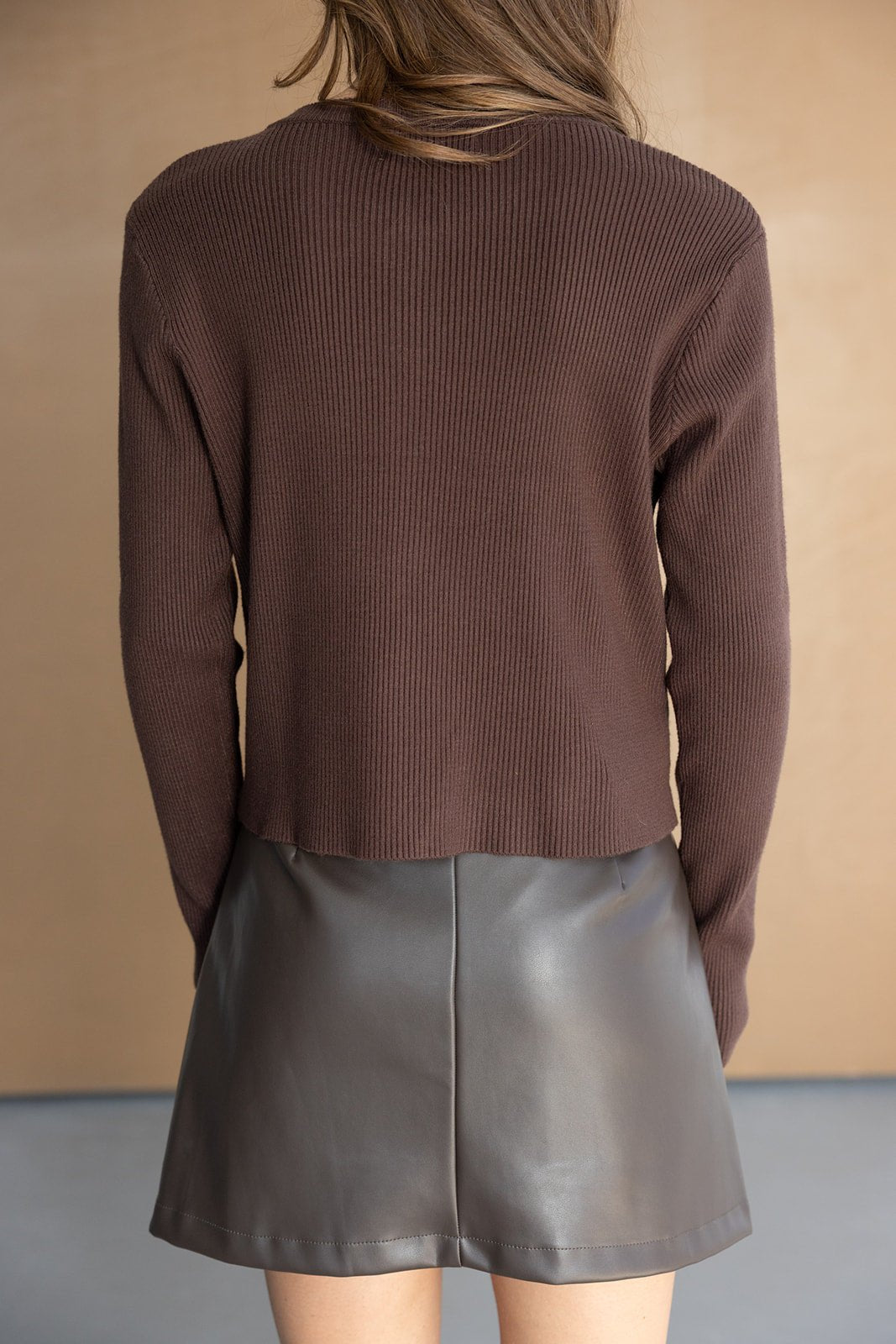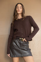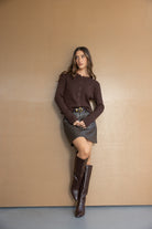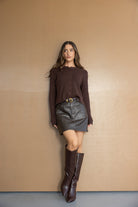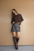 חצאית מיני מדמוי עור איכותי, בשילוב מכנסון פנימי לנוחות מקסימאלית, זוג כיסים קדמיים וחגורת דמוי עור בצבע חום כהה עם אבזם מוזהב.