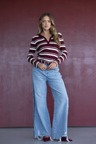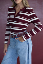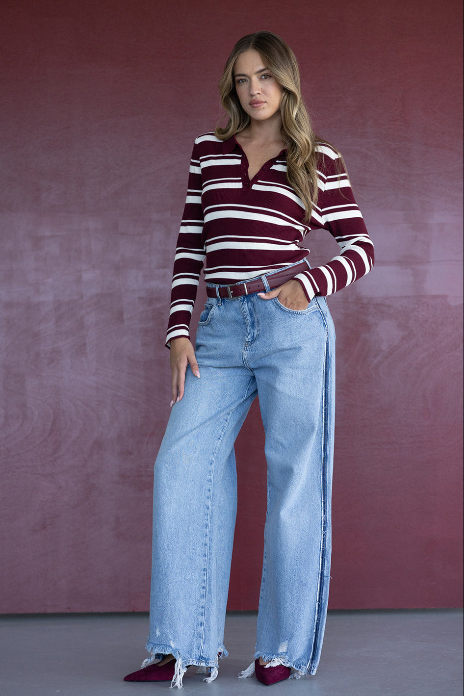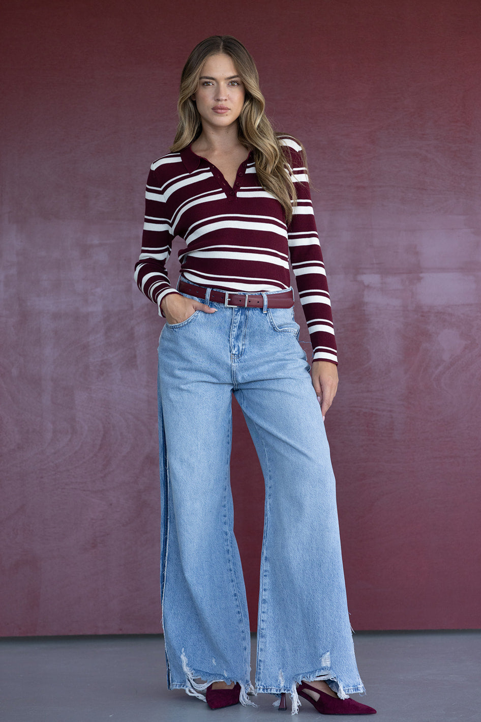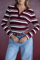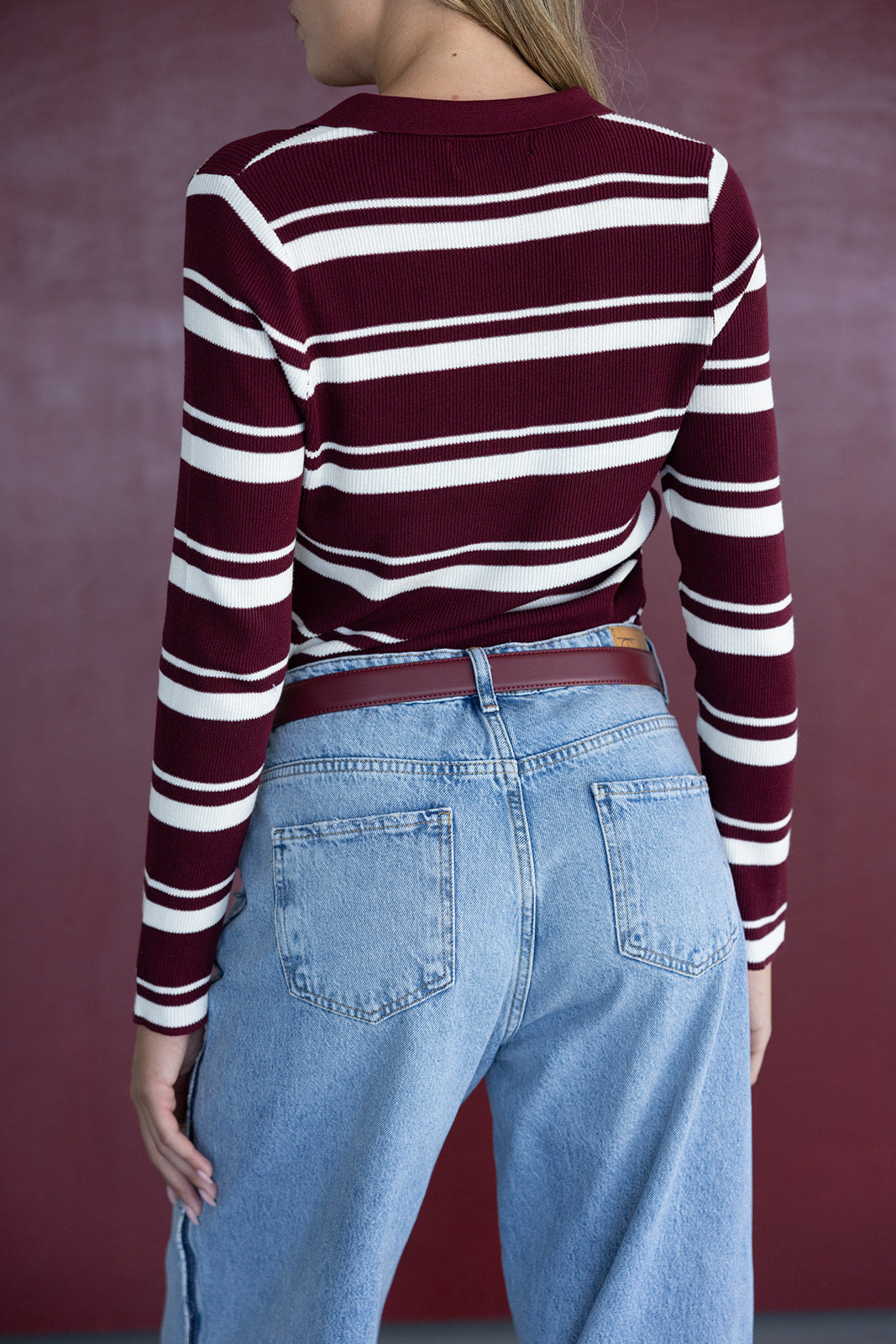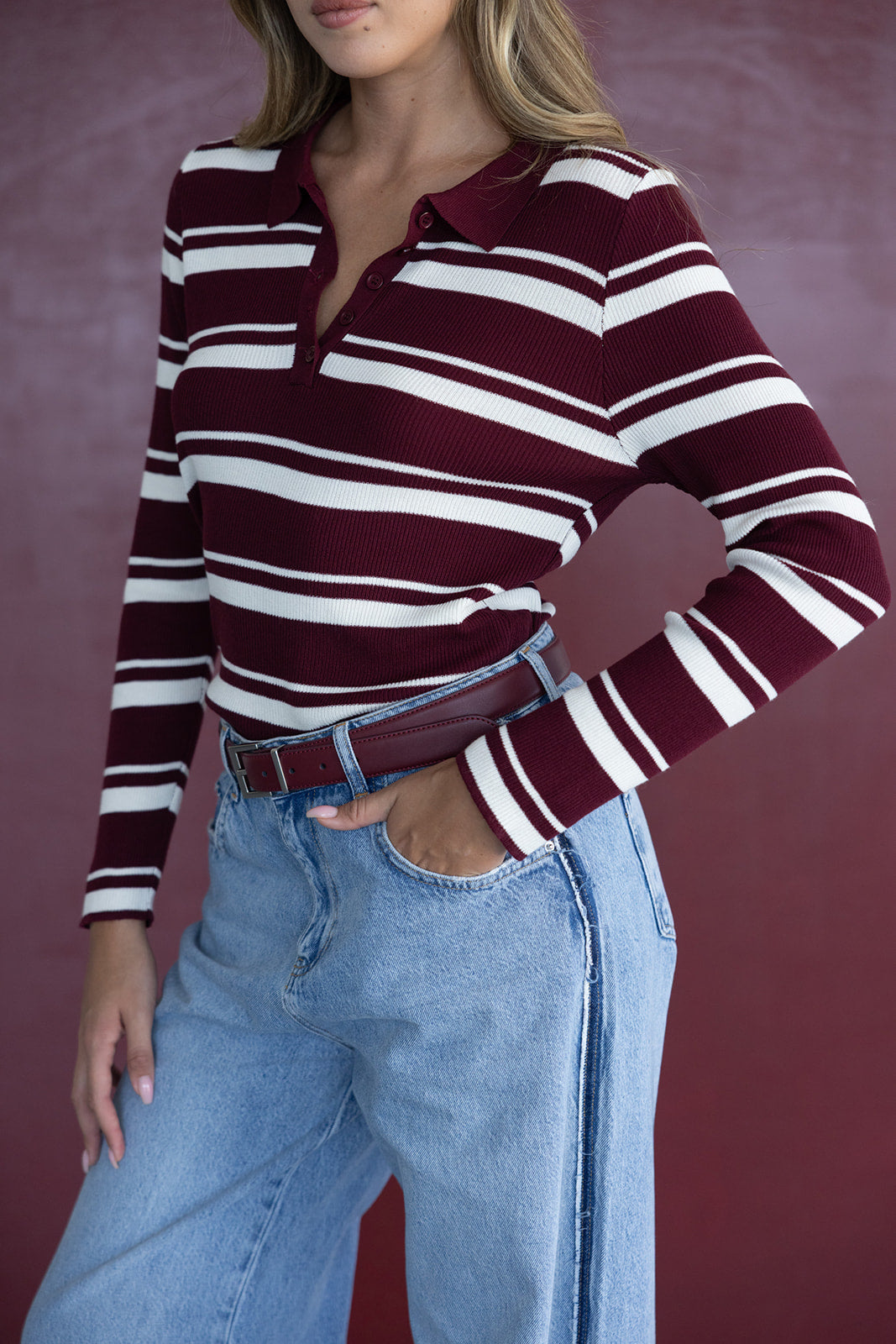 חולצת סריג מבד נעים ביותר ובגזרה צמודה ומחמיאה. בשילוב צווארון פולו קלאסי עם כפתורים ודוגמאת פסים לרוחב החולצה.