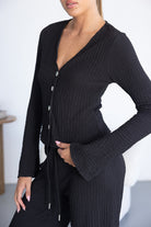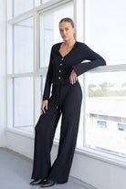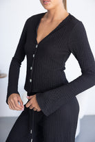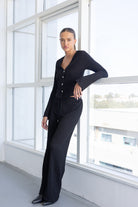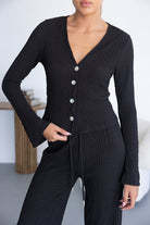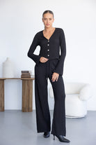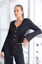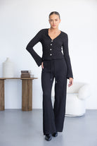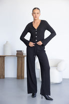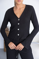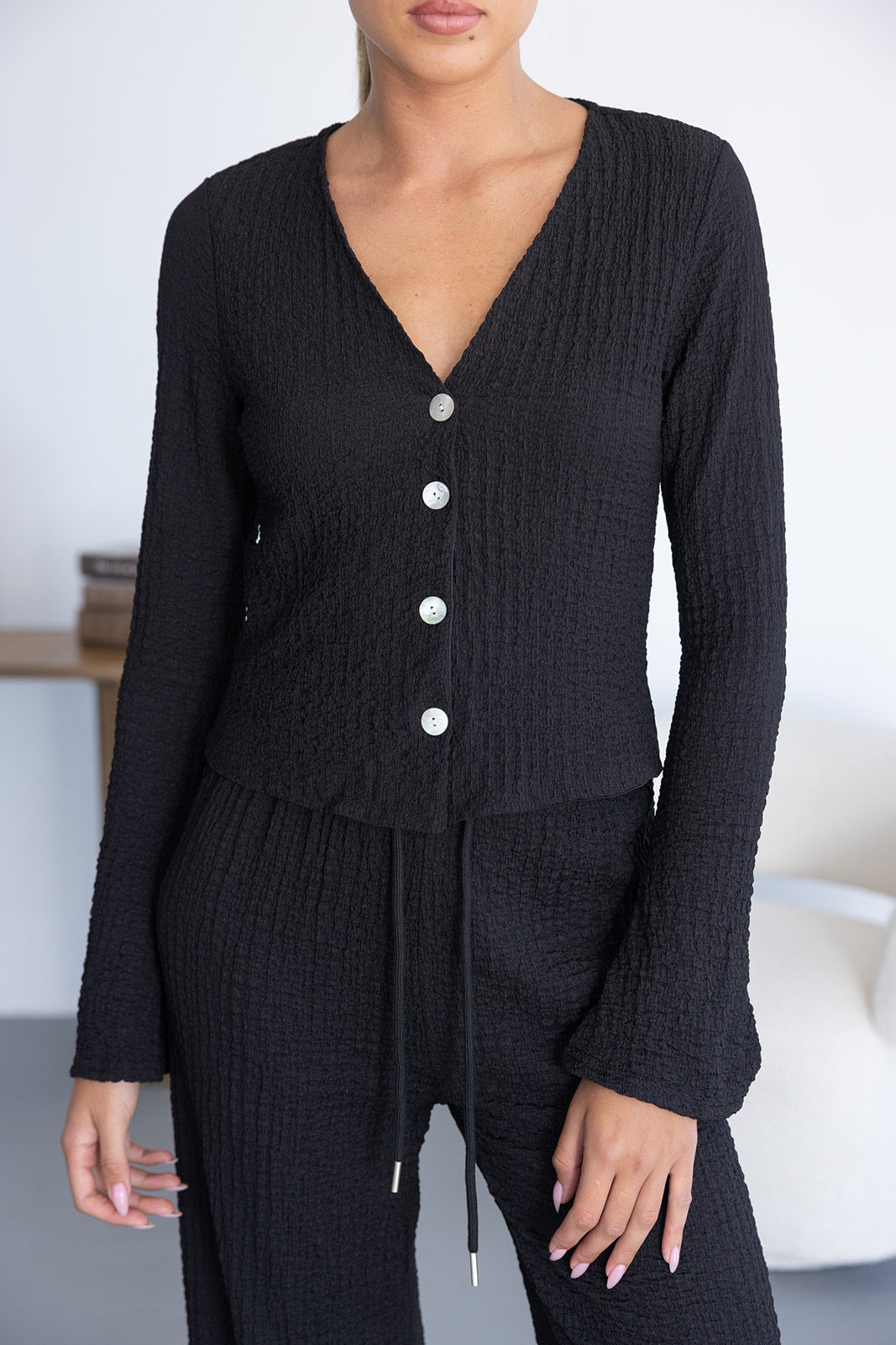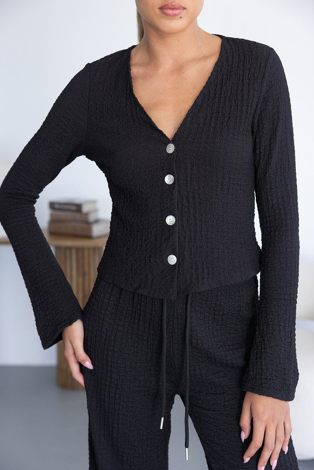 חולצה בגזרה מעט צמודה ומחמיאה ביותר, מבד מכווץ טרנדי. לחולצה שרוולים ארוכים ומתרחבים מעט, מפתח צוואר וי וכפתורים לאורך החולצה.