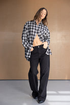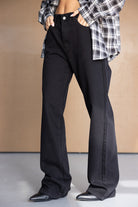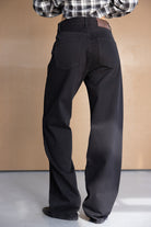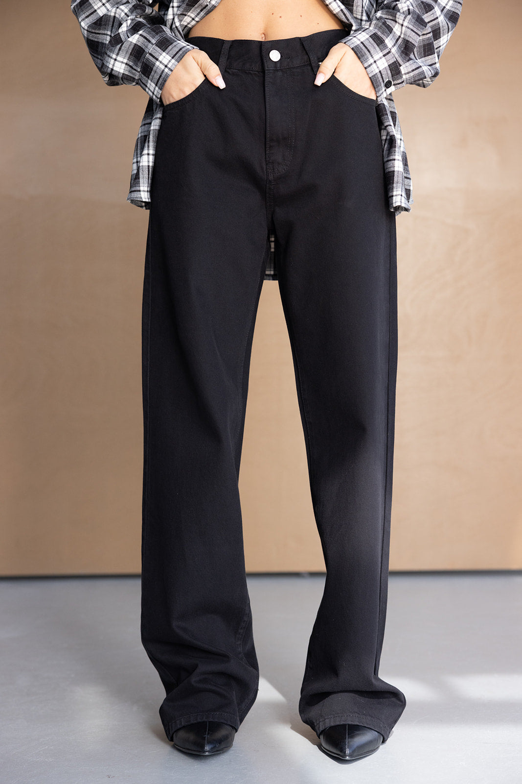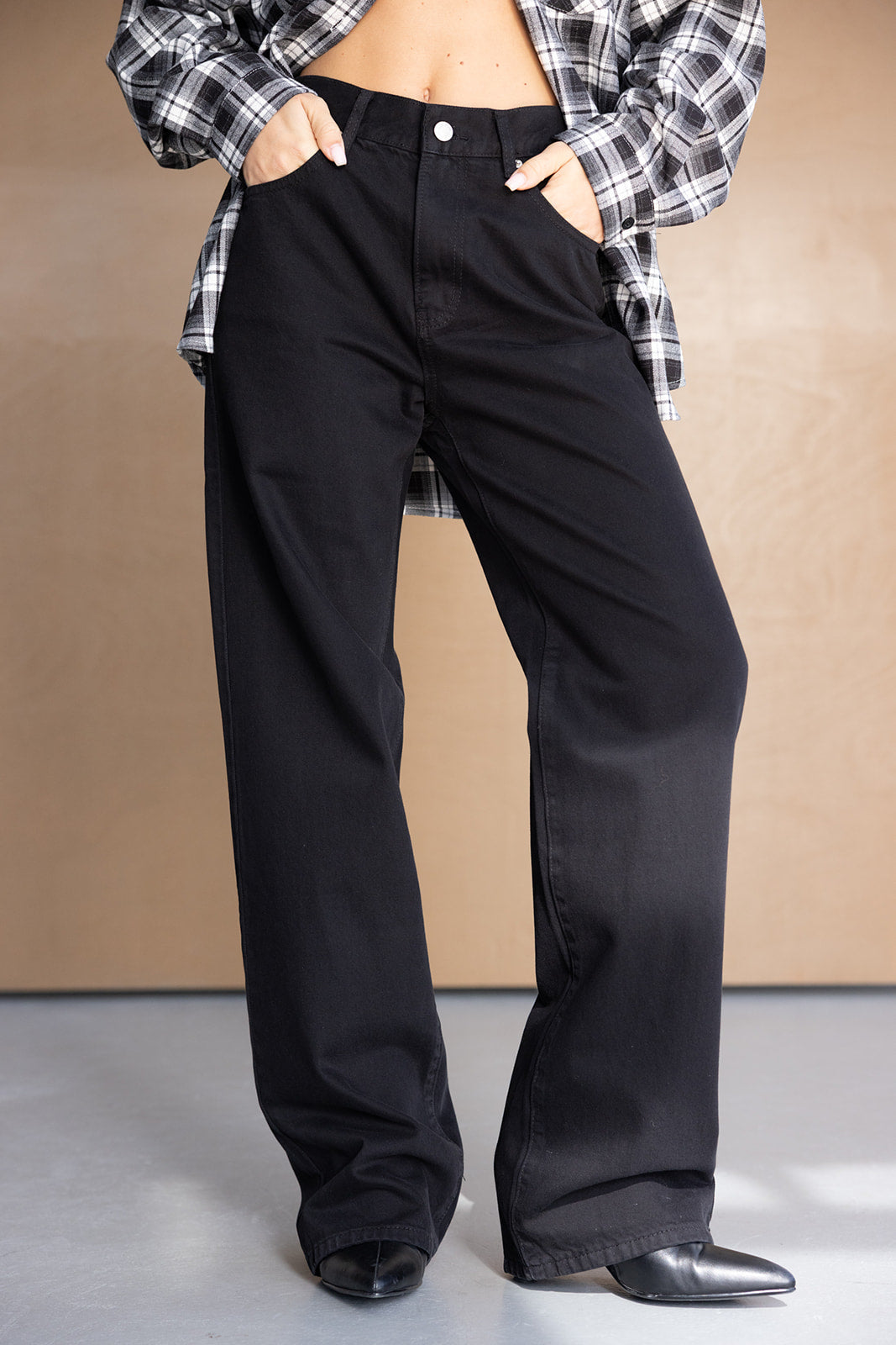 ג'ינס שחור קלאסי בגזרת מידי משוחררת ומתרחבת מעט. לג'ינס שני כיסים קדמיים ושני כיסים אחוריים, כפתור ורוכסן לסגירה.