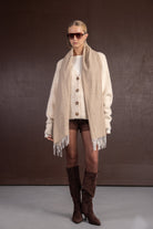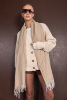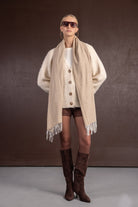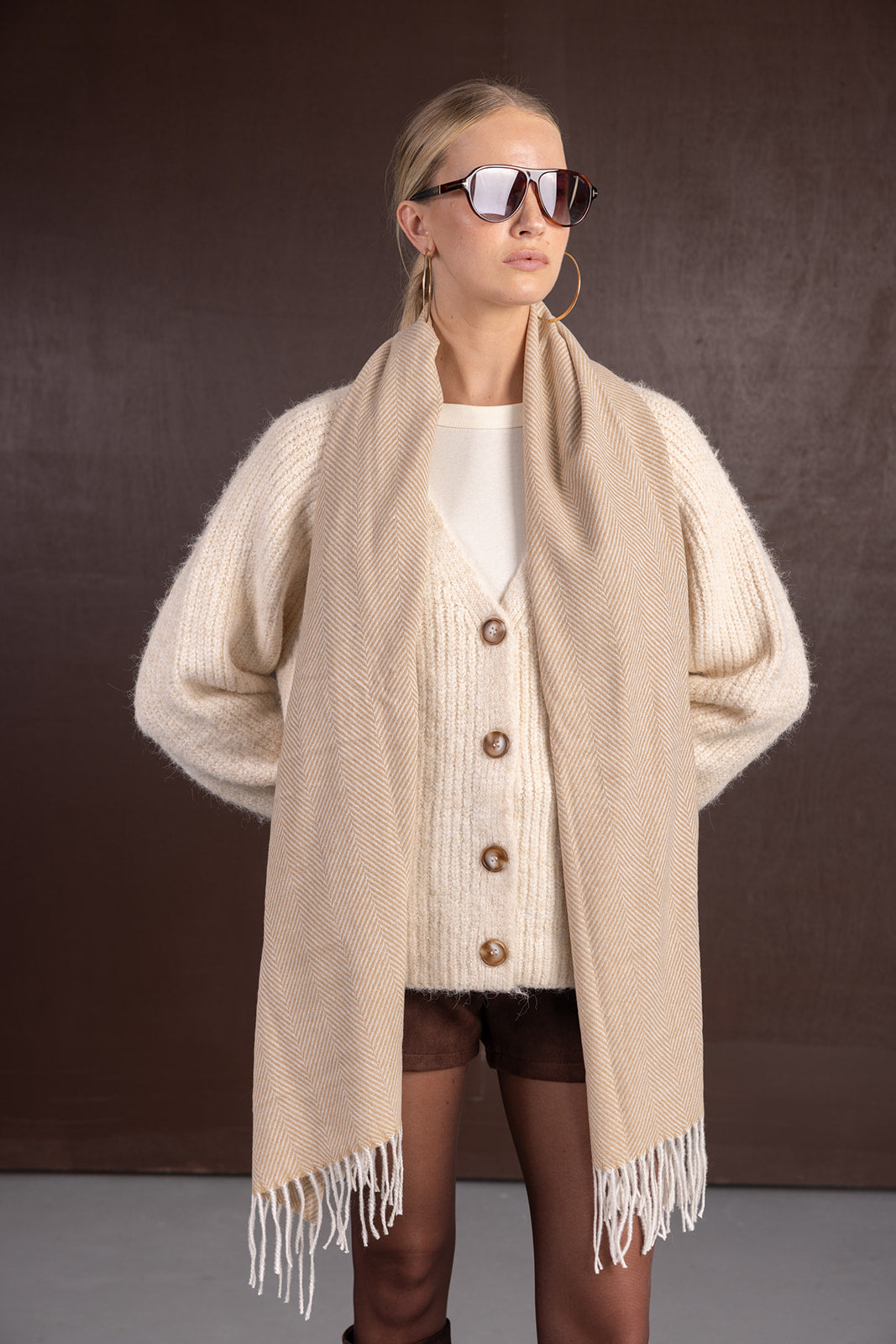 צעיף צמר קלאסי בשילוב דוגמה טרנדית ביותר לעונה וסיומת פרנזים.