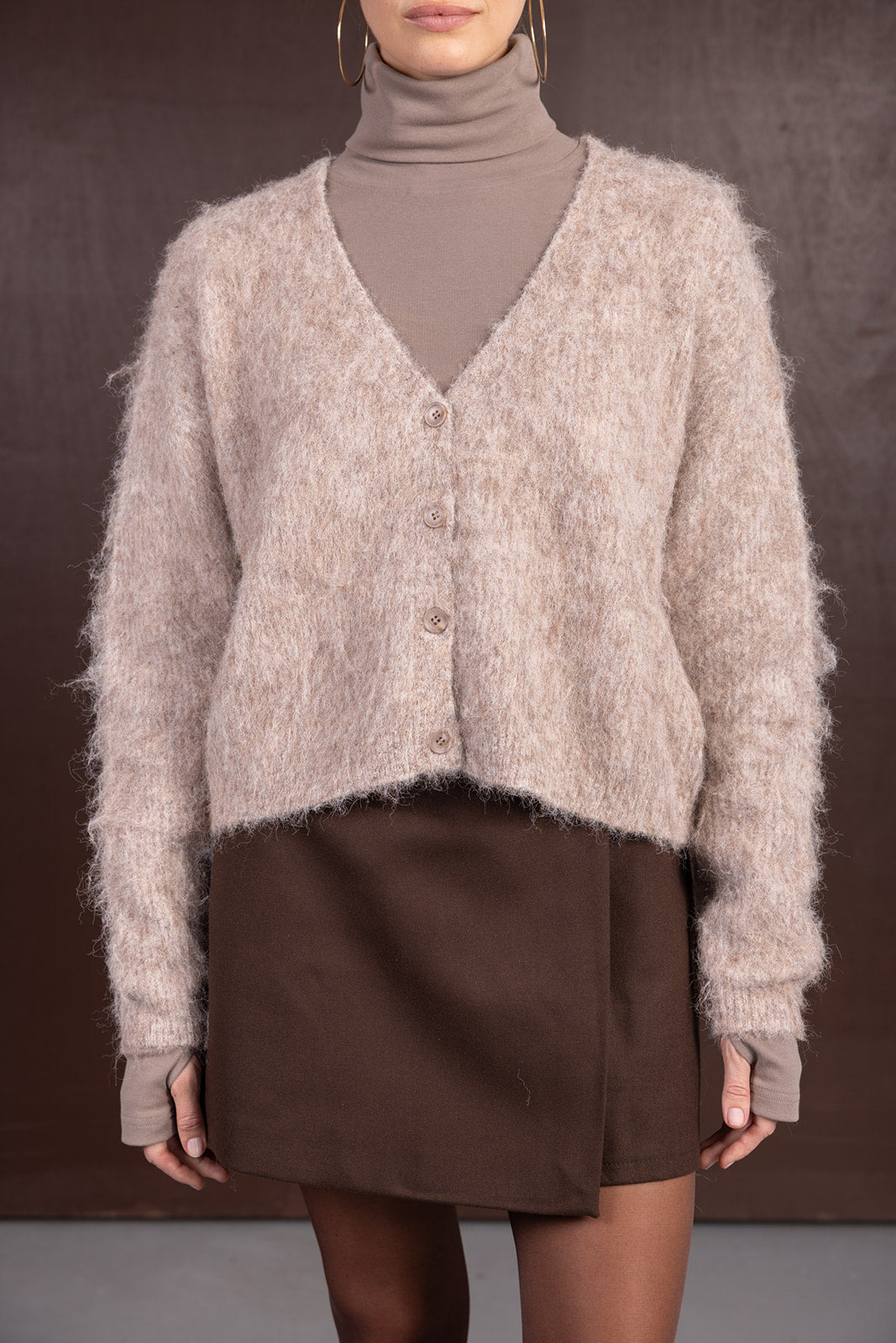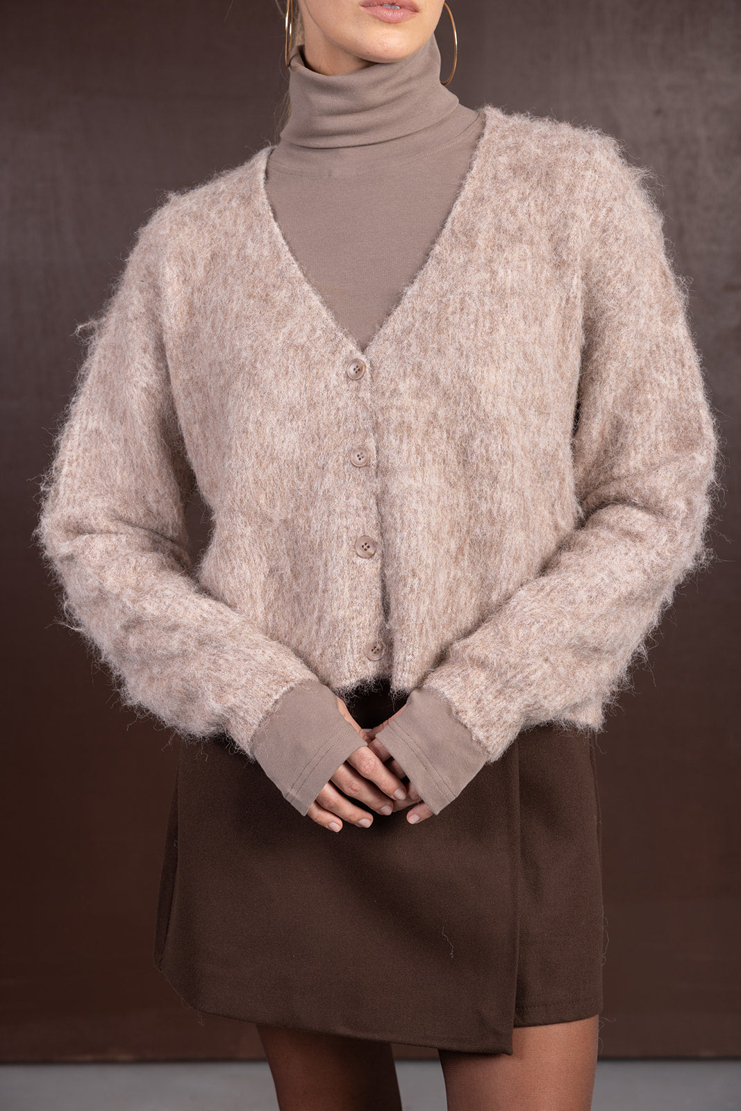 קרדיגן רך במראה פלפי, עם כפתרה קדמית וגזרה קצרה. שרוולים ארוכים ונפולים שמוסיפים טאץ' נעים.