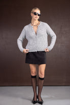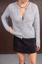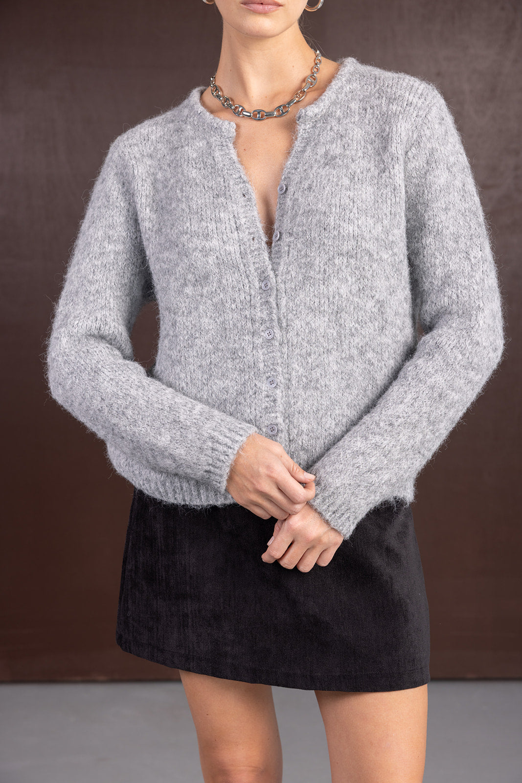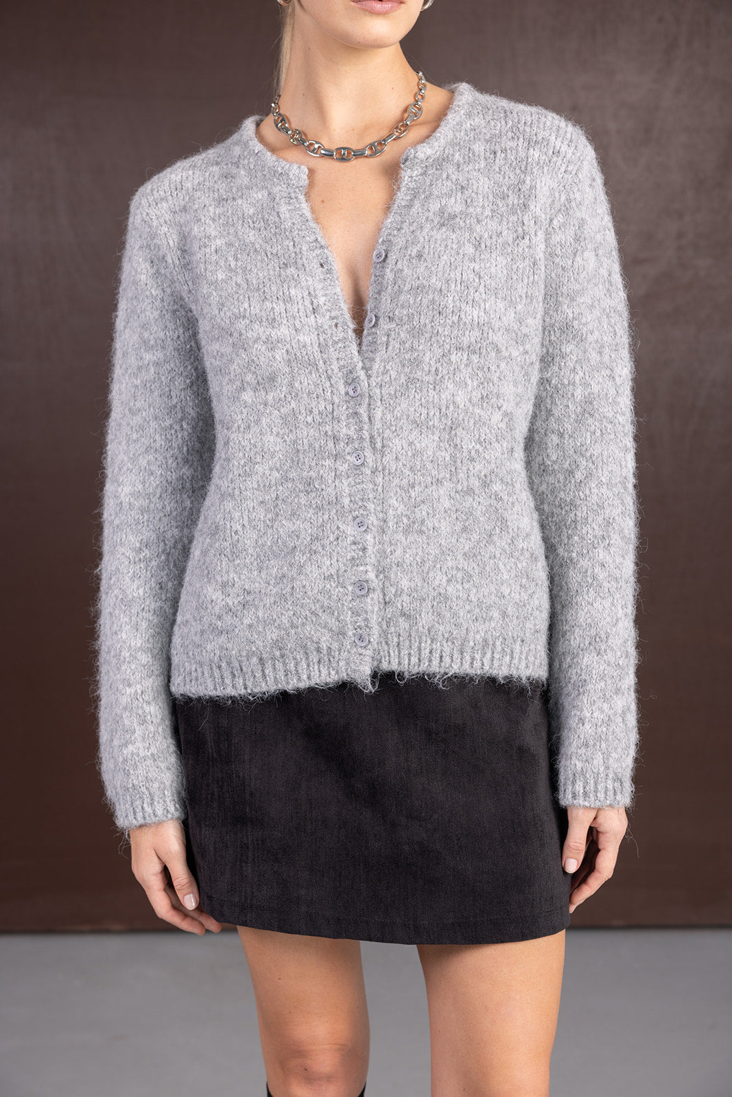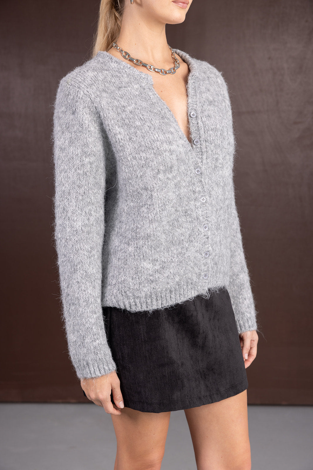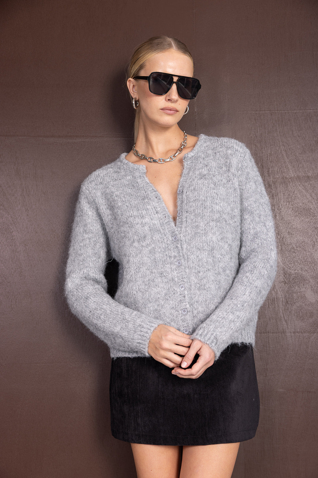 קרדיגן צמר רך למגע, בעיצוב קלאסי עם מפתח וי עדין וכפתרה קדמית. מגיע בגזרה מחמיאה ומעוגלת, המעניקה מראה אלגנטי אך נינוח. המרקם הפלומתי מוסיף תחושת חמימות ויוקרה,