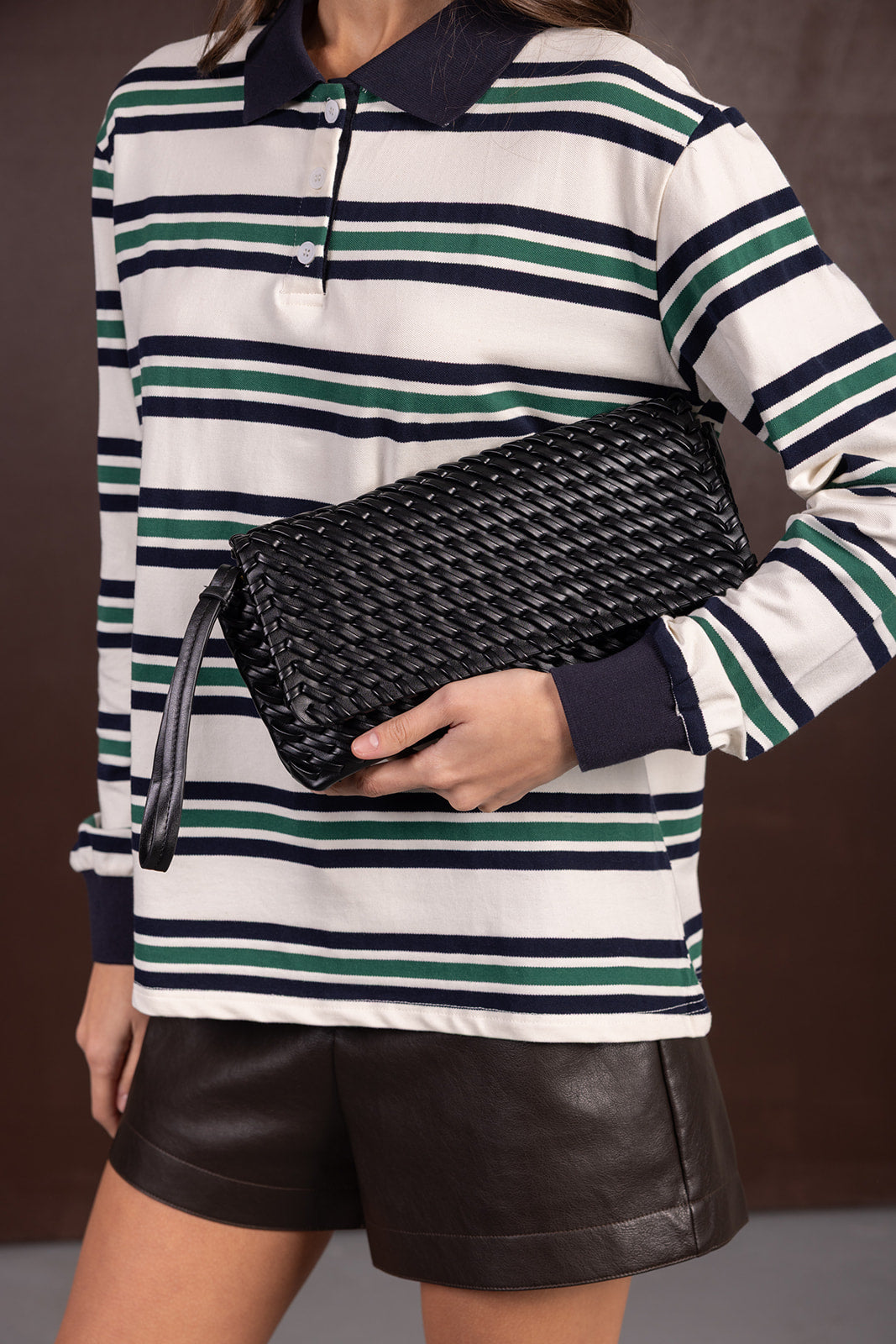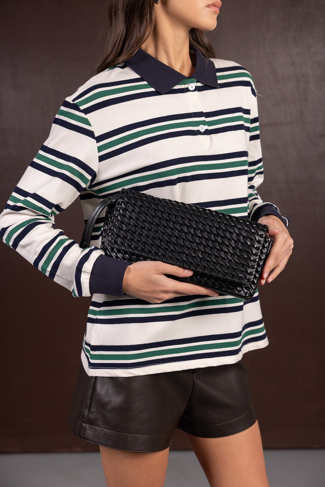 תיק קלאץ' קלוע עשוי דמוי עור איכותי. בשילוב רצועת נשיאה קצרה לשדרוג לוק ערב ורצועת נשיאה ארוכה לשדרוג לוק יום יומי.