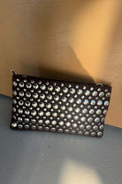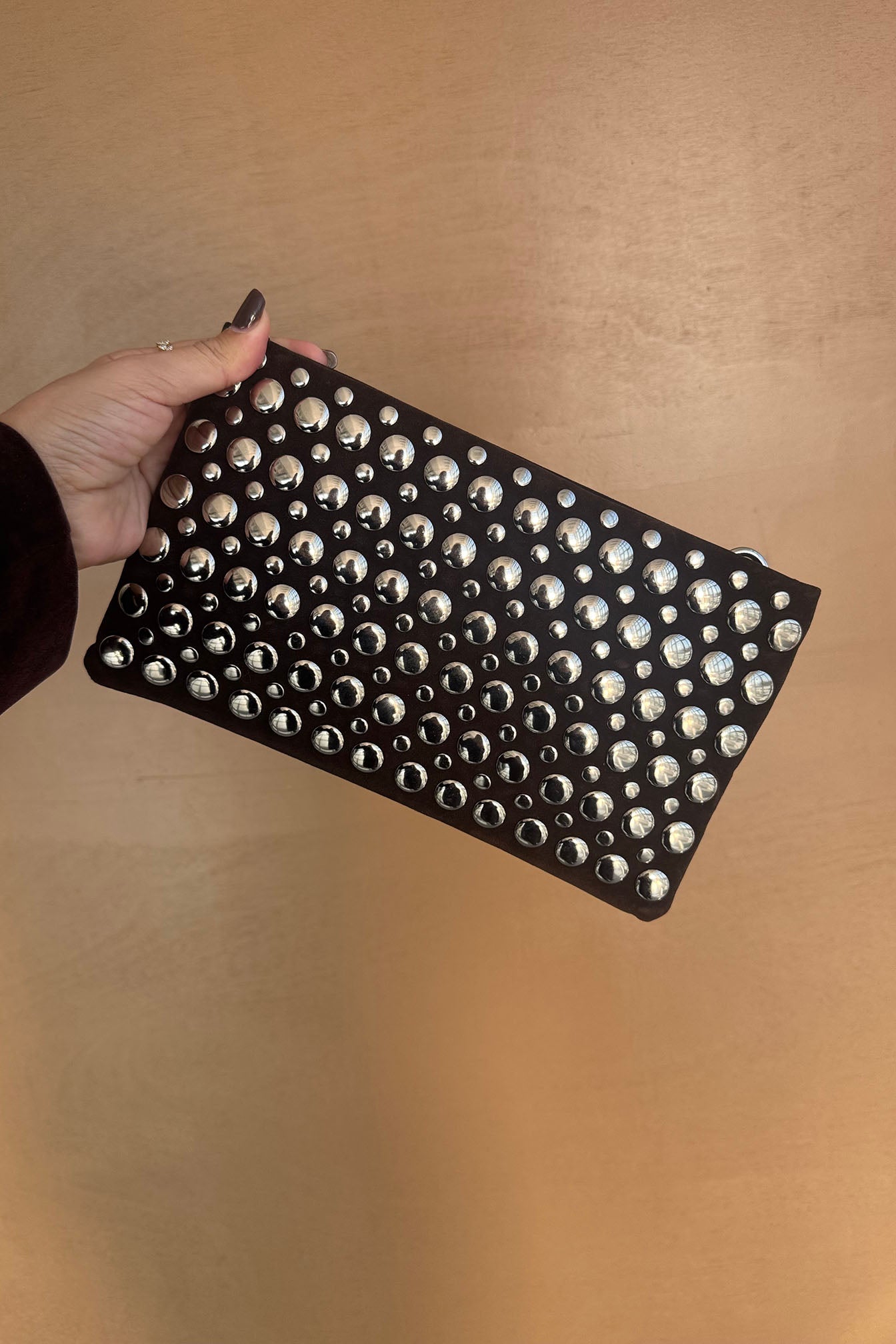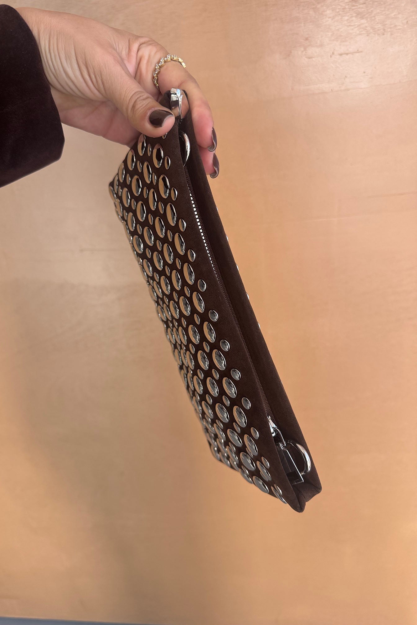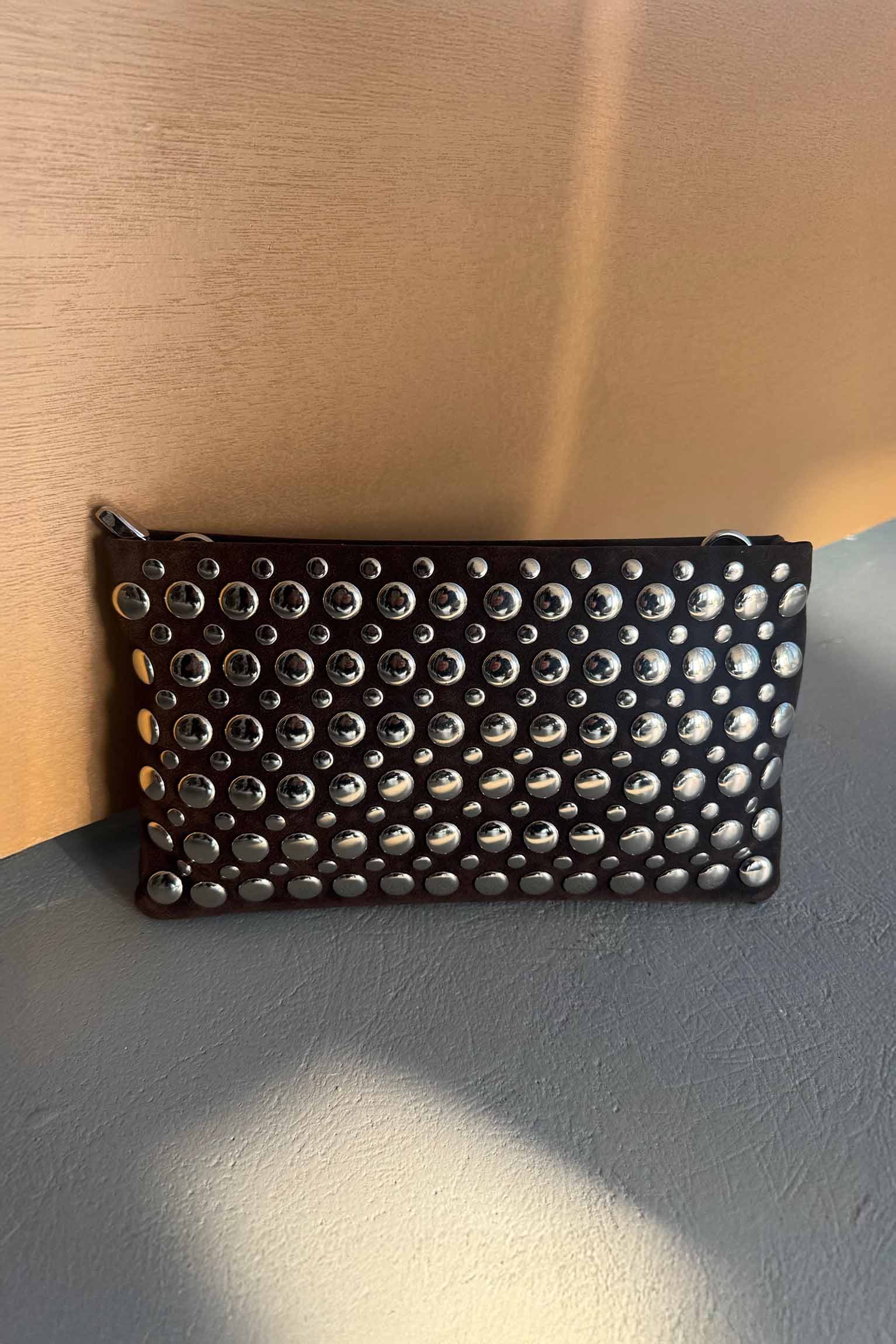תיק ניטים קלאץ' חום, נוח לאחיזה. בתיק יש תא פנימי אחד קטן עם ריצרץ׳