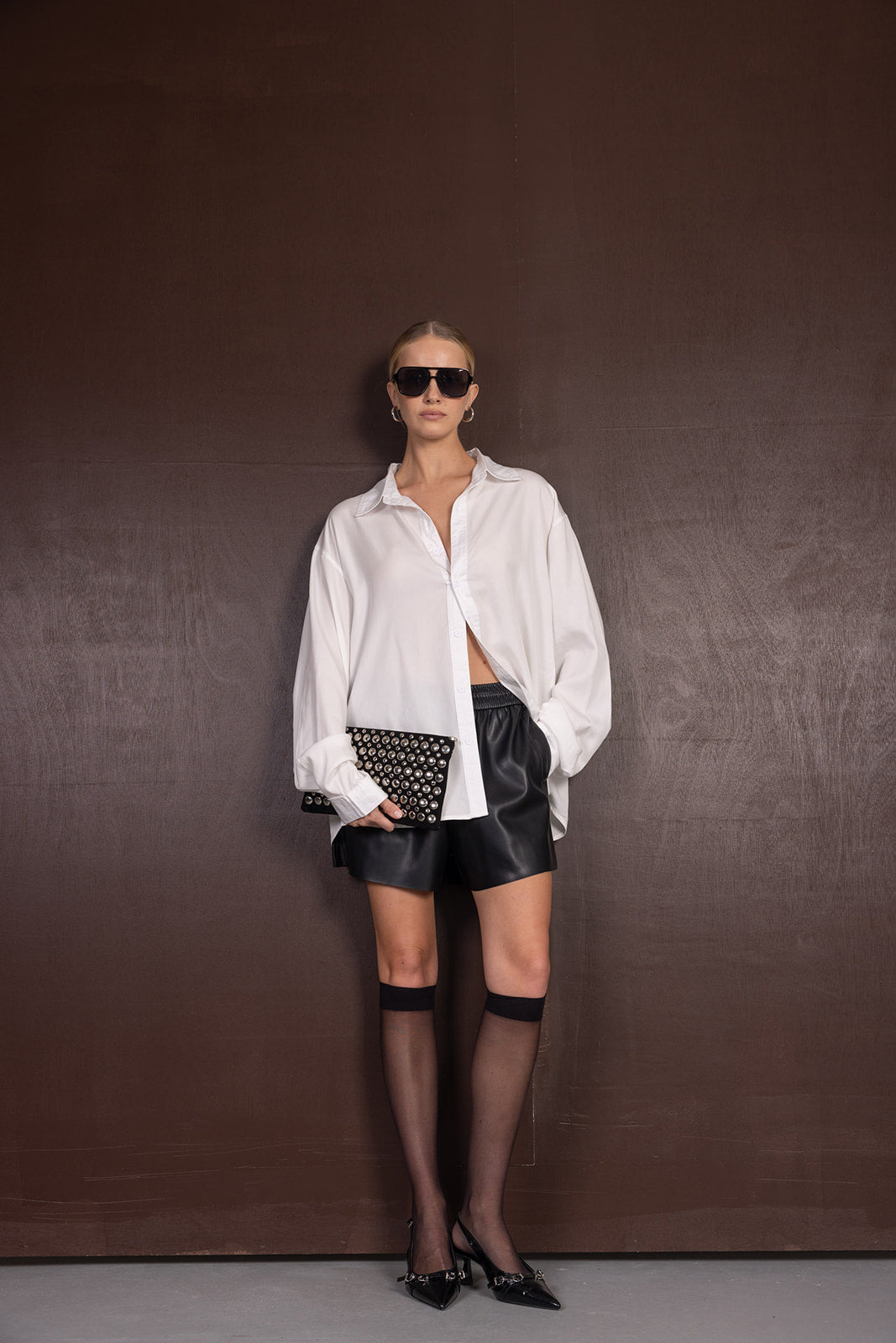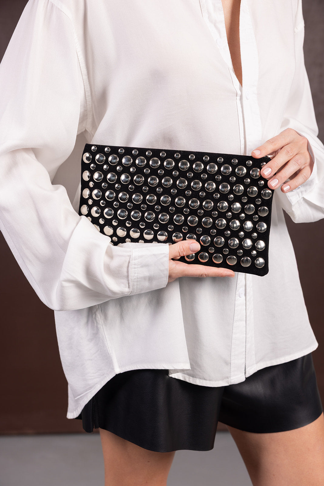 תיק ניטים קלאץ' שחור, נוח לאחיזה. בתיק יש תא פנימי אחד קטן עם ריצרץ׳