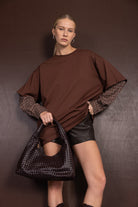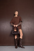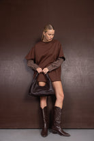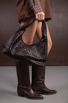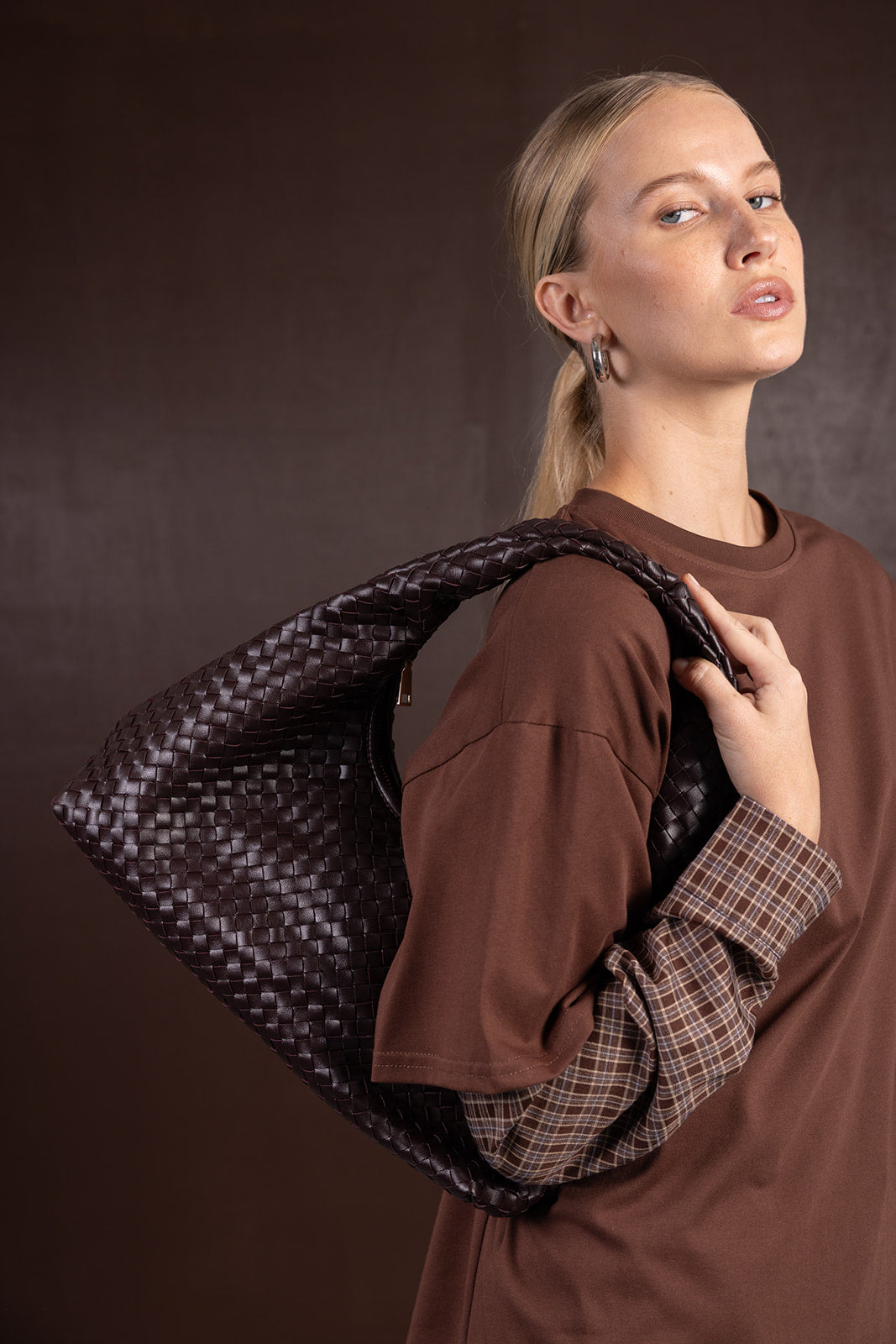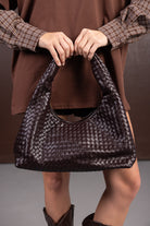 תיק כתף בעיצוב קלוע דמוי עור, בגוון חום עמוק. בעל ידית רחבה ונוחה לאחיזה עם טקסטורה עשירה וגימור יוקרתי.
