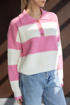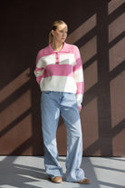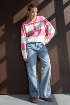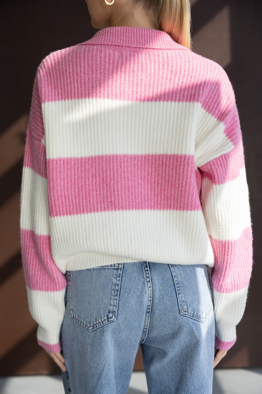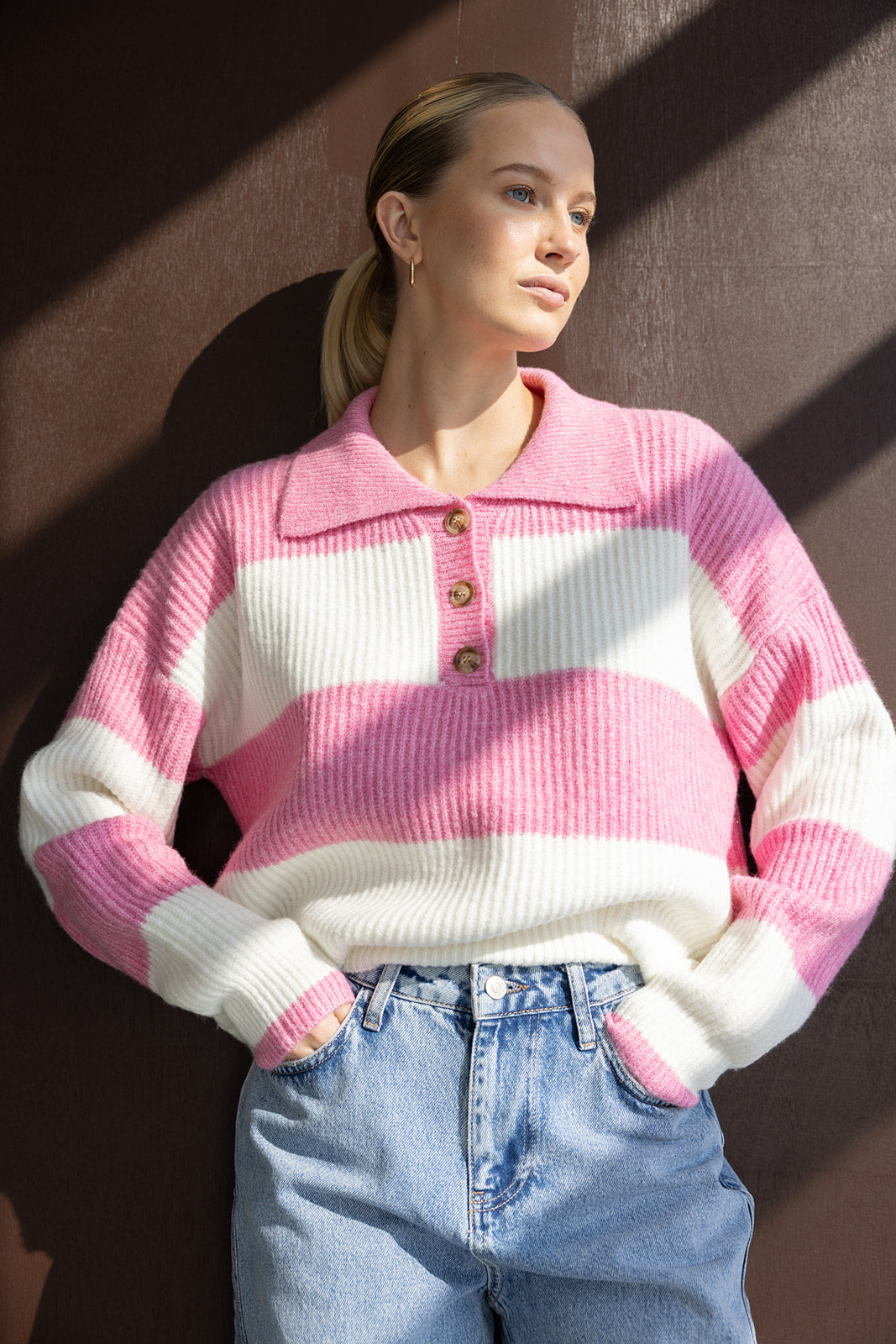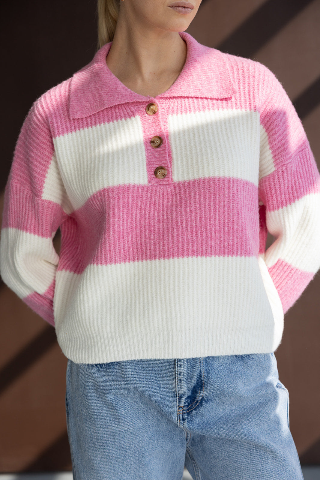 סריג רך ונעים למגע בעיצוב פסים רחבים, עם צווארון פתוח וסגירת כפתורים חלקית. גזרה נינוחה ואלגנטית.