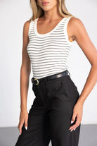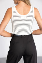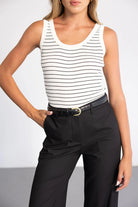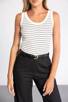 גופיית סריג עם מפתח צוואר עגול, בשילוב דוגמת פסים לרוחב הגופייה. גזרה צמודה ונוחה שמחמיאה לגוף.
