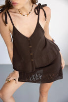 טופ קשירה עשוי בד סריג נעים ביותר, בשילוב מחשוף וי מחמיא, כפתורים וסיומת מלמלה.