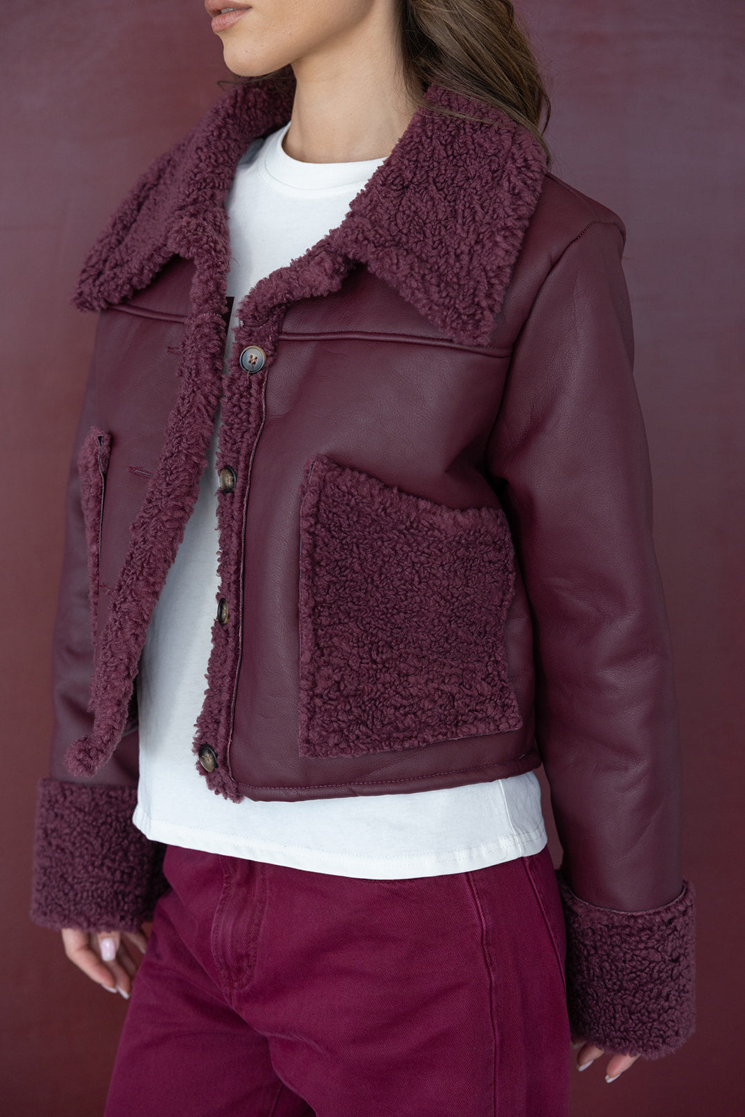 מעיל דמוי עור בצבע בורדו החם של העונה, בגזרה מעט קרופ מחמיאה ביותר. בשילוב בטנה מחממת, זוג כיסים קדמיים וכפתורים לאורך המעיל.