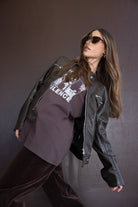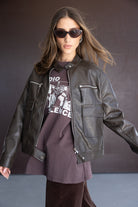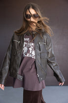 ג'קט עשוי דמוי עור במראה קלאסי, בשילוב ארבעה כיסים, כפתורים ורוכסן.