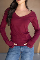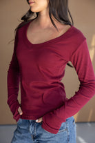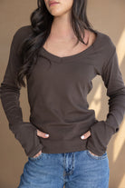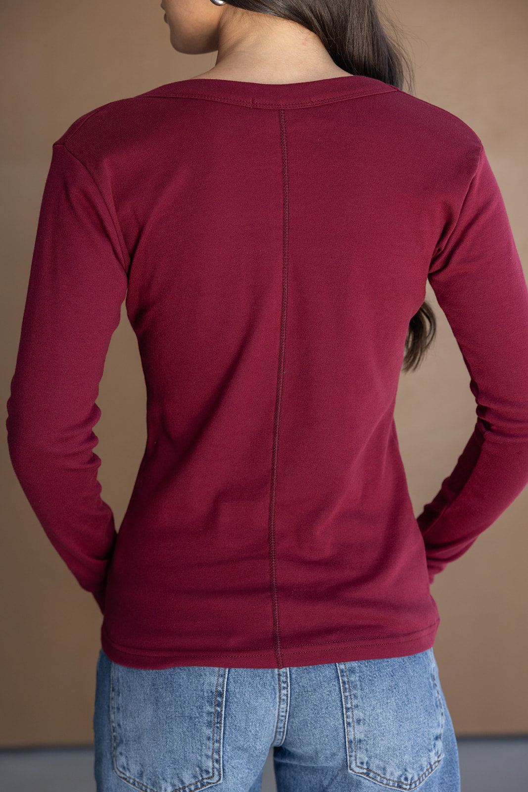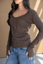 חולצת בייסיק עם צווארון וי עמוק ומחמיא עם שילוב של שרוולים ארוכים וחור בסיומת לכפפה ;)
