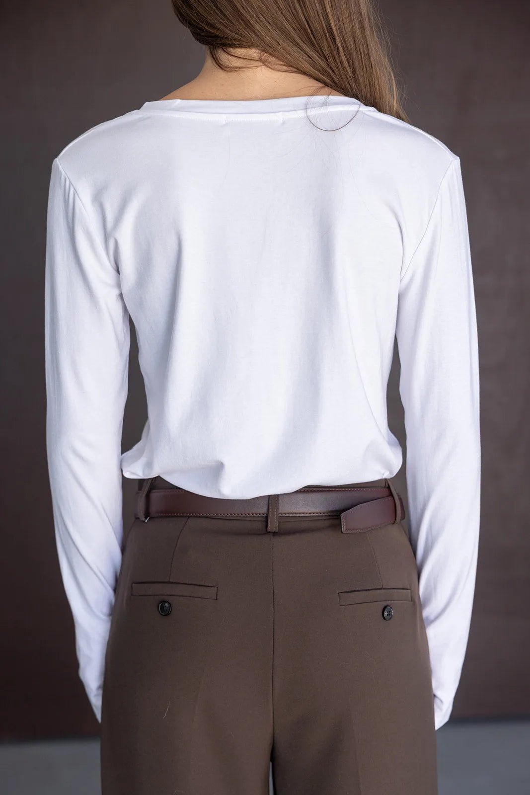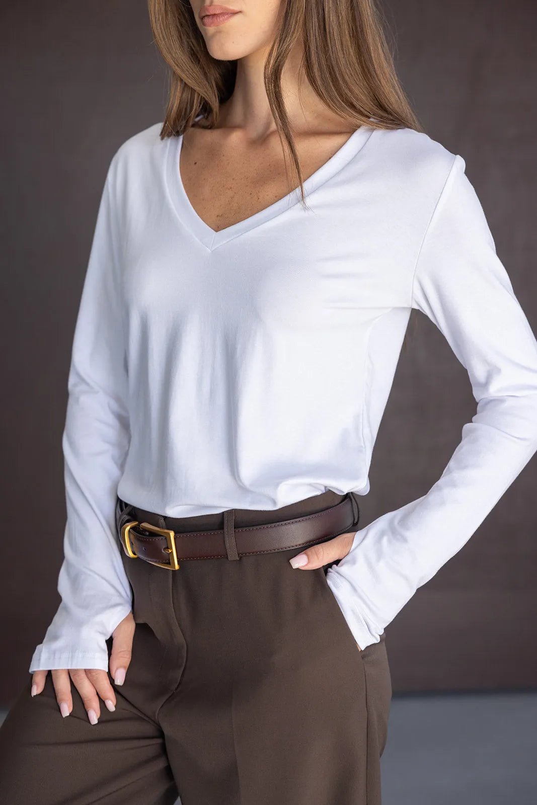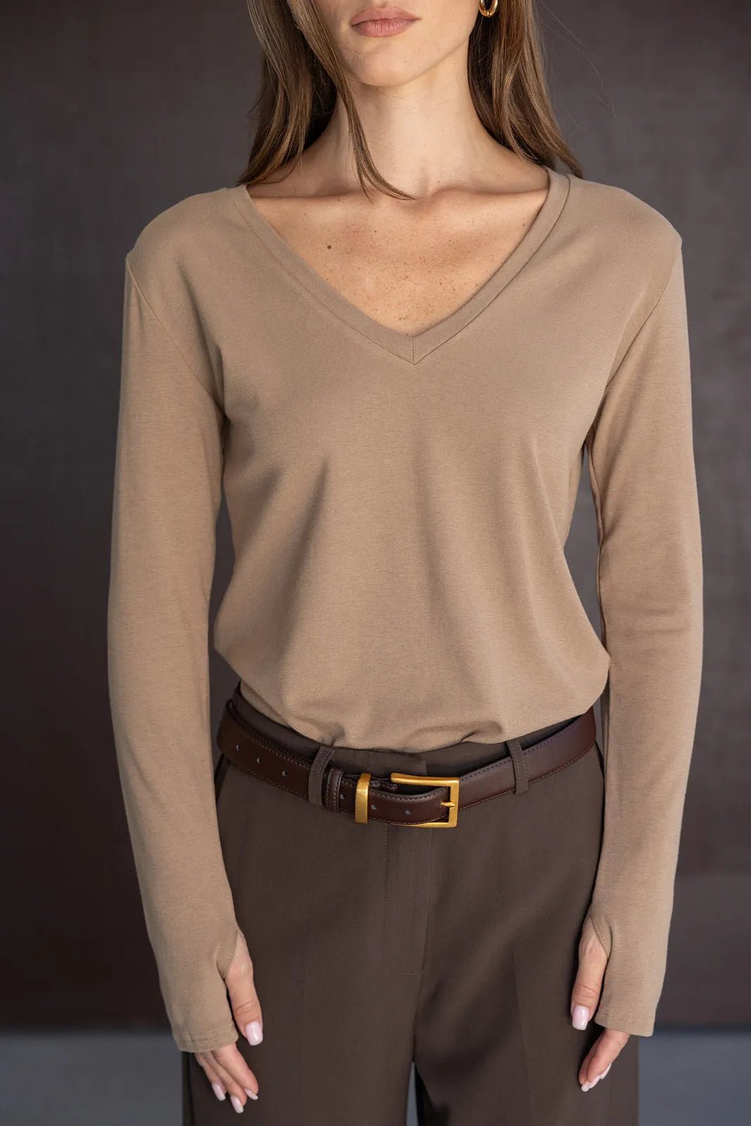 חולצת בייסיק איכותית ונוחה ביותר, בשילוב צווארון וי פתוח ושרוולי כפפה.