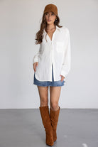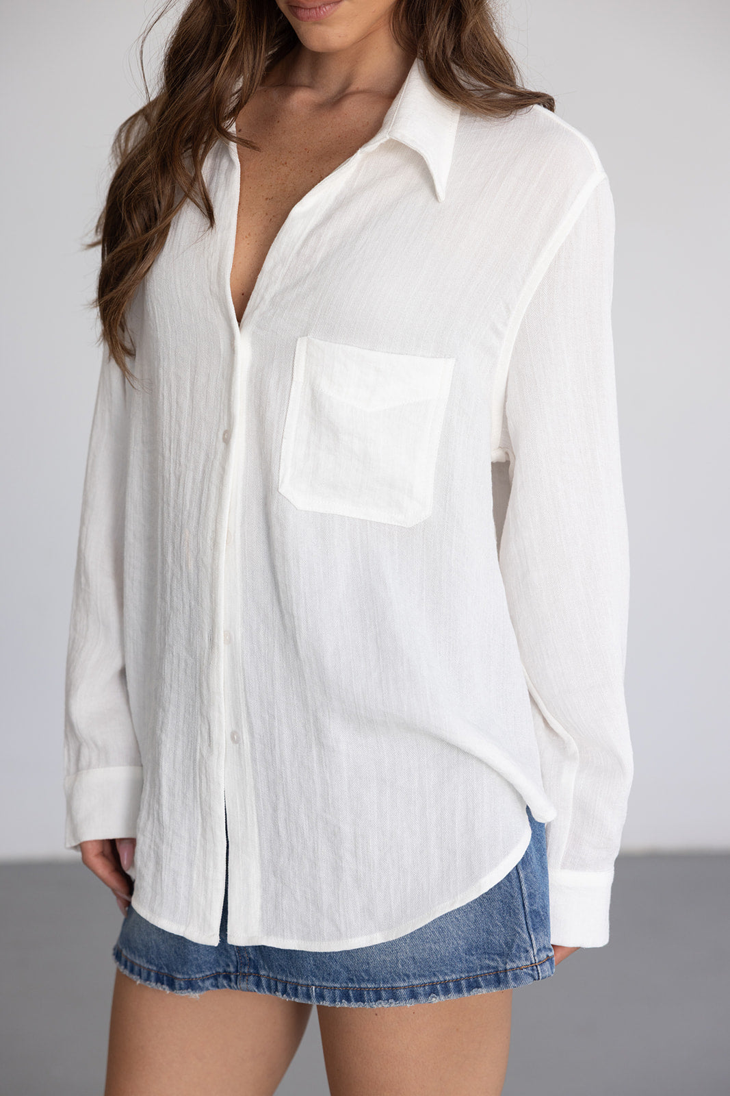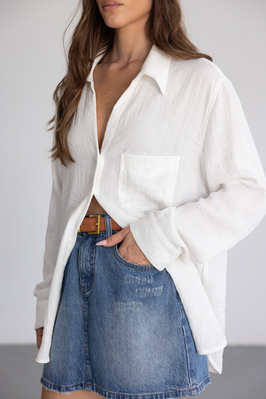 חולצת פשתן מכופתרת ארוכה בגזרה משוחררת, עשויה מבד נעים ונושם. בעלת שרוולים ארוכים, כיס בחזית וסגירת כפתורים בחלק הקדמי. מפתח וי עדין וצווארון קלאסי
