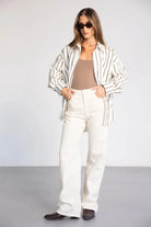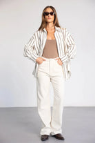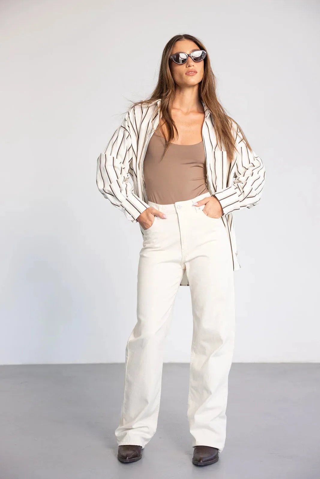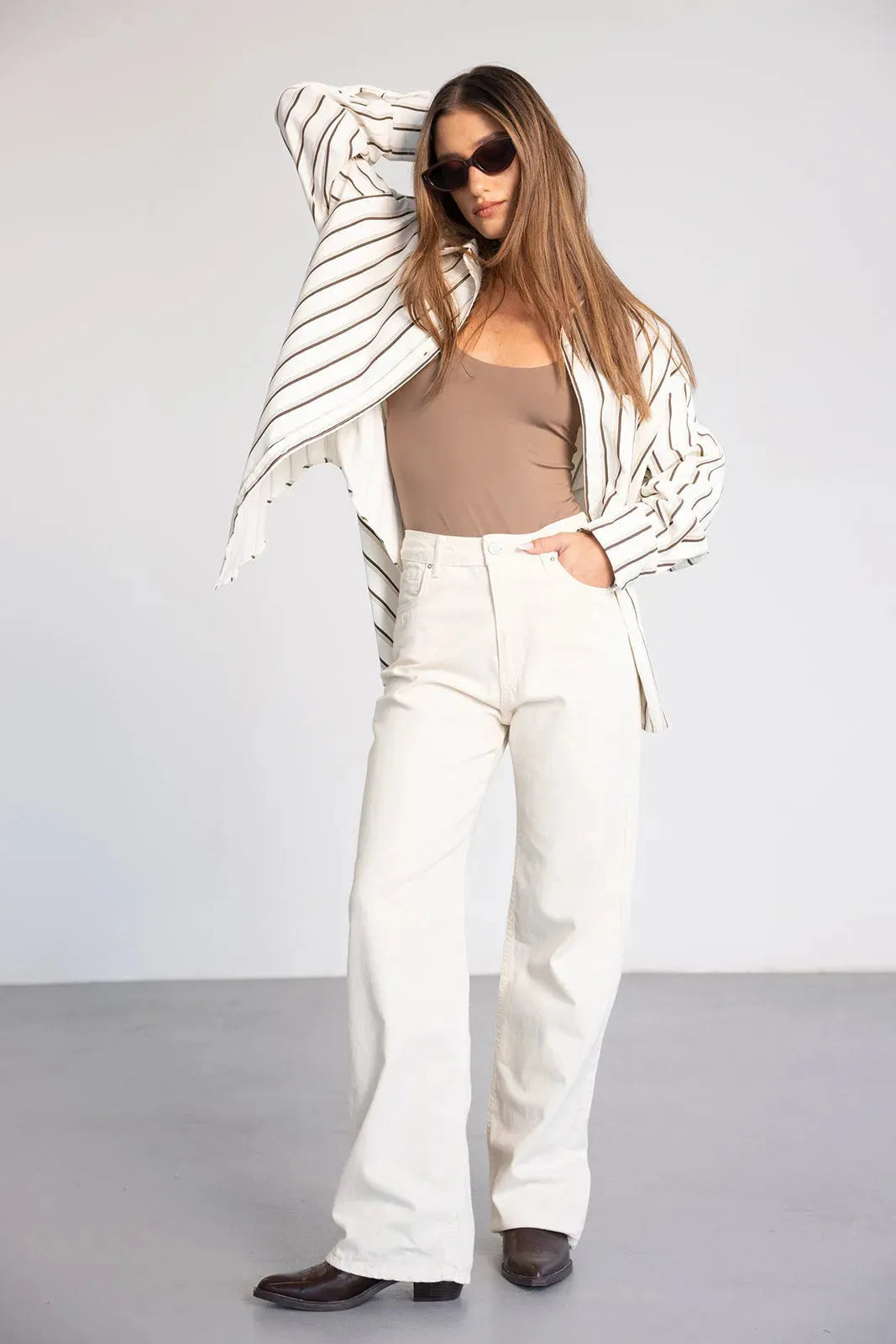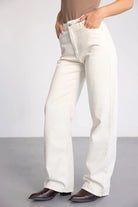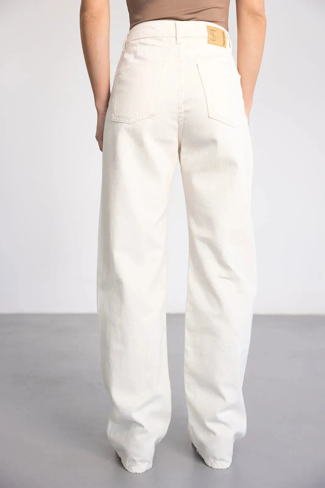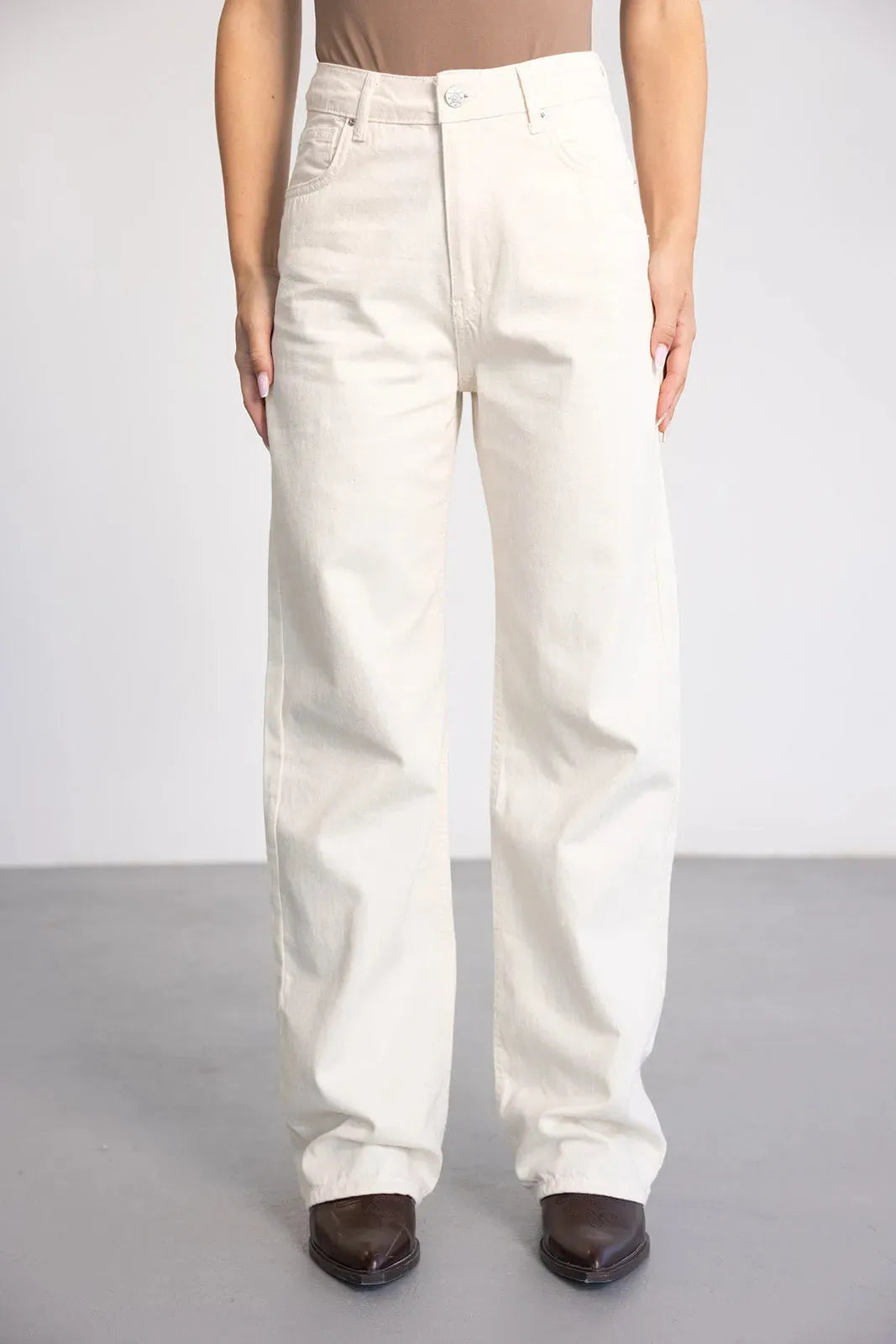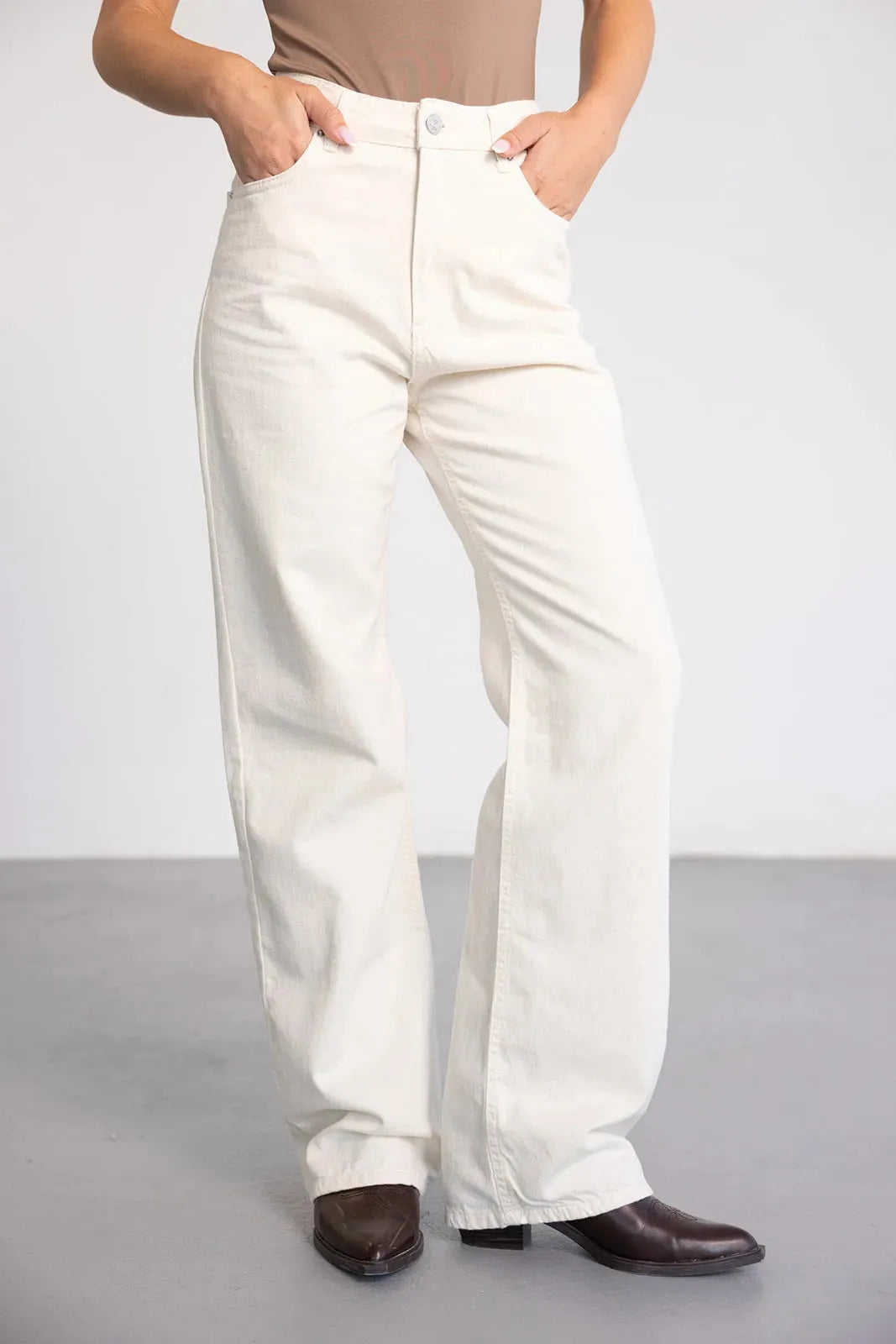 מכנס ג'ינס בגזרה רחבה מעט, בעל שני כיסים קדמיים ושני כיסים אחוריים.