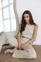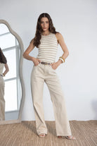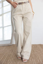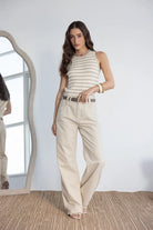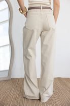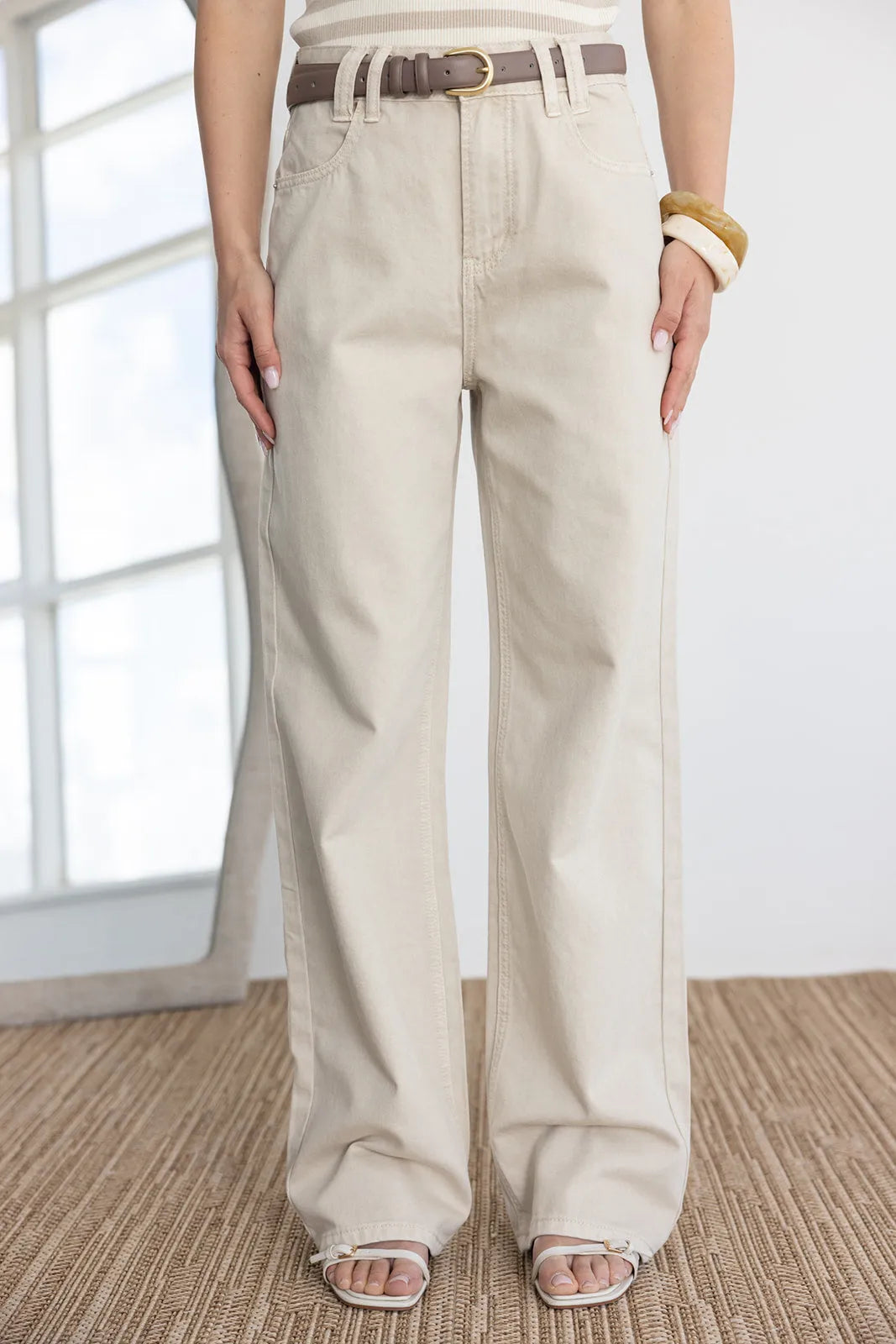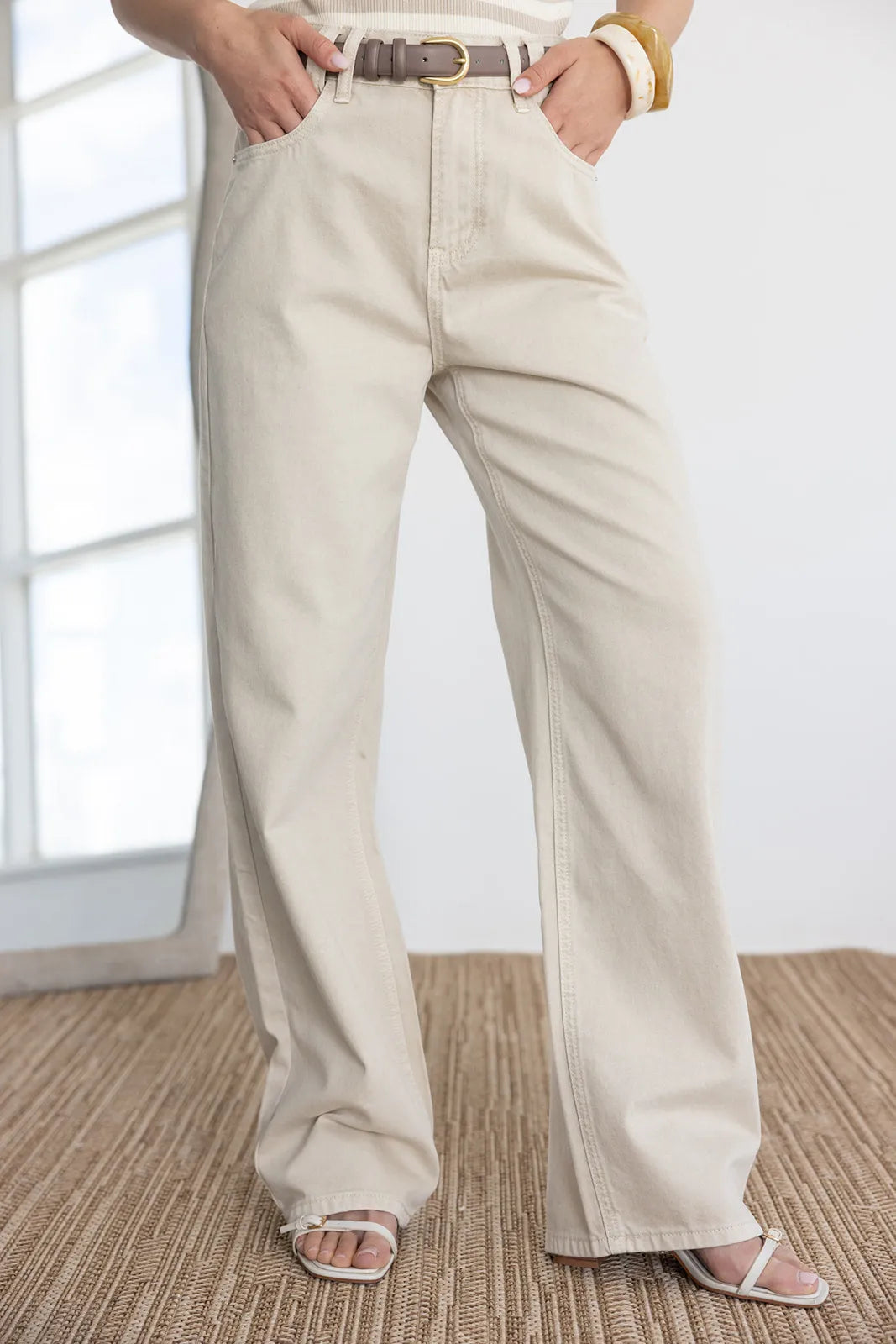 מכנס ג'ינס בצבע בז', בגזרה ישרה ומחמיאה. בשילוב שני כיסים קדמיים ושני כיסים אחוריים.