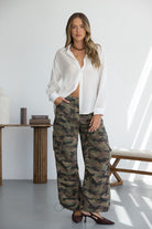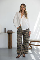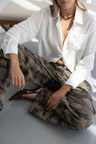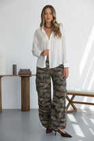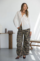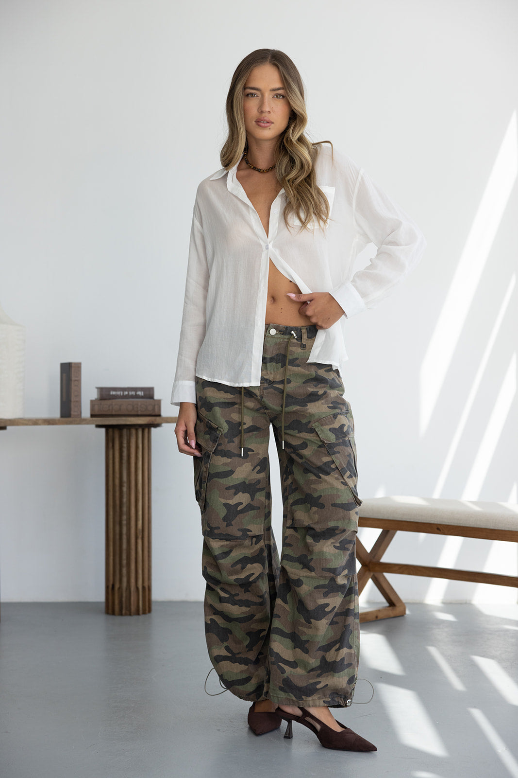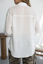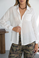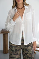 חולצה מכופתרת לבנה נוחה וקלילה, בשילוב כיס קדמי וצווארון.